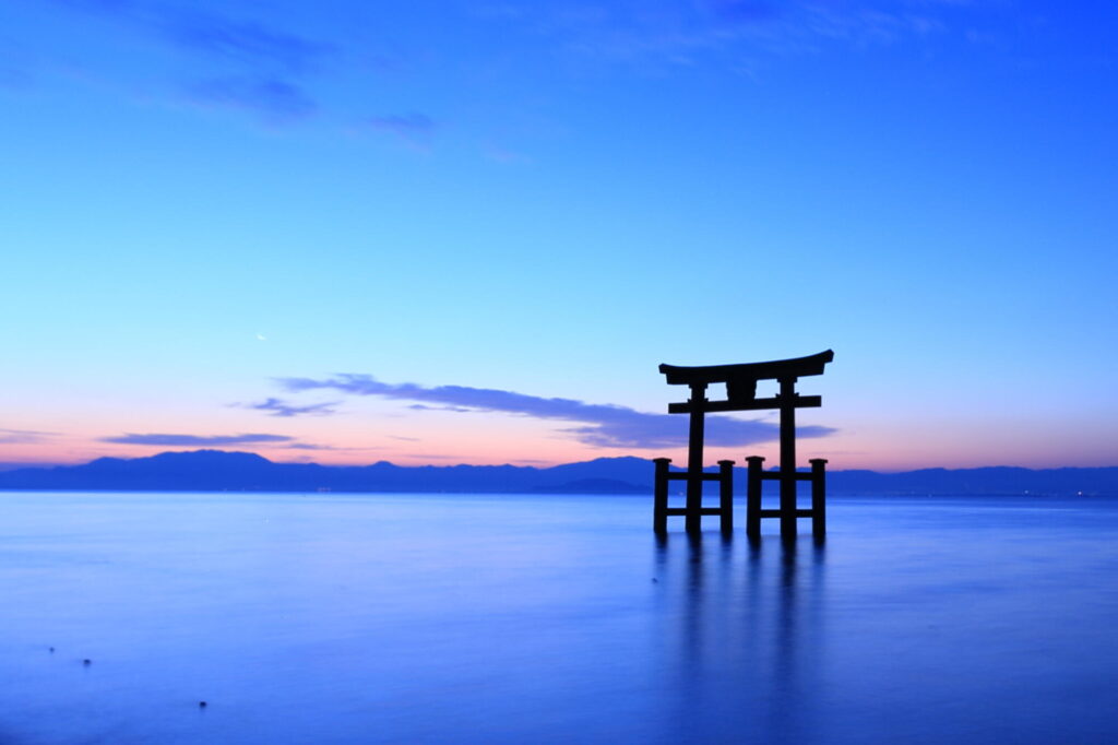 湖中に朱塗りの大鳥居があり、国道161号をはさんで社殿が鎮座します。社名のとおり、延命長寿・長生きの神様として知られ、また、縁結び・子授け・開運招福・学業成就・交通安全・航海安全など、人の営みごと、業ごとすべての「導きの神」でもあります。高島市の代表的な人気スポットです。