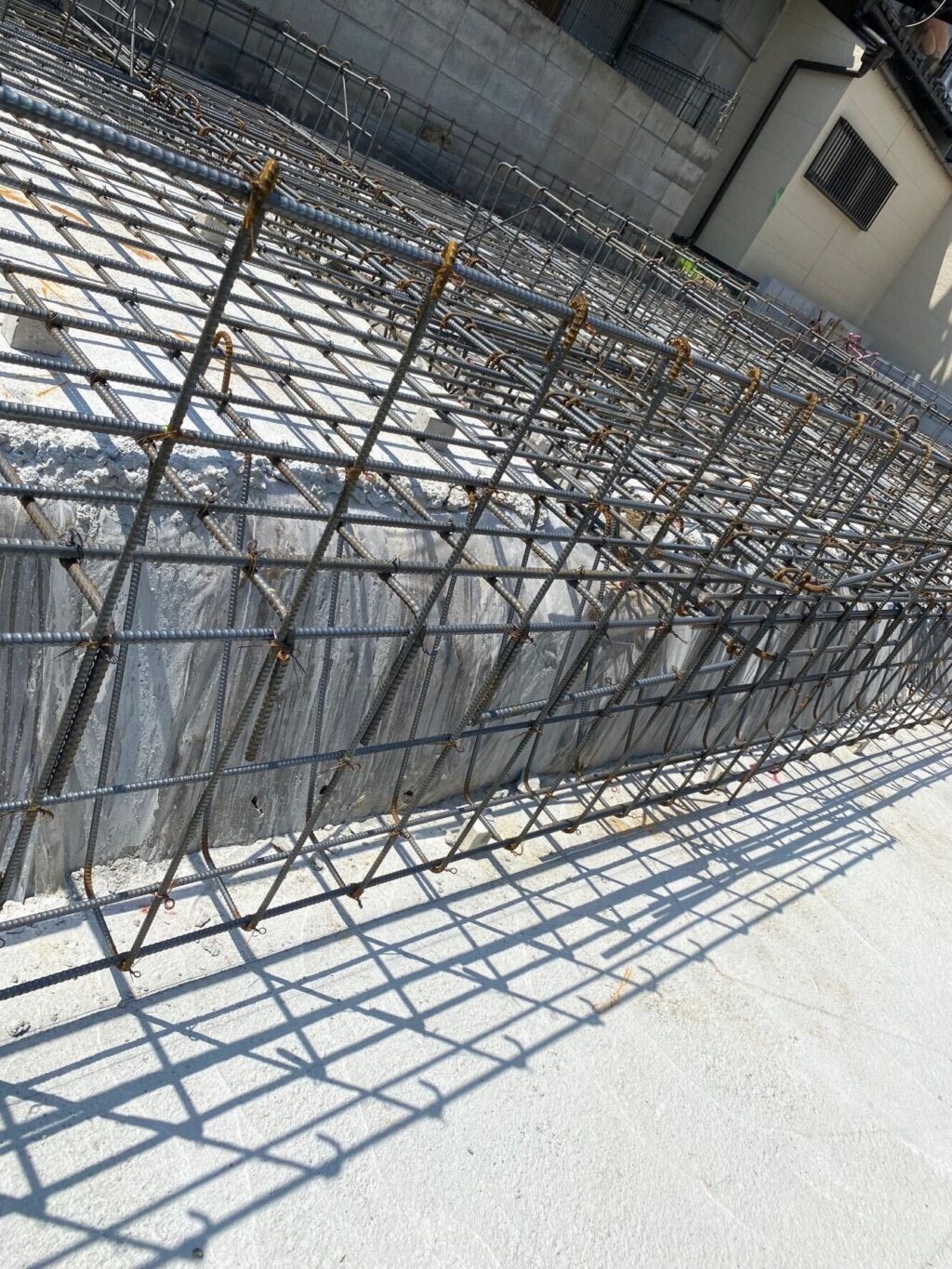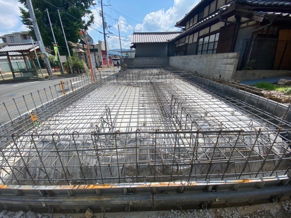 掘削工事後に砕石を敷き、捨てコンクリートを流し配筋まで進みました。基礎は鉄筋コンクリートで出来ています。格子状に鉄筋が等間隔でとても綺麗に仕上げて頂いています。