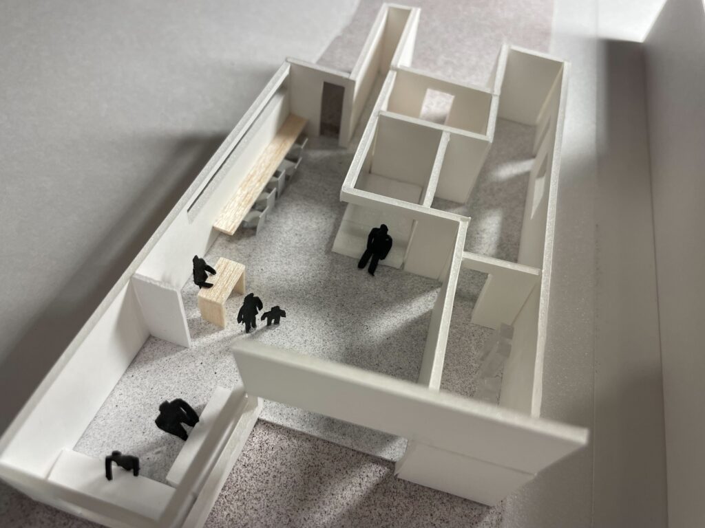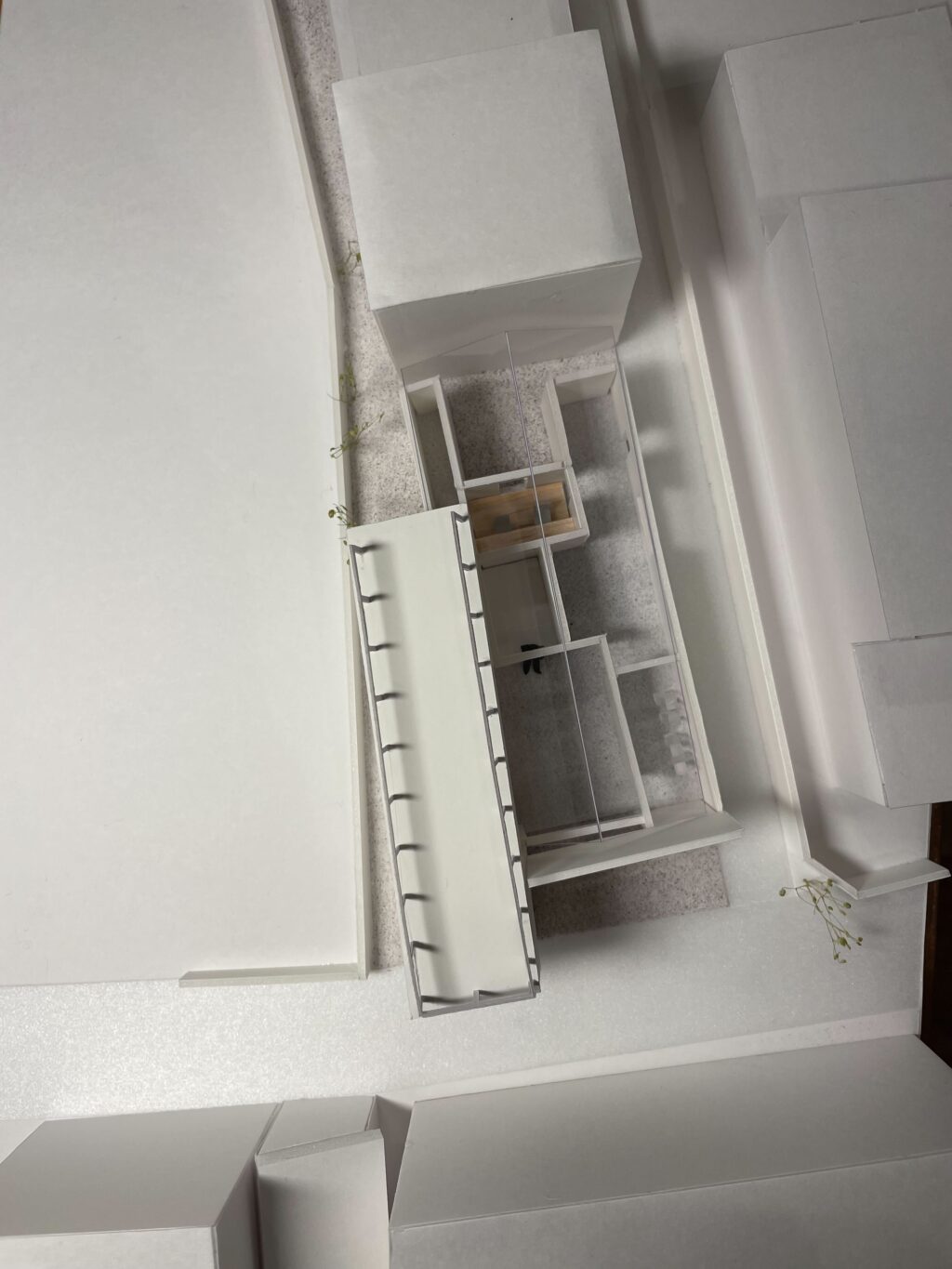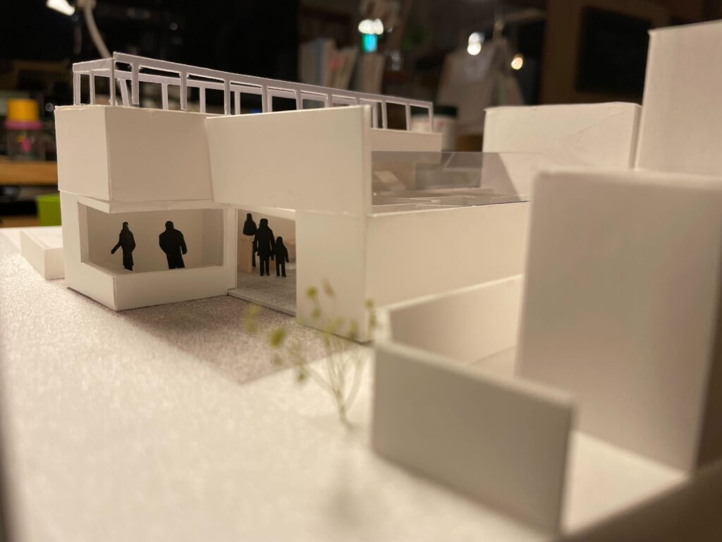 通りからの見え方や人の流れを検討するために、今回は周辺を含めた模型も作成して考えていました。
