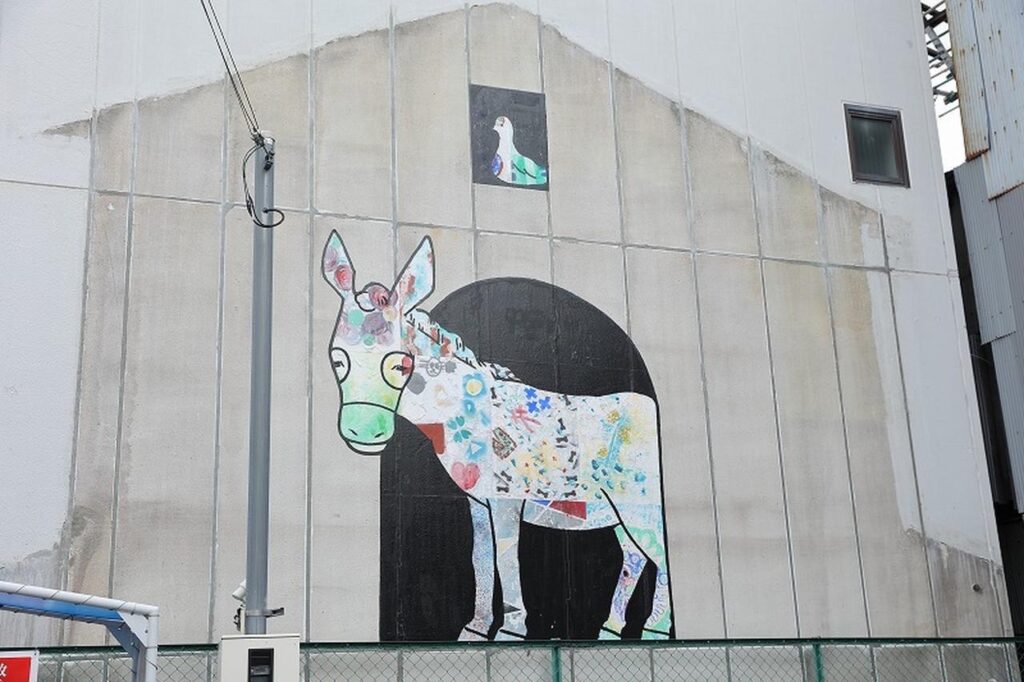 空き家の壁、工場の塀、店舗のシャッターなど絵だけではなく立体作品も点在しています。