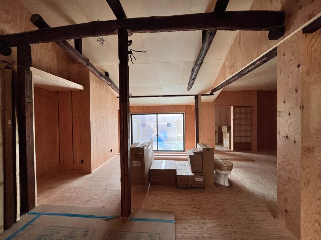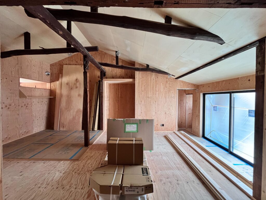 既存の構造材は表しとしていますが、周りの素材とも上手くマッチしました。間仕切り壁で区画されていた空間がつながることで明るくて広いLDKになりそうです。