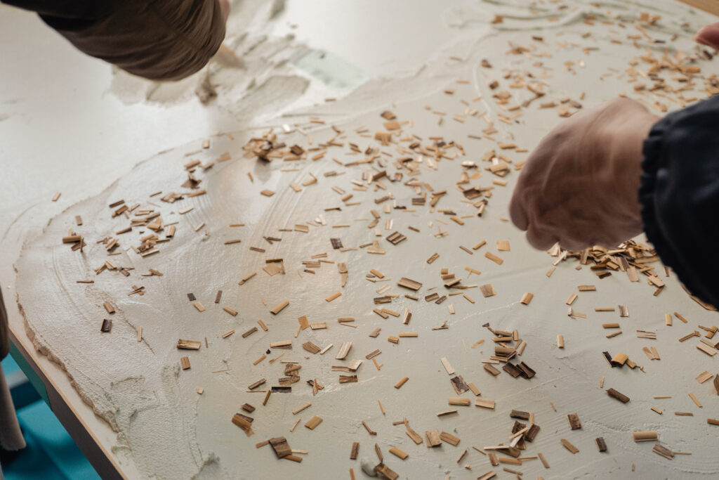 珪藻土にヨシを混ぜたり、モルタルに混ぜたりと枚方の地域資源由来の素材を用いたアイデアです。