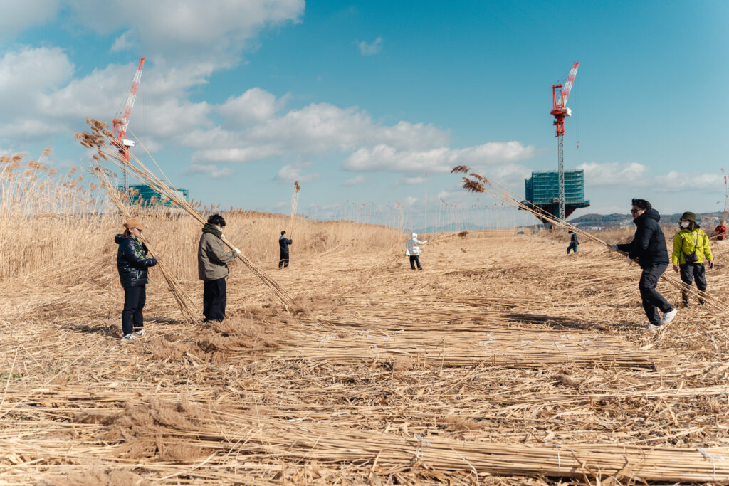 そして、すでに枚方を拠点にこの「ヨシ」を活用した事業をされているアトリエMAYさんと繋がり、今回のヨシ刈りの活動に参加させていただくことになりました。アトリエMAYさんのHPを見ていただくとわかると思いますが、この「ヨシ」で繊維や糸、紙に加工し、さまざまな製品を開発されると共に、環境保全と地域文化の継承をされています。
