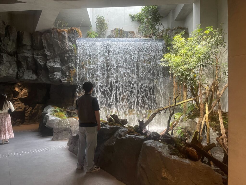建物の中に入ると、いきなり滝が出迎えてくれます。光の差し込む角度や自然の表現の仕方がなんとも美しく芸術的です。また、それ以上に滝の水の流れる音が心地よさを生みだし、見る人の心を完全に魅了します。私は水の流れる音が大好きなので、思わず聴き入ってしまいました。