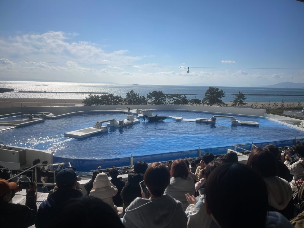 あえて死角をつくりだして曲がった先が見えないようにデザインする。切り返しを複数つくったり、人の目線を上下左右に向ける仕掛けが面白かったです。天気も良かったので終盤にオルカショーを観に行きました。海をバックにしたこのロケーションも見る人を癒す絶景でした。