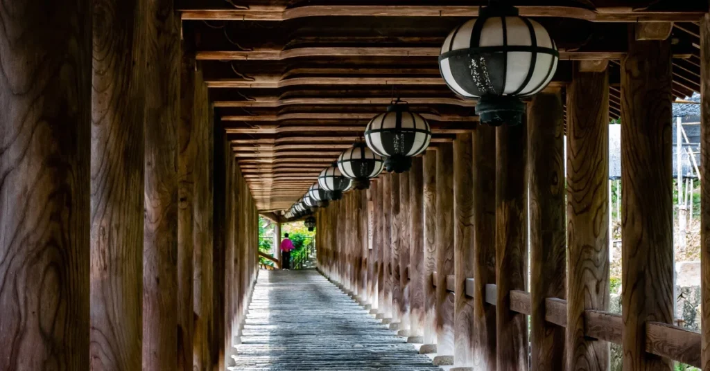 また、本堂へと続く登廊は全長約200mに及び、399段の石段を屋根付きの回廊で上っていきます。
