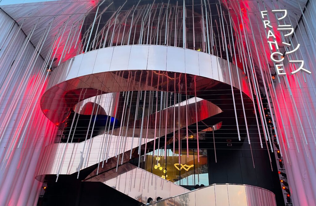 フランスパビリオンの建築デザインは、神秘的で開放的な劇場のようなエントランスが特徴で、「愛の讃歌」をテーマにフランスの文化や芸術など多様な展示がされていました。