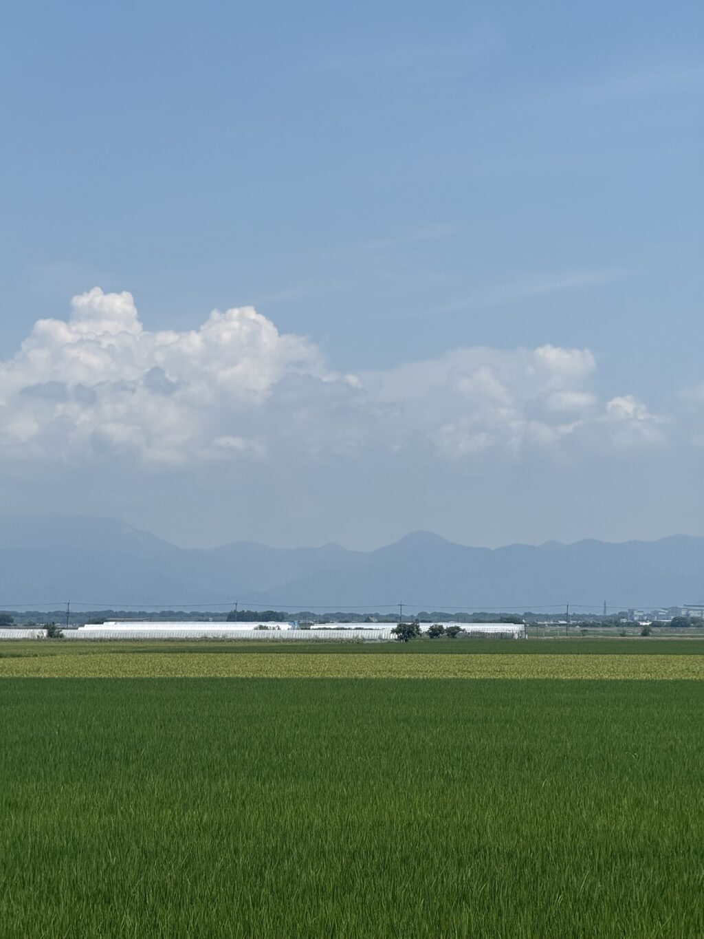 特に琵琶湖の北側では、大きくふわふわとした白い入道雲が空いっぱいに広がり、その影が田んぼを柔らかく覆う様子が印象的です。