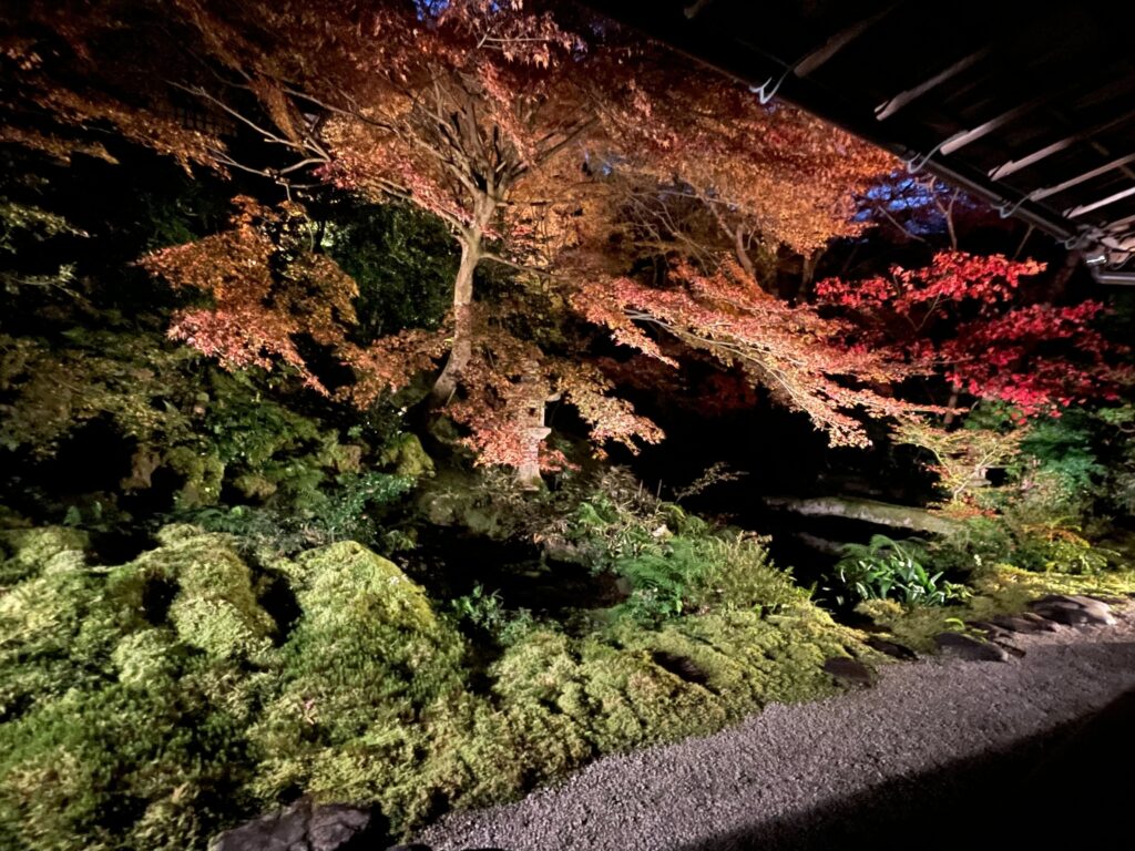 瑠璃光院の建築は、数奇屋造りの書院が中心で、茶道の大工・中村外二が手がけました。自然光の取り込み方や配置を計算した設計が特徴で、書院二階の黒漆塗りの机に庭の紅葉が映り込む「反射の演出」が有名です。