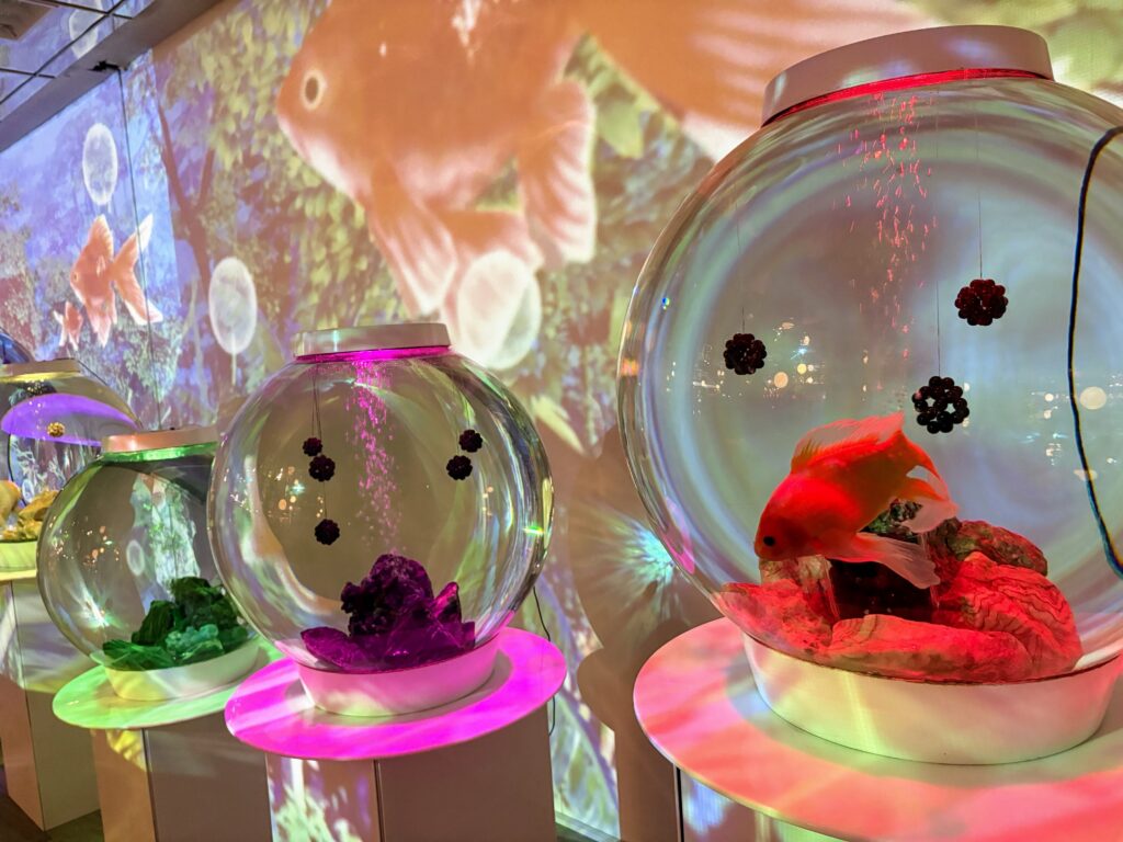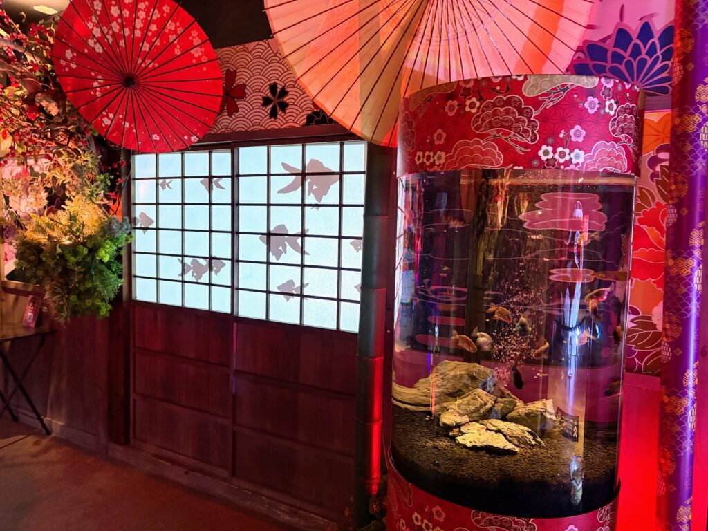 奈良は日本三大金魚の産地のひとつとして知られています。今回訪れた『金魚ミュージアム』は、アートとエンターテインメントを融合させた体験型の施設です。プロジェクションマッピングやフラワー、テラリウム、ミラーボールなどの演出が施され、「空間全体を楽しむこと」をコンセプトとした幻想的な世界が広がっていました。