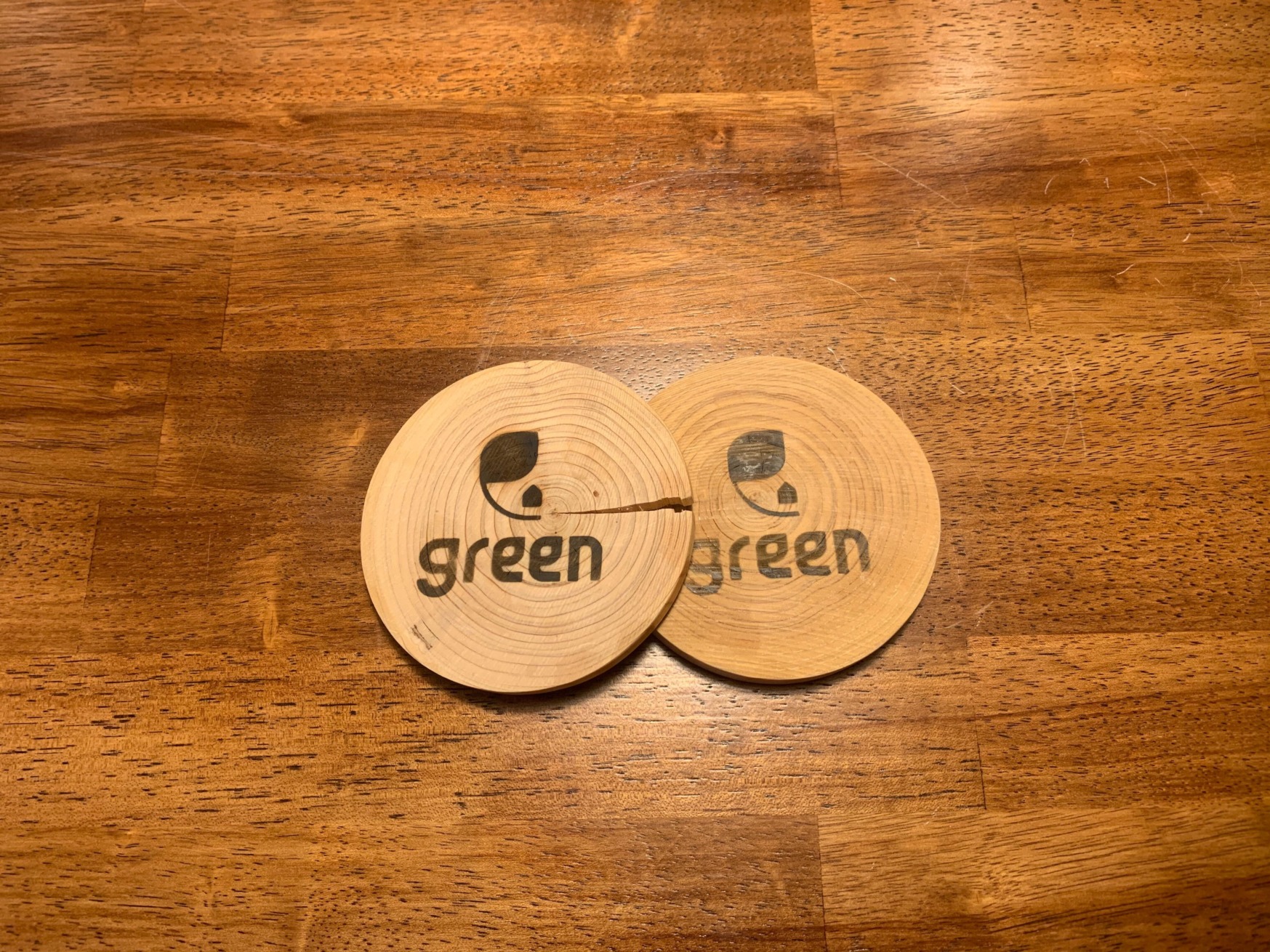 ヒノキの丸太を薄くスライスして、うちのロゴを焼き印を入れてます。