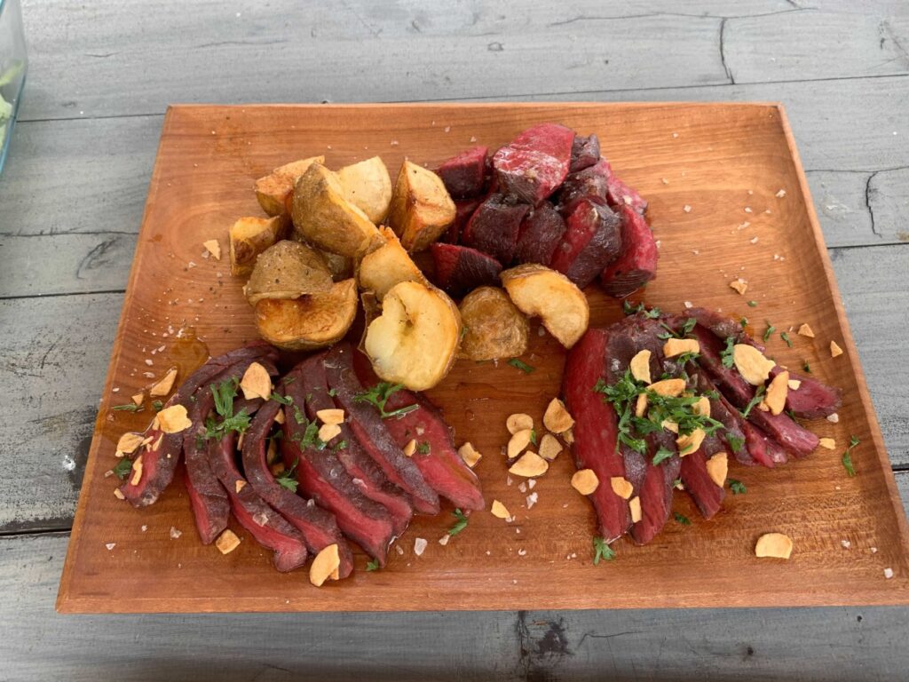 鹿肉を低温調理し、ガーリックなどのソースがかかっています。