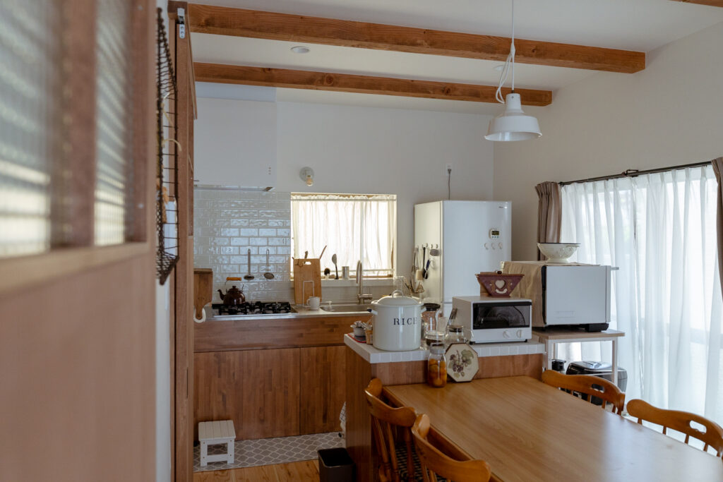 キッチンは、ナチュラルカラーのタイルと、濃いめの木の色も可愛らしくマッチ。