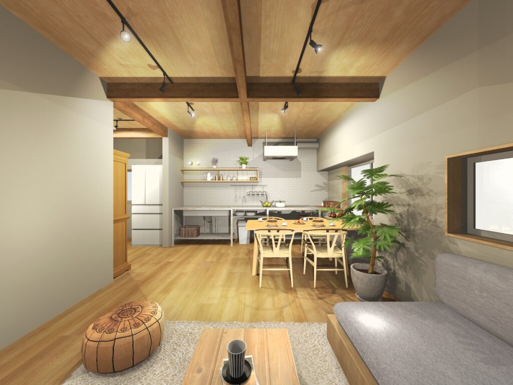 LDKを広く使えるよう、元々1LDKだったお家をLDKに変更し、天井を高くした分、梁を出し板張りとしています。