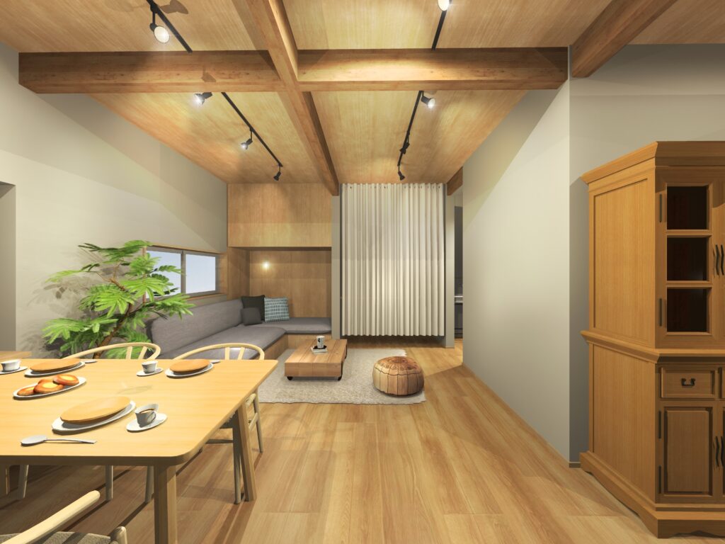 梁を見せる板張り天井は、開放感や梁の木材の温もりを感じられる、より快適で素敵な空間となりました。