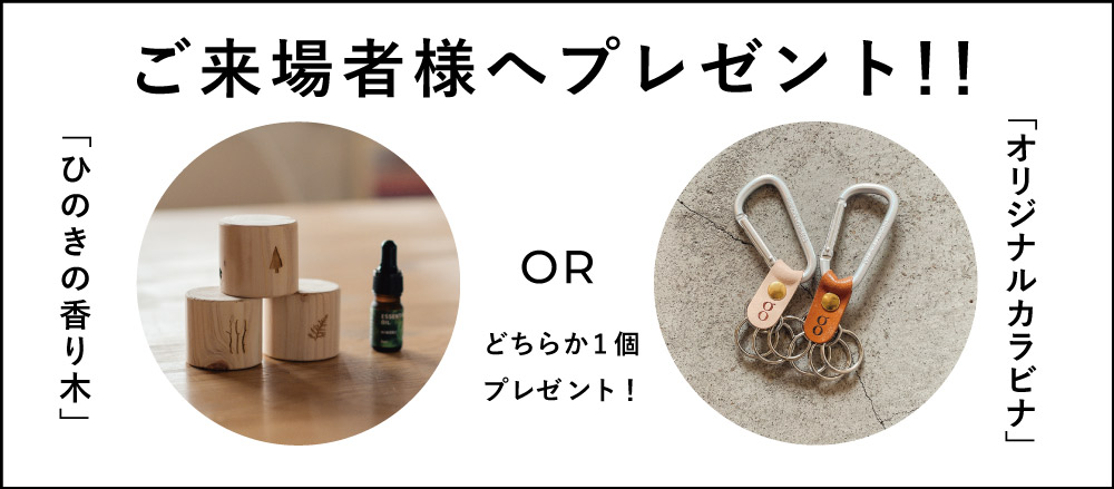 ご来場いただいた方へ「ヒノキの香り木」or「オリジナルカラビナ」のどちらかおひとつお選びいただけます♪