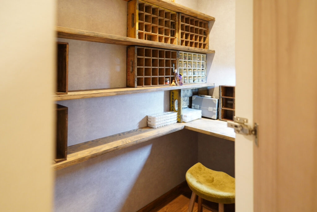 ご夫婦で使える書斎を設計。部屋の真ん中を造作棚で仕切り、空間を緩く仕切りつつ、おこもり感のある空間となりました。