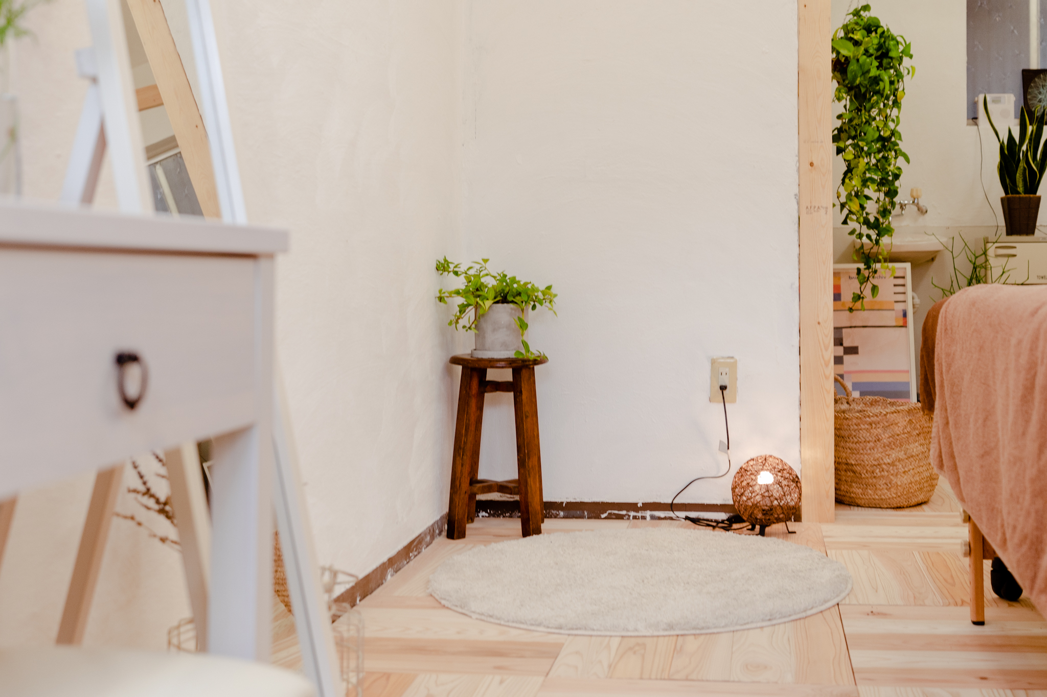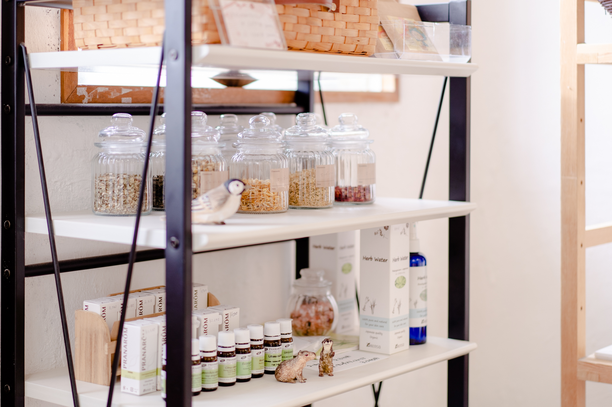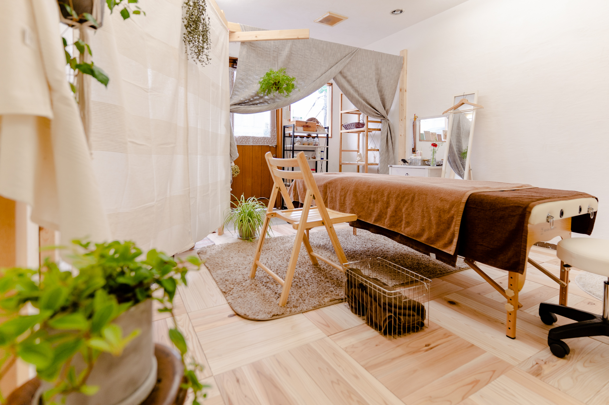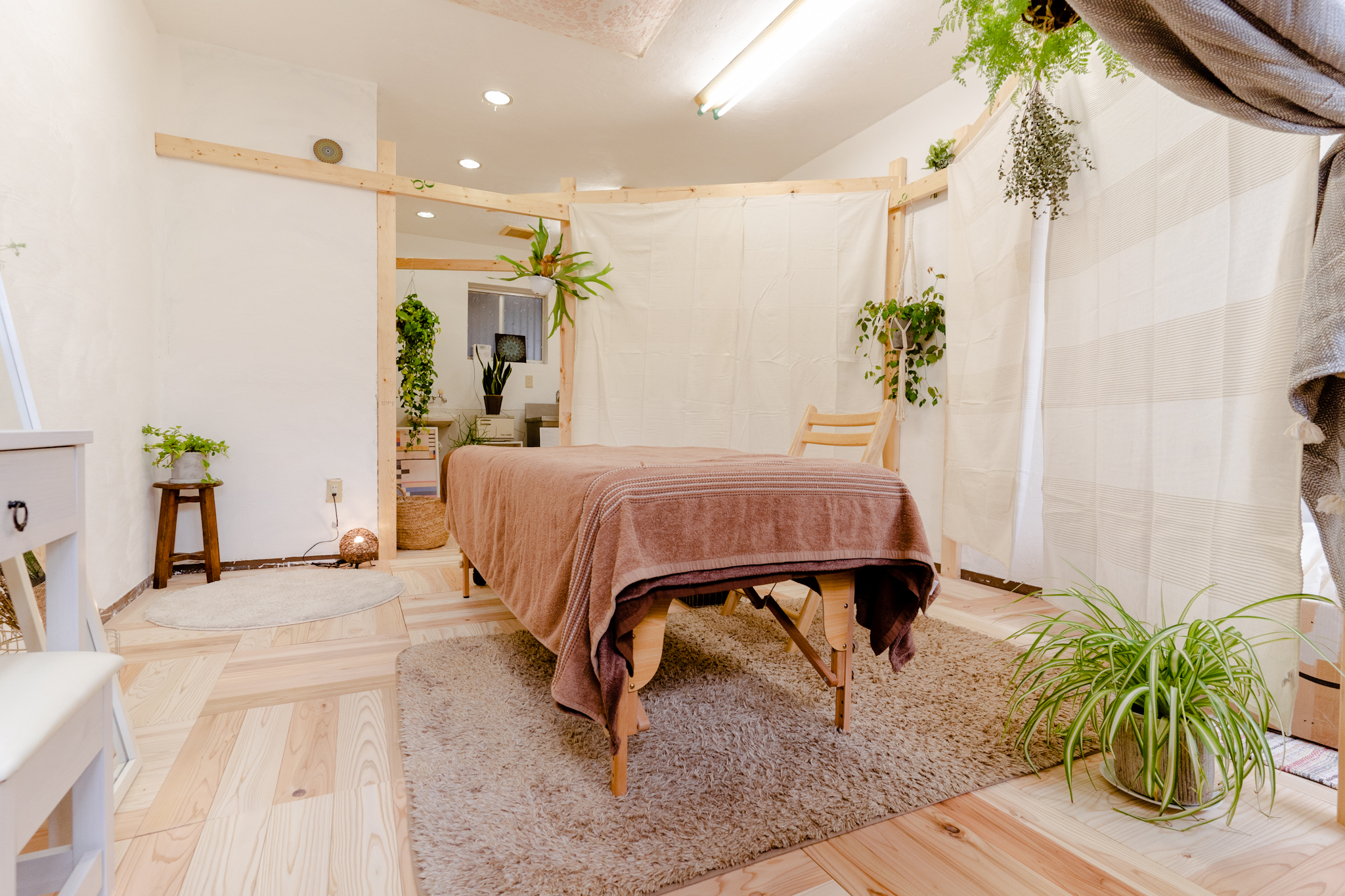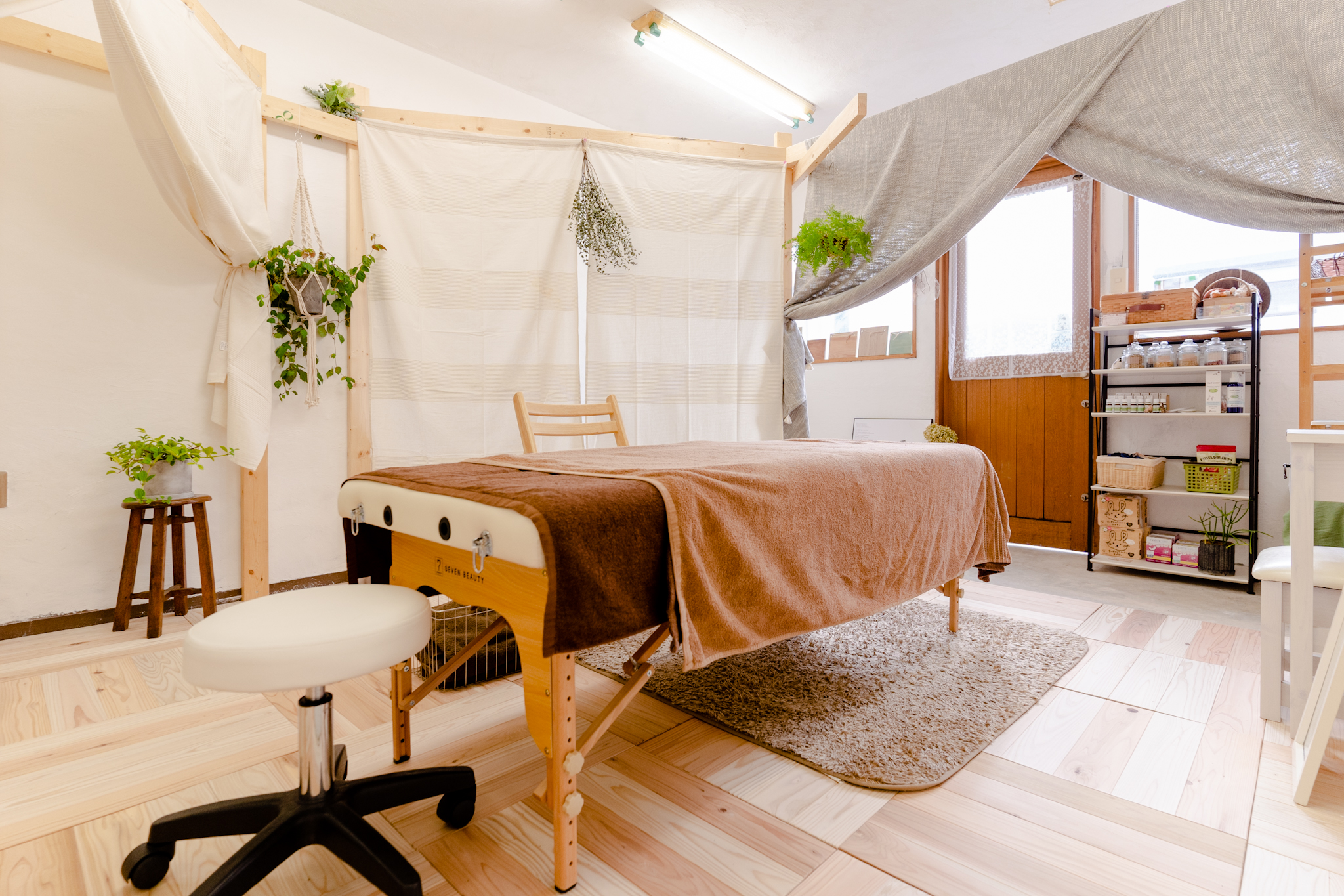 サロンでは、エステ、よもぎ蒸し、糸かけ講座、身体に良い物、環境に良い物をセレクトし物販されています。お客様がリラックスして過ごして頂ける、自然素材いっぱいの癒しの空間となりました。