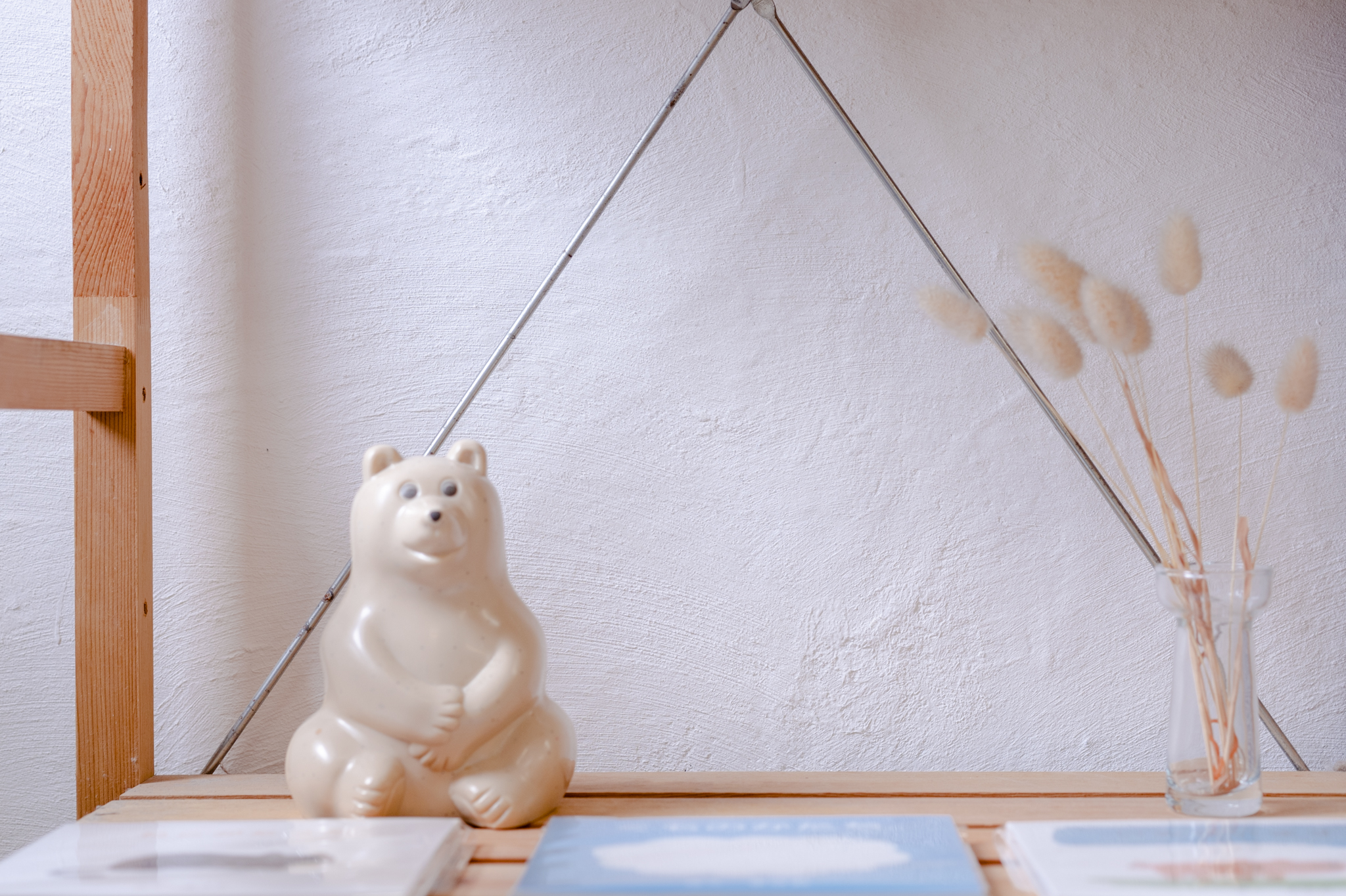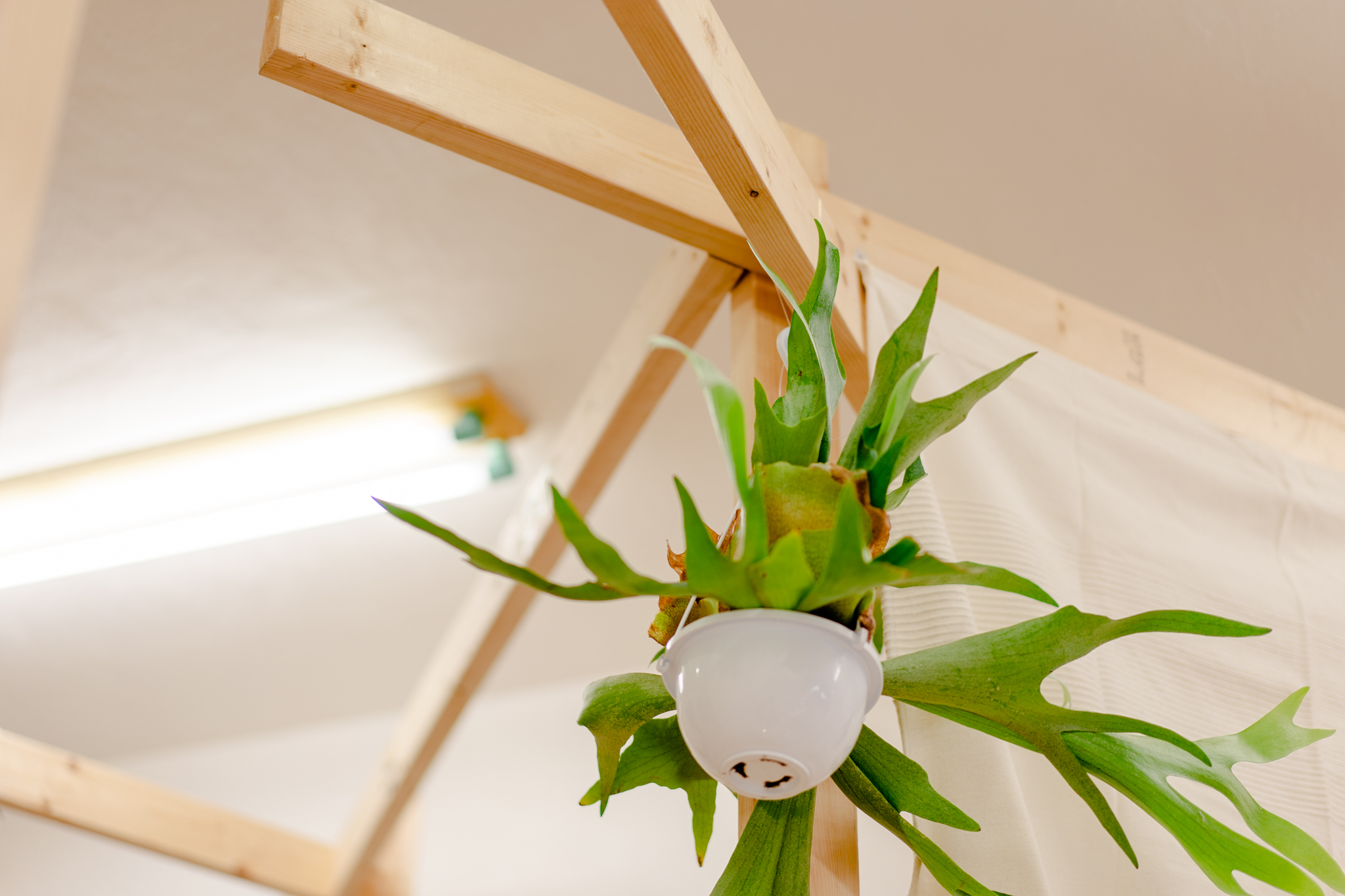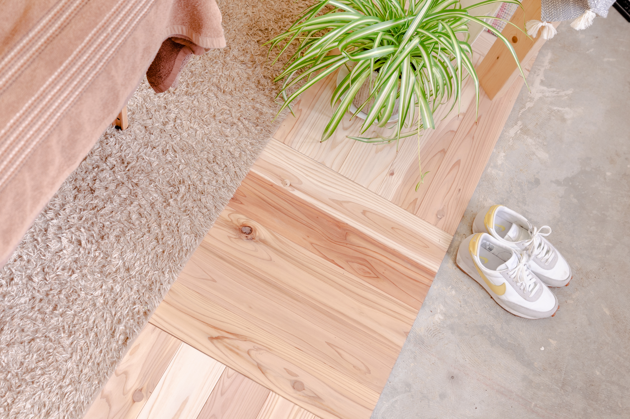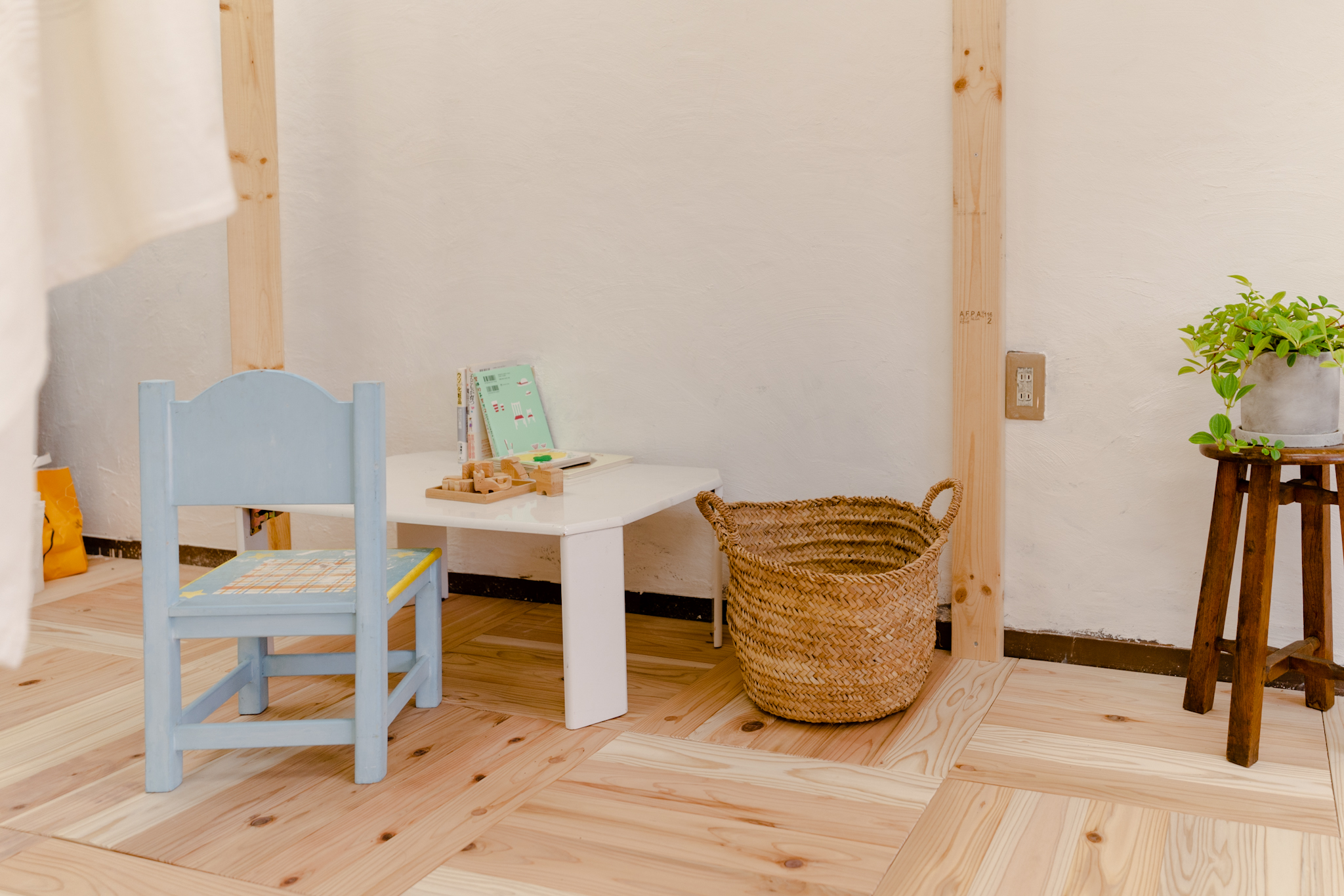 経営されているお店の趣向も『自然素材や身体に優しいものを使いたい』という施主様の想いがありました。床は、岡山の森の学校さんの考えにも共感され、スギのユカハリを使用。こちらは、コンクリートの上にそのまま置くだけで、無垢の素材を愉しめます。原状復帰も簡単なため、店舗やオフィスでも多く利用されています。また、壁は下地に珪藻土を塗っています。ただの珪藻土ではなく麻炭珪藻土をセレクト。(麻を焼いて炭にしたものを珪藻土の下地に塗る事で麻⇒魔除け炭⇒消臭・吸湿などの効果が増します)その上に、漆喰で塗装をしています。こちちらは、施主様がDIYで塗装されました。