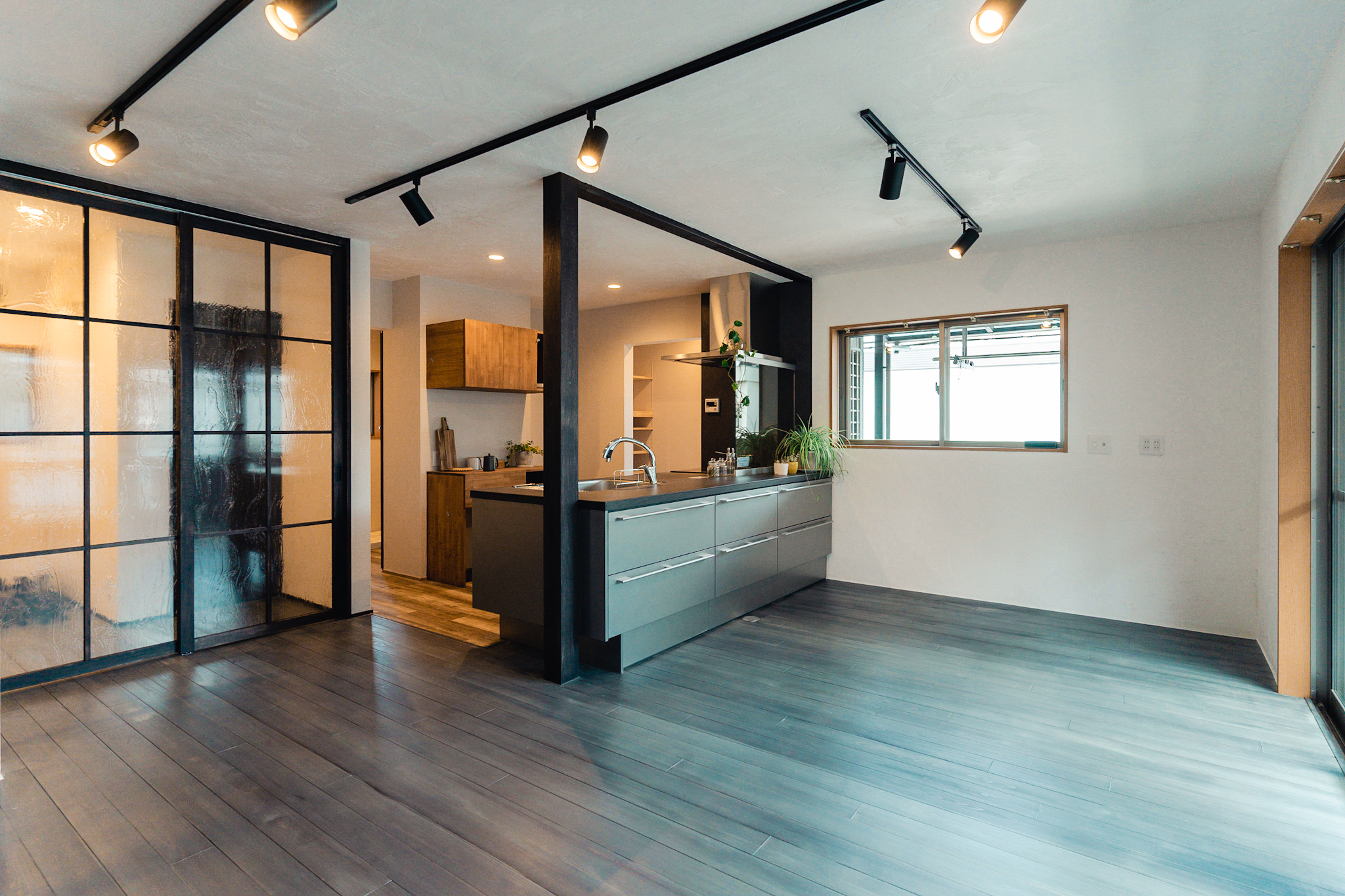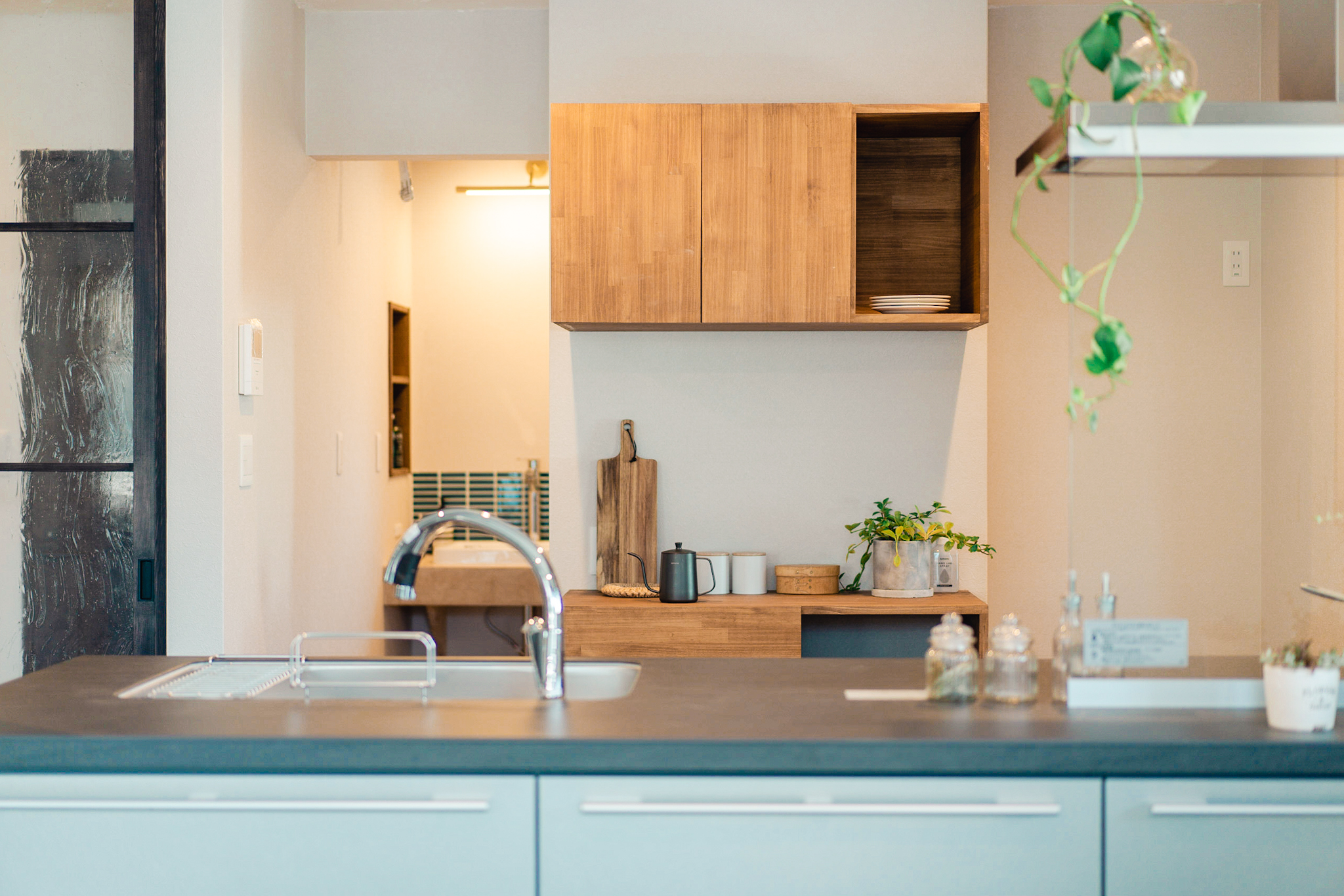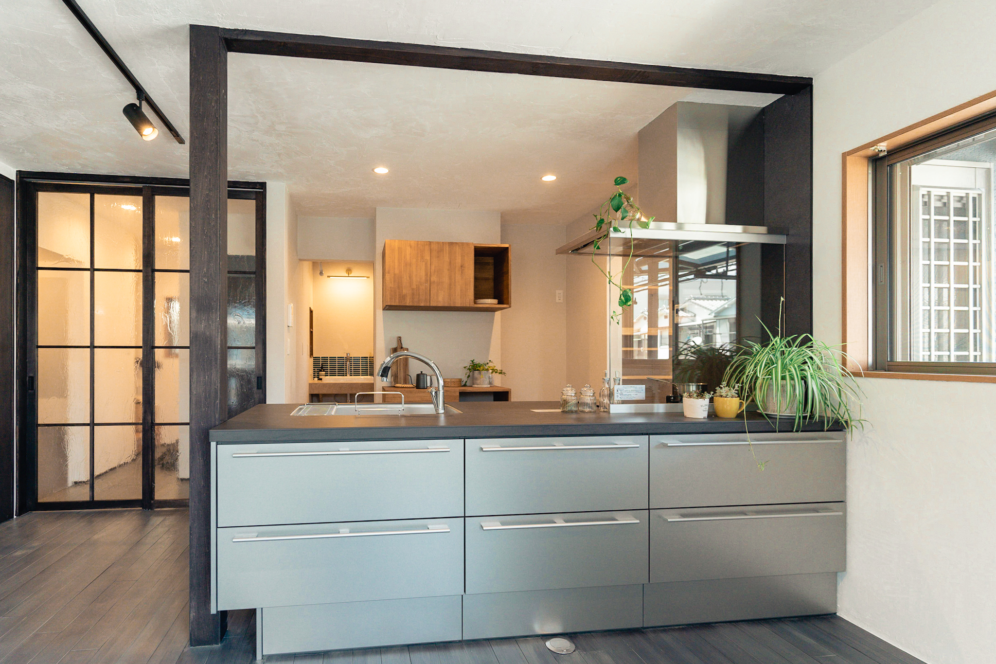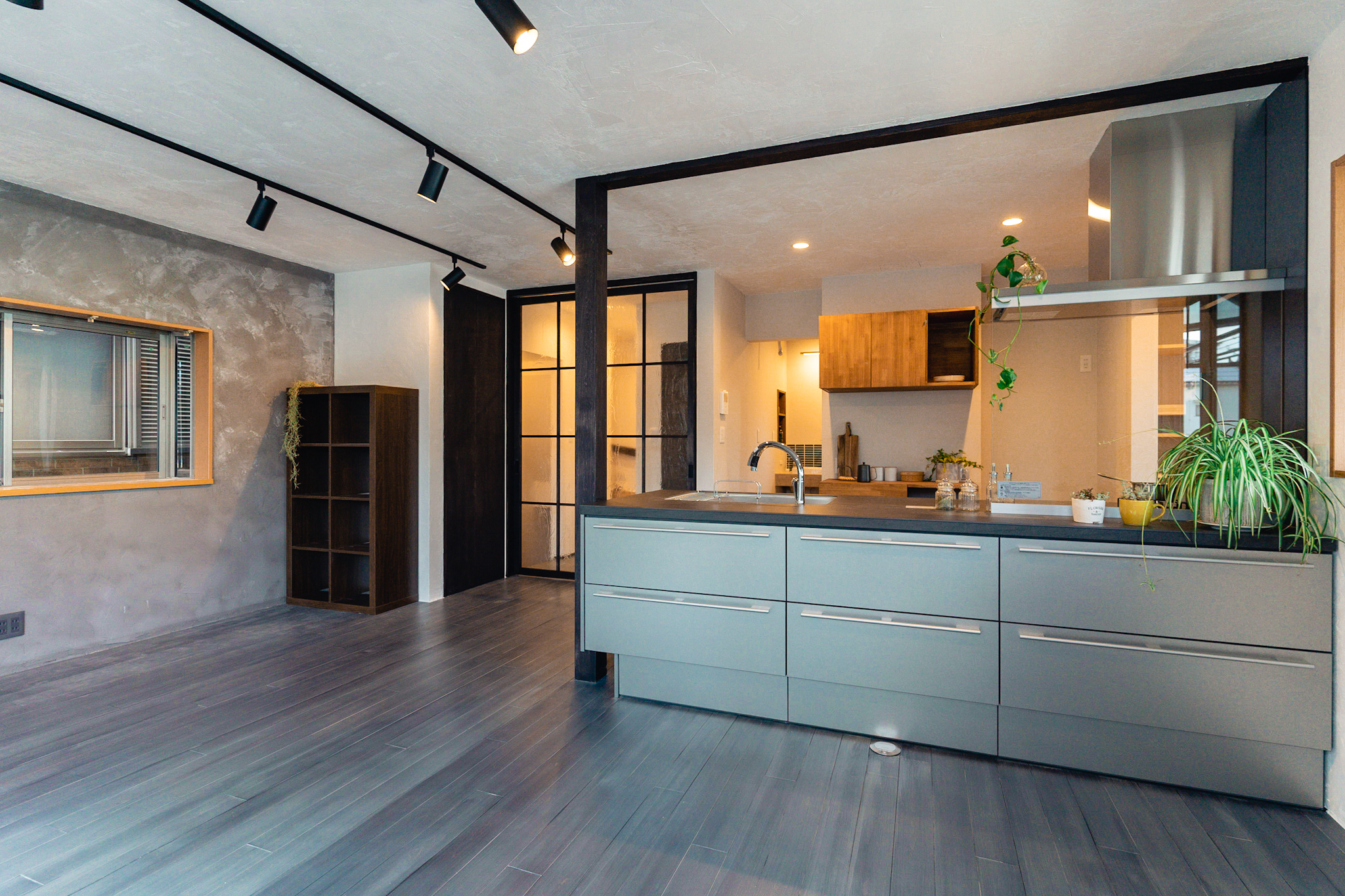 全体的なご予算の配分を考慮し、2Fについては出来るだけ元の間取りを活かしたリノベーションとしており、キッチンはもともと壁があった部分を取り除き、構造補強を行うことでリビングスペースとの一体感を感じられようにしました。2Fの壁・天井はお施主様ご自身で漆喰をDIYされ味のある仕上がりに。お施主様お気に入りの空間となりました。