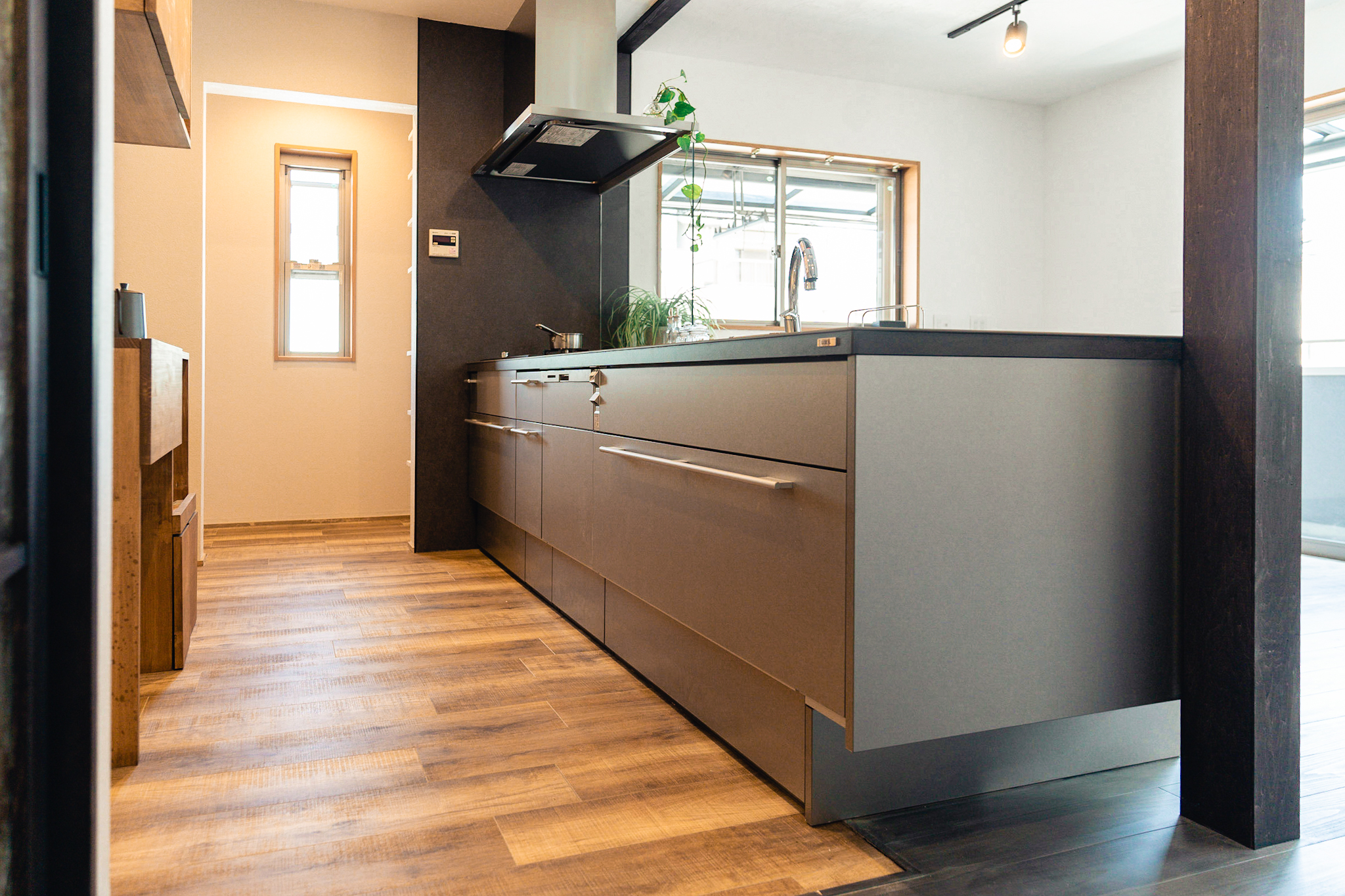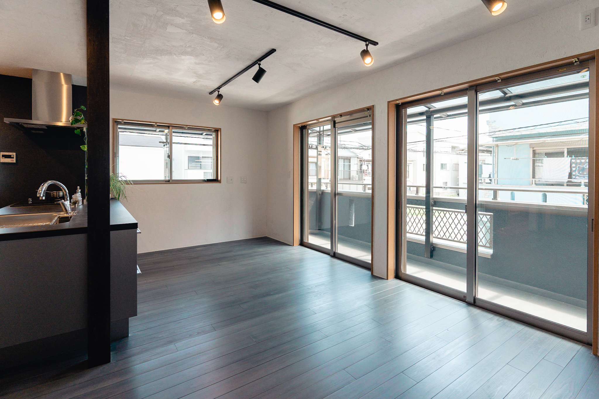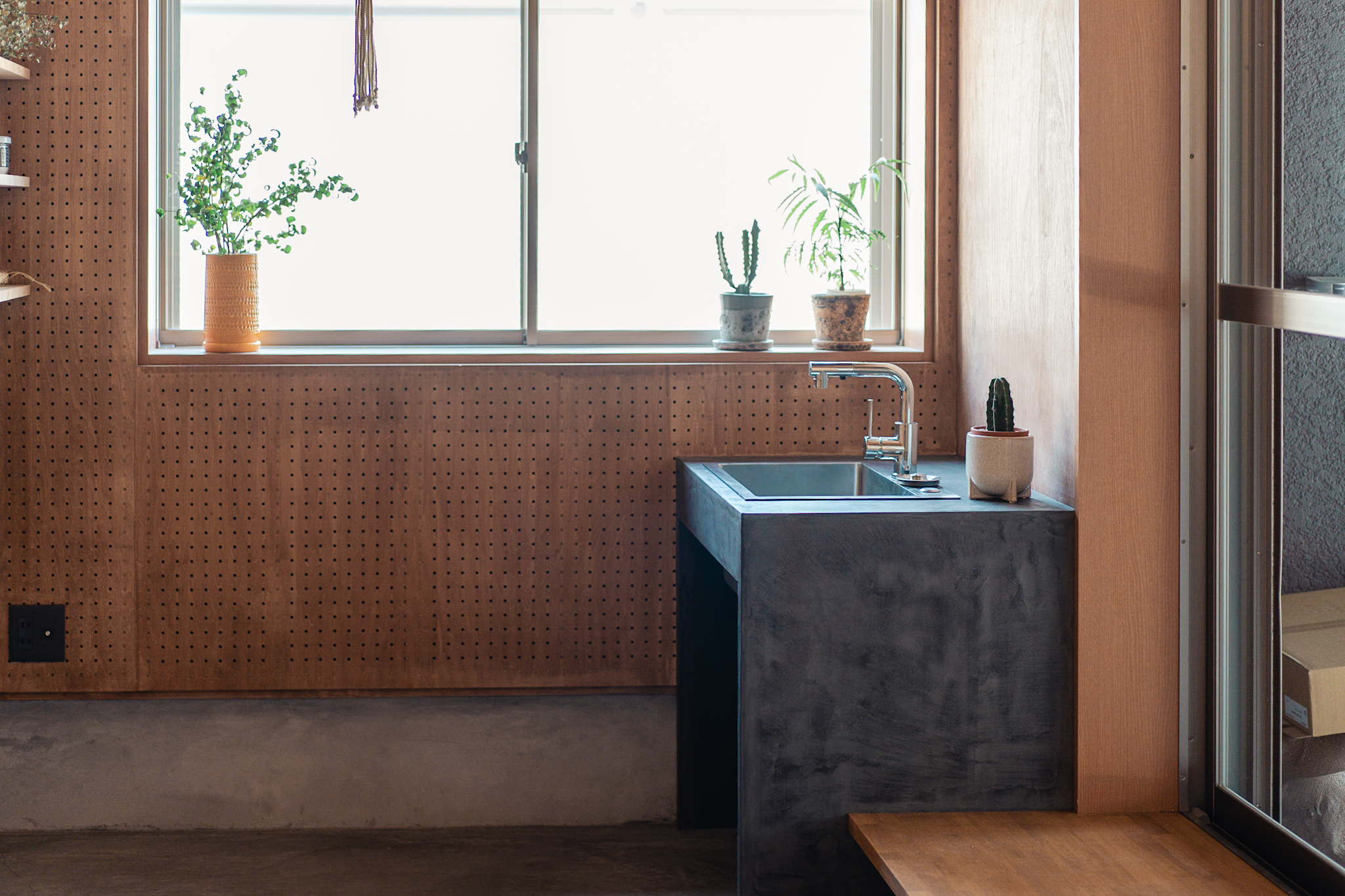 全体的なご予算の配分を考慮し、2Fについては出来るだけ元の間取りを活かしたリノベーションとしており、キッチンはもともと壁があった部分を取り除き、構造補強を行うことでリビングスペースとの一体感を感じられようにしました。2Fの壁・天井はお施主様ご自身で漆喰をDIYされ味のある仕上がりに。お施主様お気に入りの空間となりました。