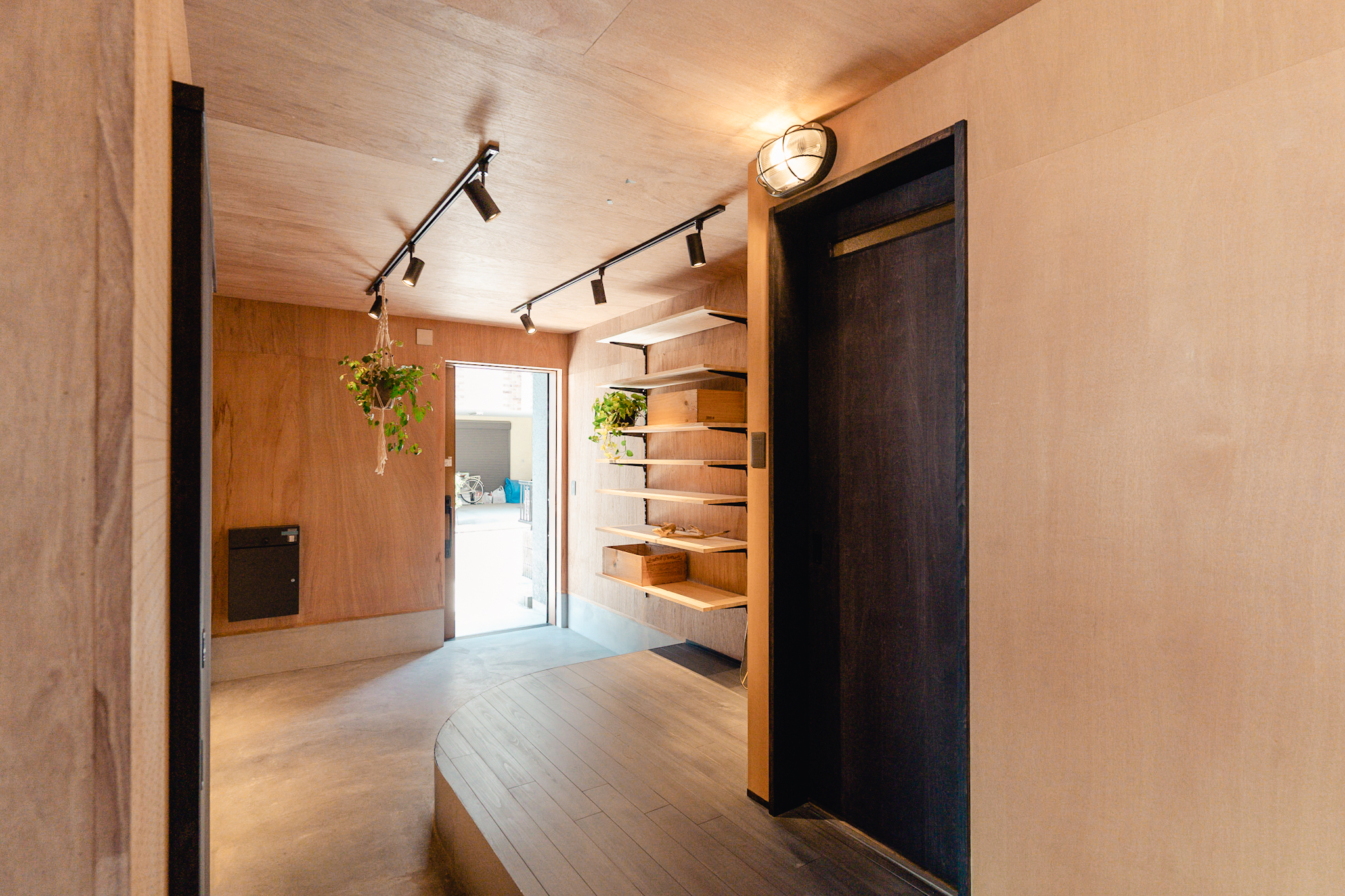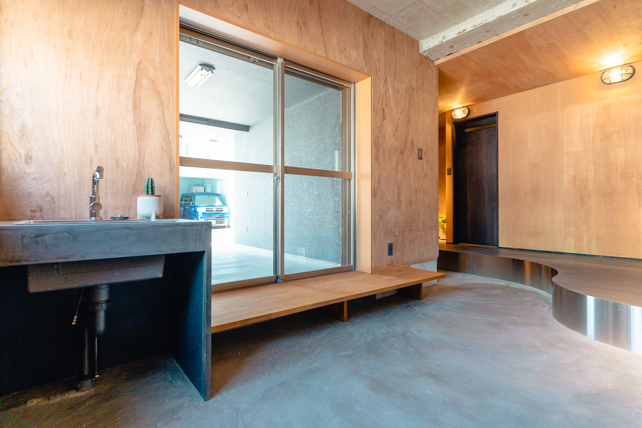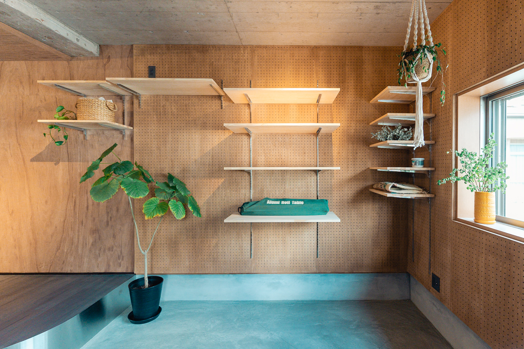 「たくさんのアウトドアグッズをすぐに仕舞える空間がほしい」とのことで、1Fは全て土間収納として活用。玄関入口に面した外壁を外側にせり出し、土間スペースを広く拡大することで沢山の収納が可能となりました。また、テントやスノーボードなどのメンテナンスをされるので作業がしやすい広い空間を実現。駐車場は玄関に入りやすい動線を意識し、新たに勝手口を設けました。