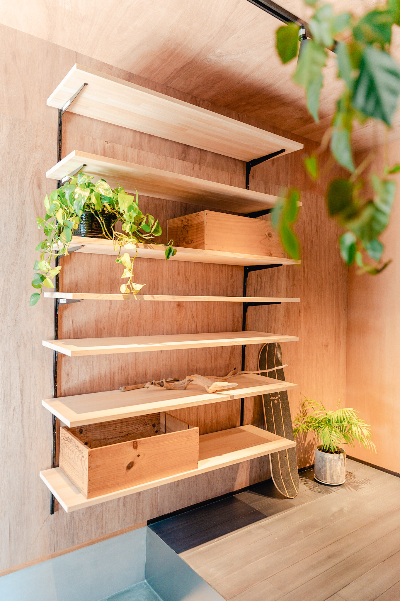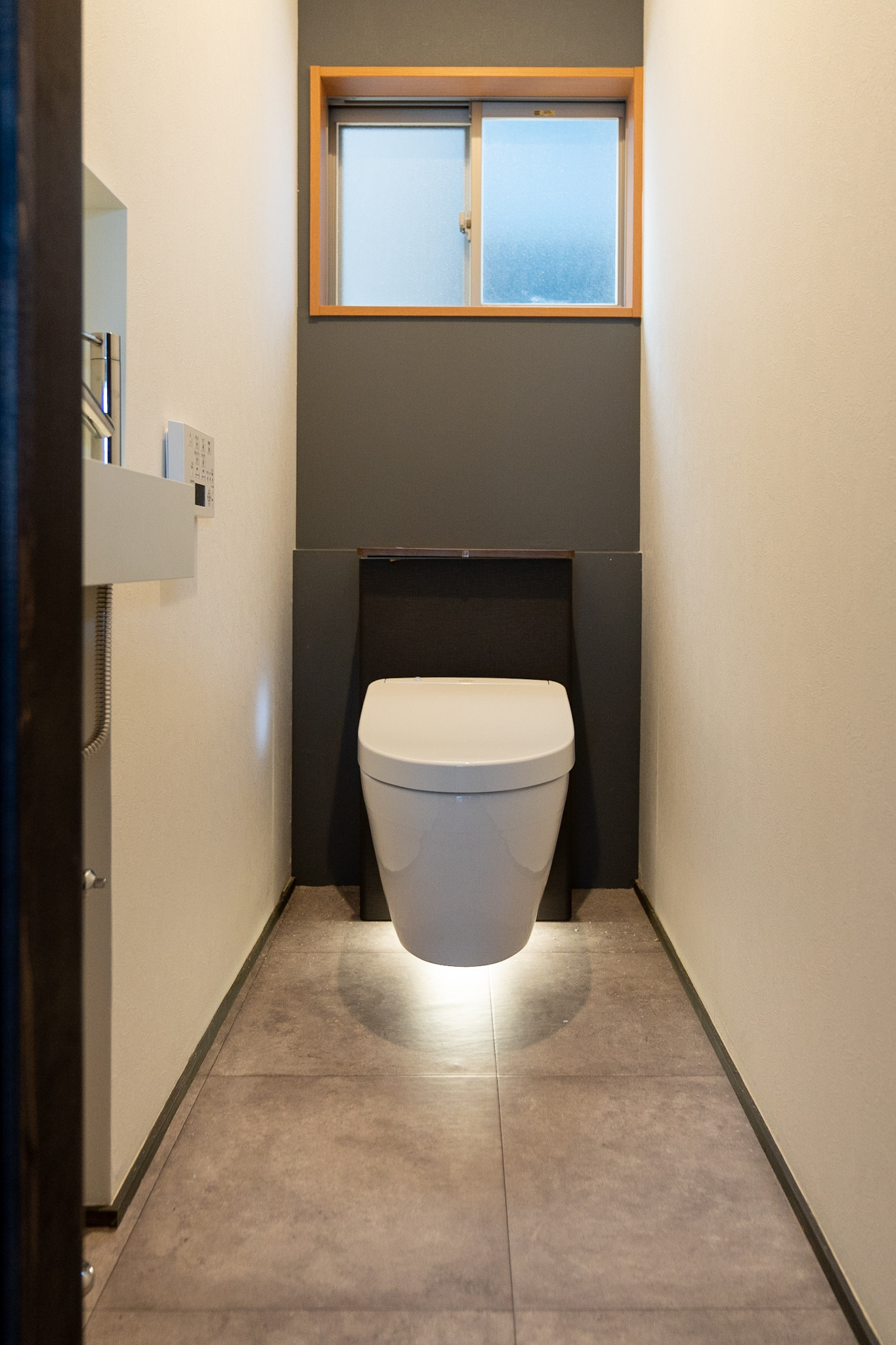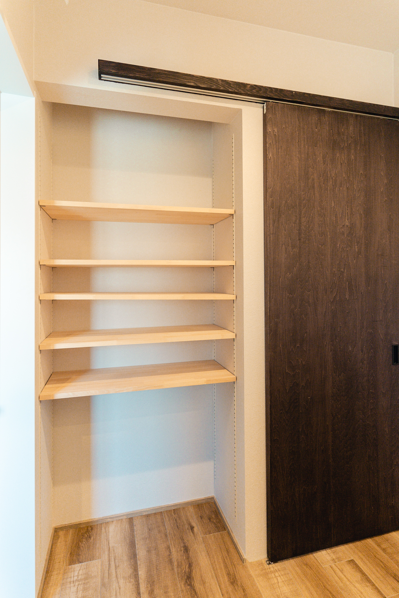 「たくさんのアウトドアグッズをすぐに仕舞える空間がほしい」とのことで、1Fは全て土間収納として活用。玄関入口に面した外壁を外側にせり出し、土間スペースを広く拡大することで沢山の収納が可能となりました。また、テントやスノーボードなどのメンテナンスをされるので作業がしやすい広い空間を実現。駐車場は玄関に入りやすい動線を意識し、新たに勝手口を設けました。