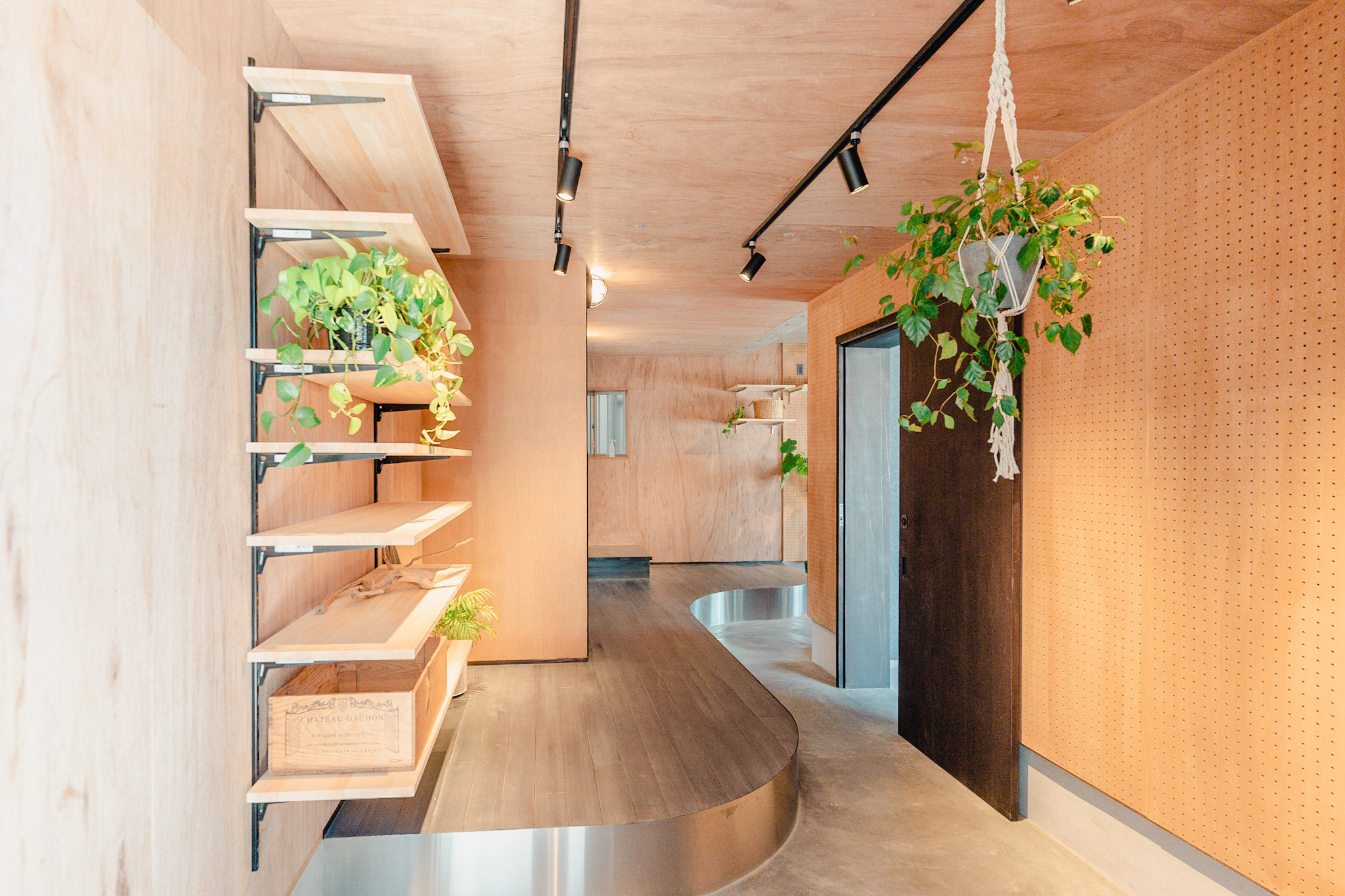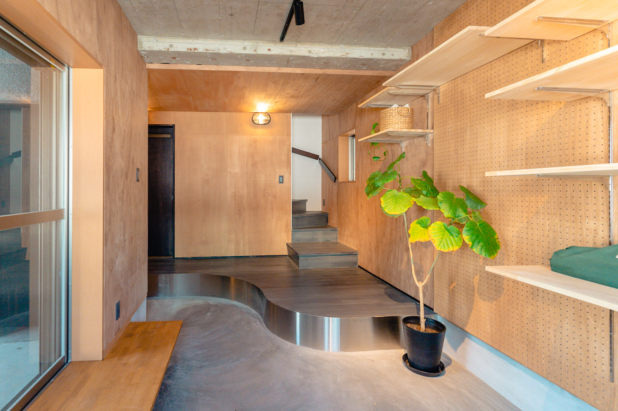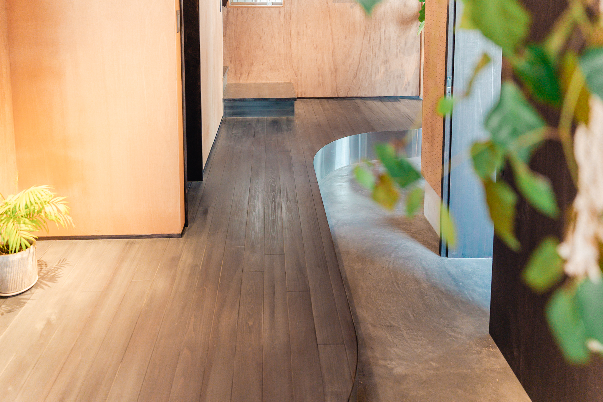 土間と廊下の境界を曲線にすることで、広くとった土間の圧迫感を緩和しています。