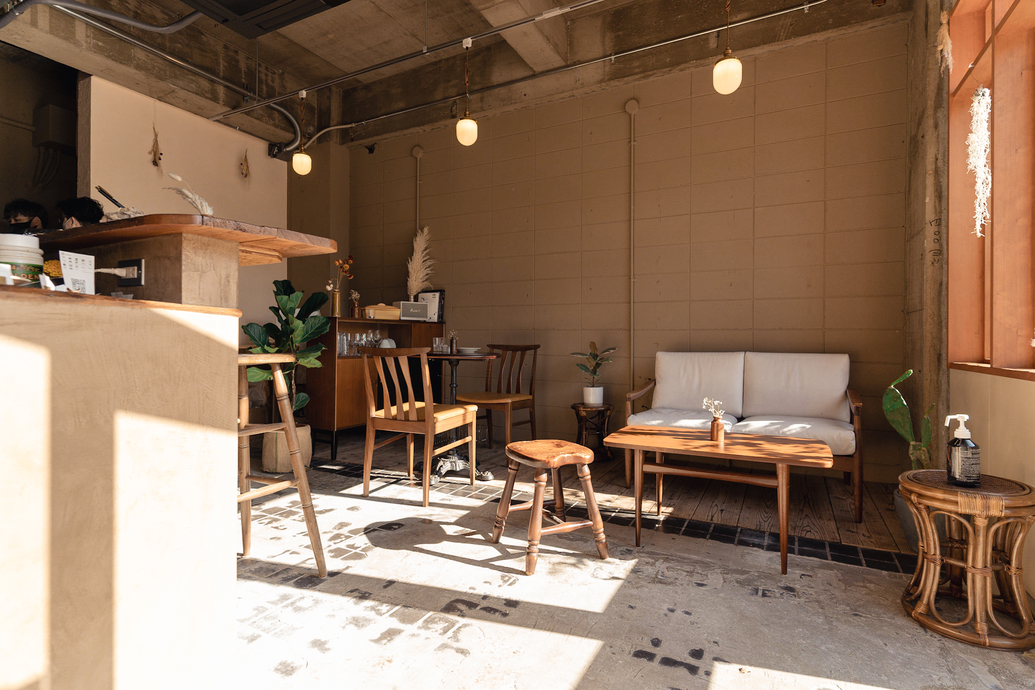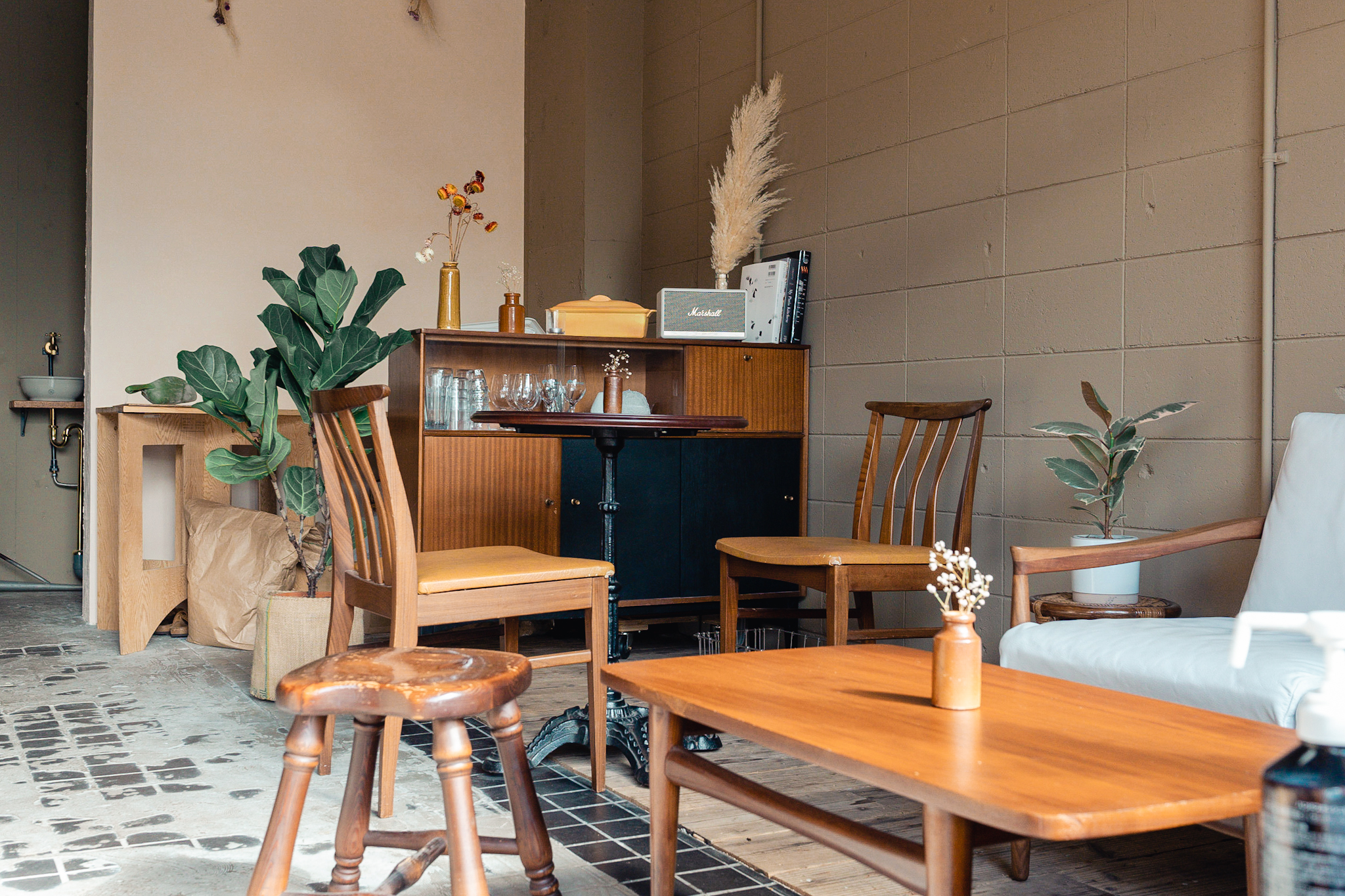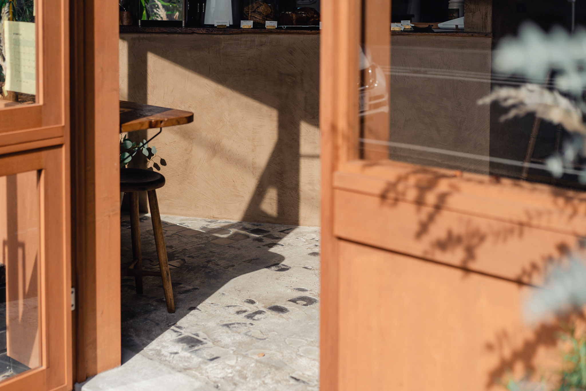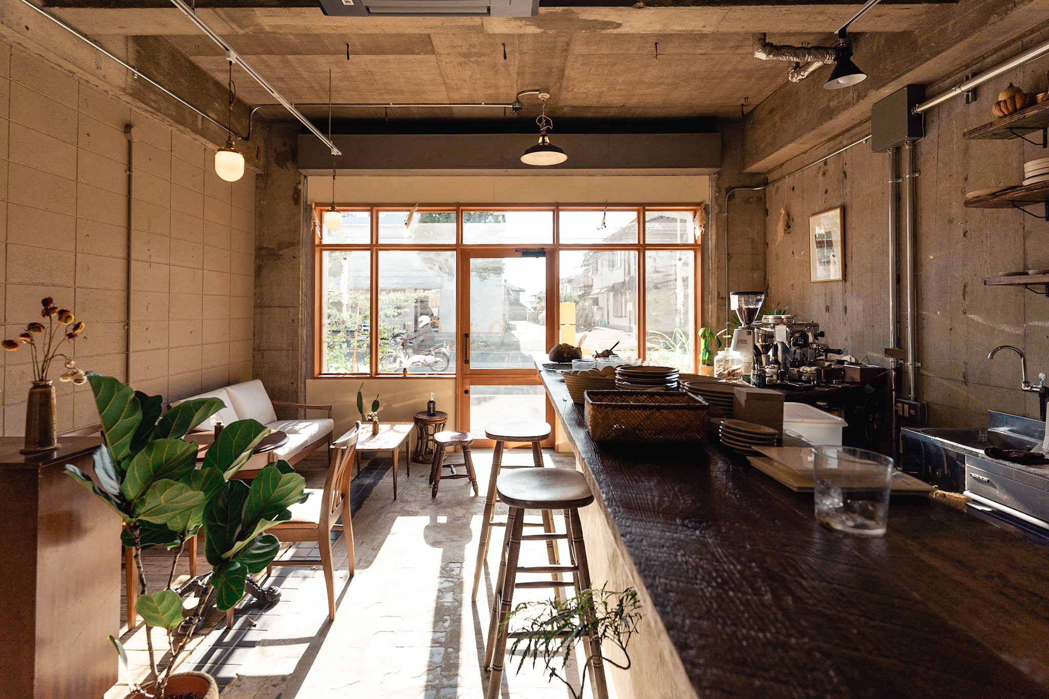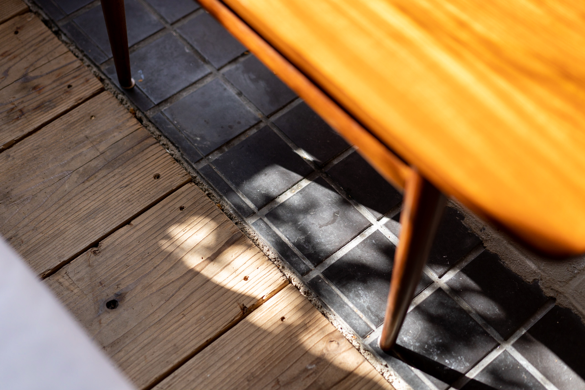 店内も出来るだけ既存のテクスチャを残し、活かすことが出来るように計画しました。床の既存タイルは古さが残り新しく作るのでは出せない風合いが残っていました。床のタイルとコンクリートは残しそれを引き立てるような古材を床のなかった部分に合わせています。