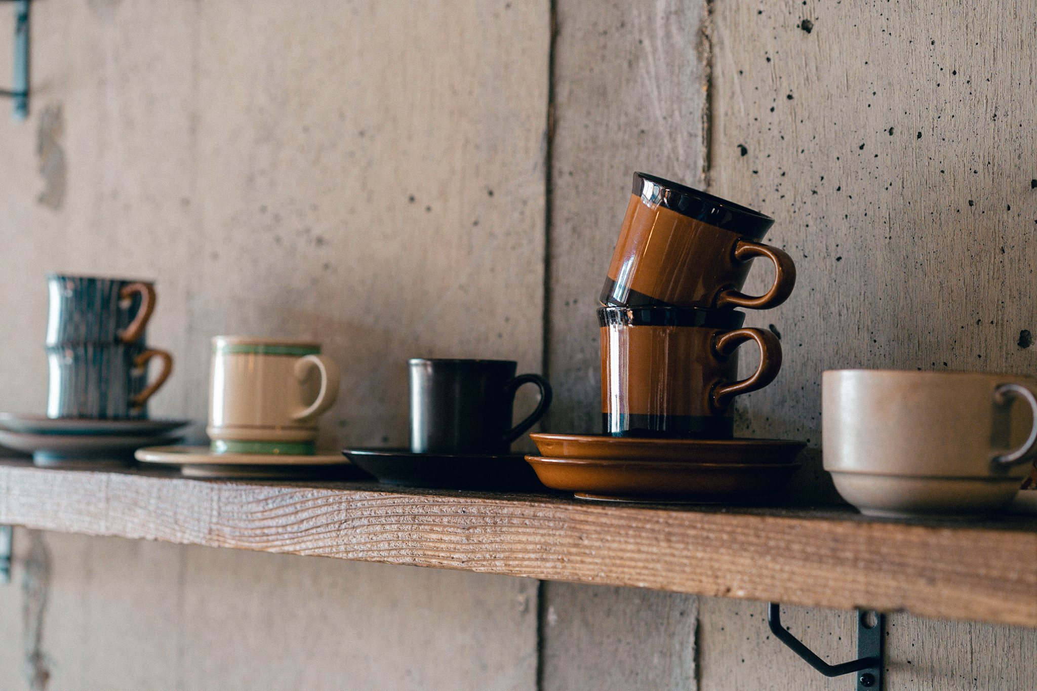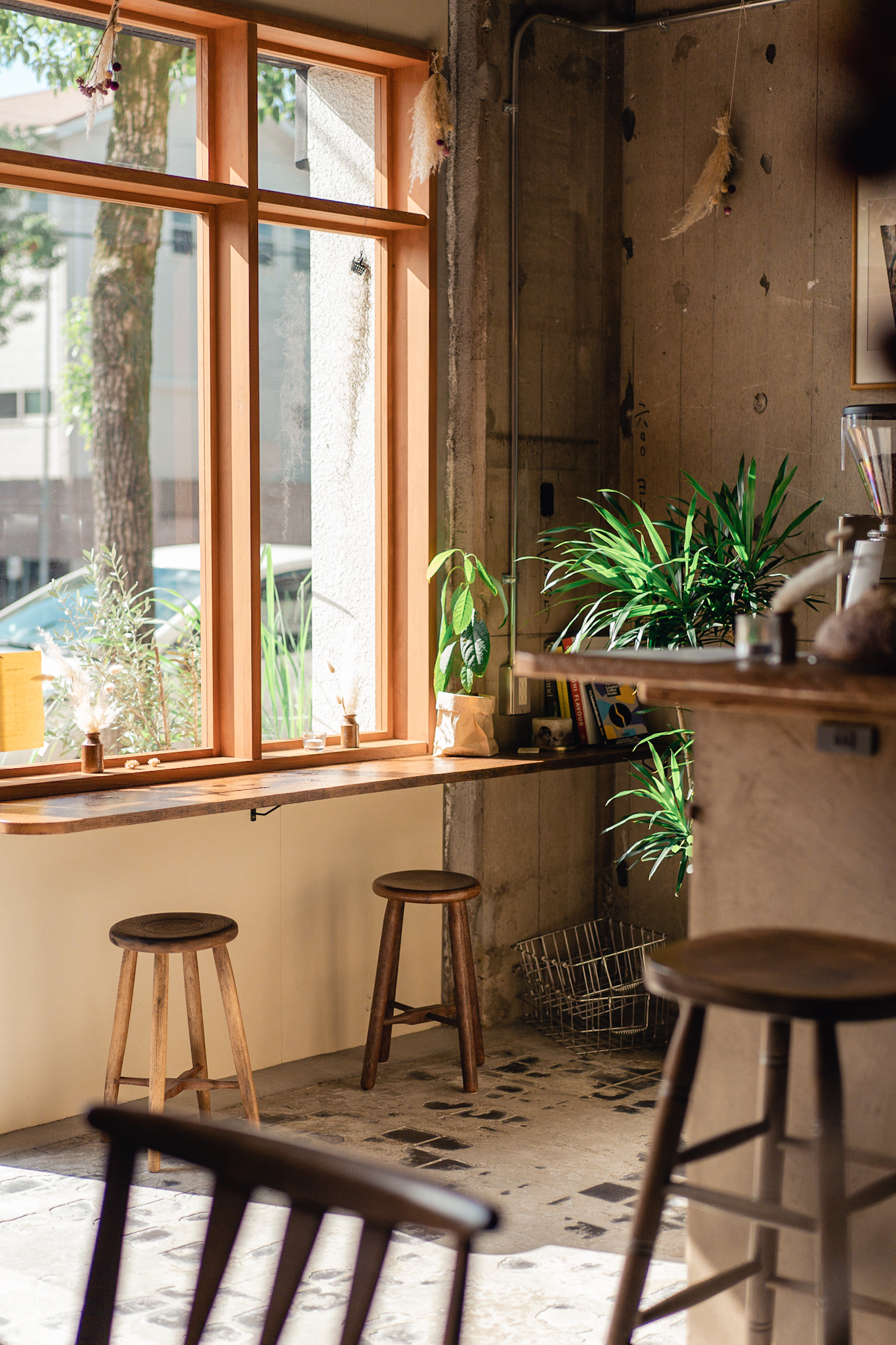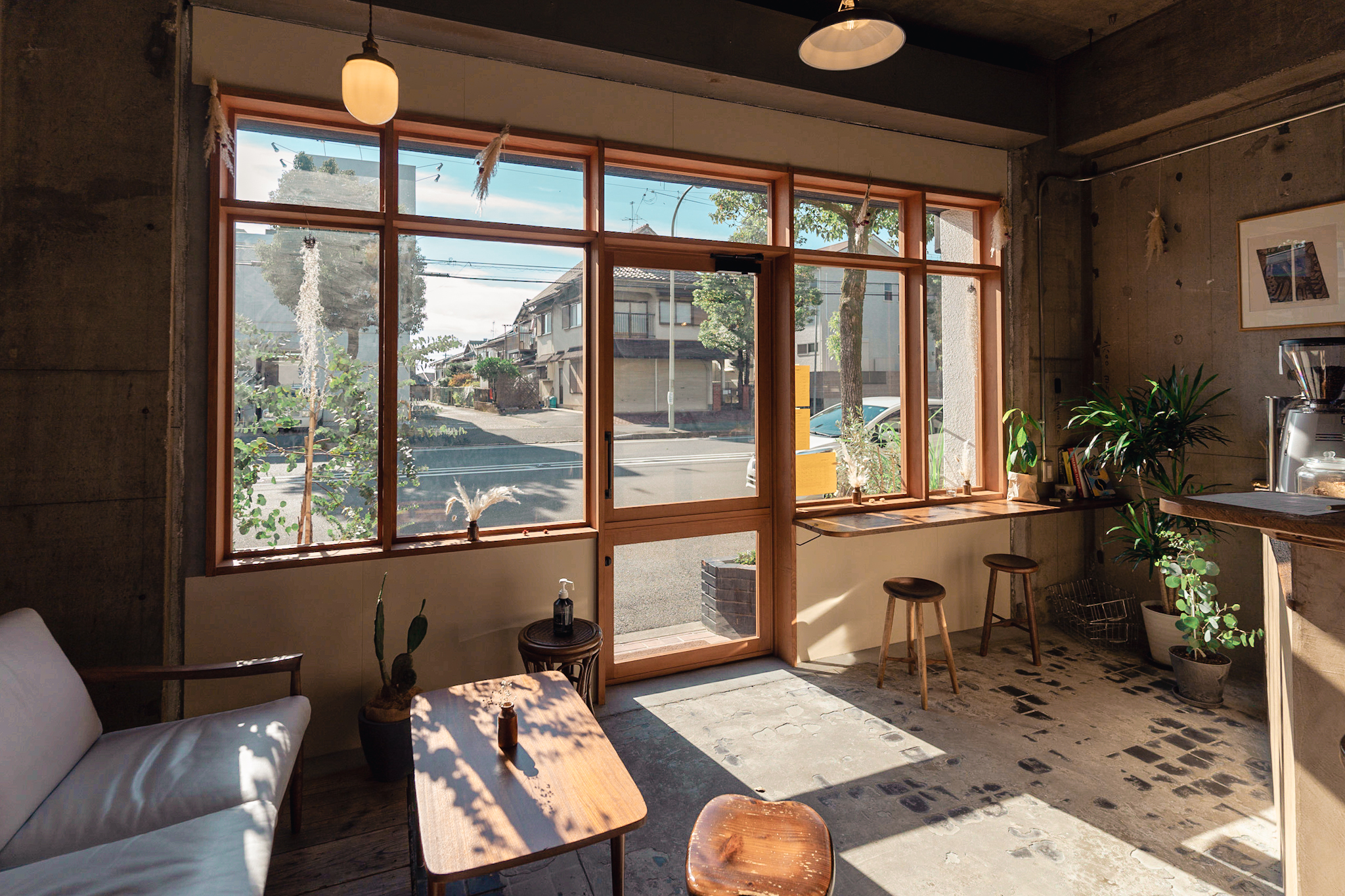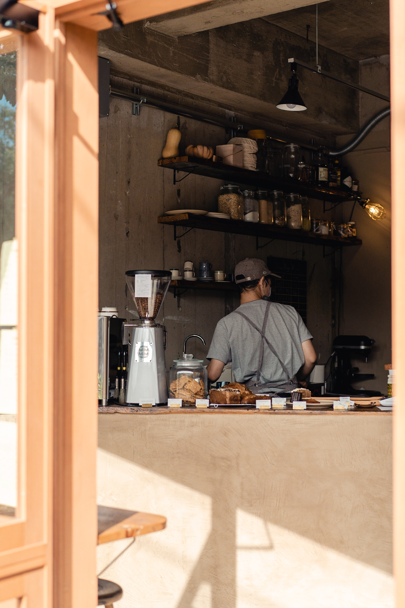 店内も出来るだけ既存のテクスチャを残し、活かすことが出来るように計画しました。床の既存タイルは古さが残り新しく作るのでは出せない風合いが残っていました。床のタイルとコンクリートは残しそれを引き立てるような古材を床のなかった部分に合わせています。
