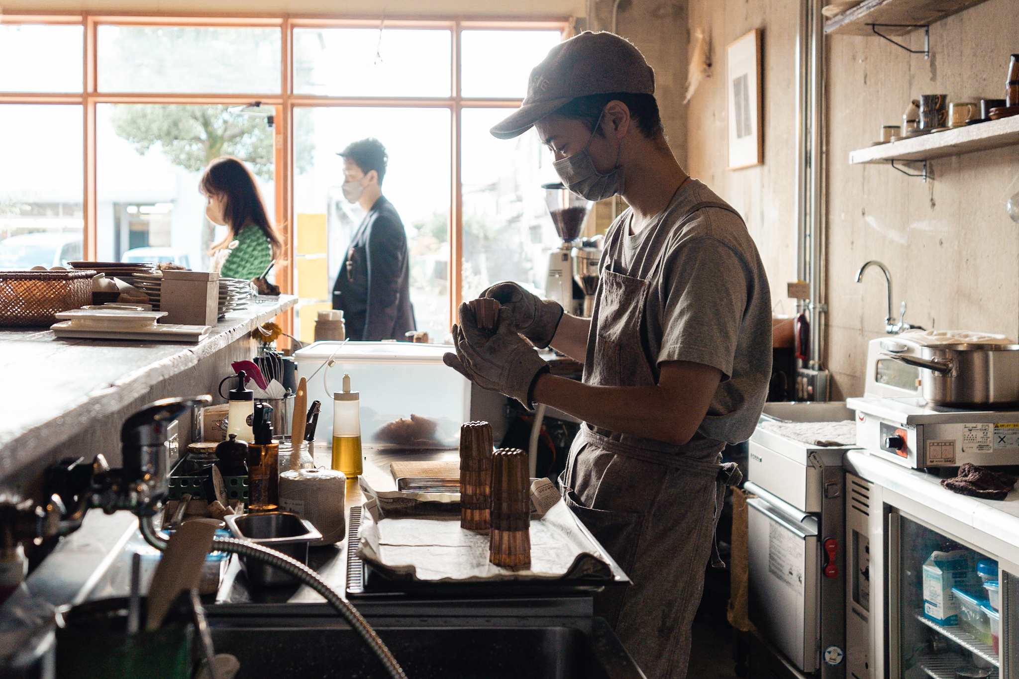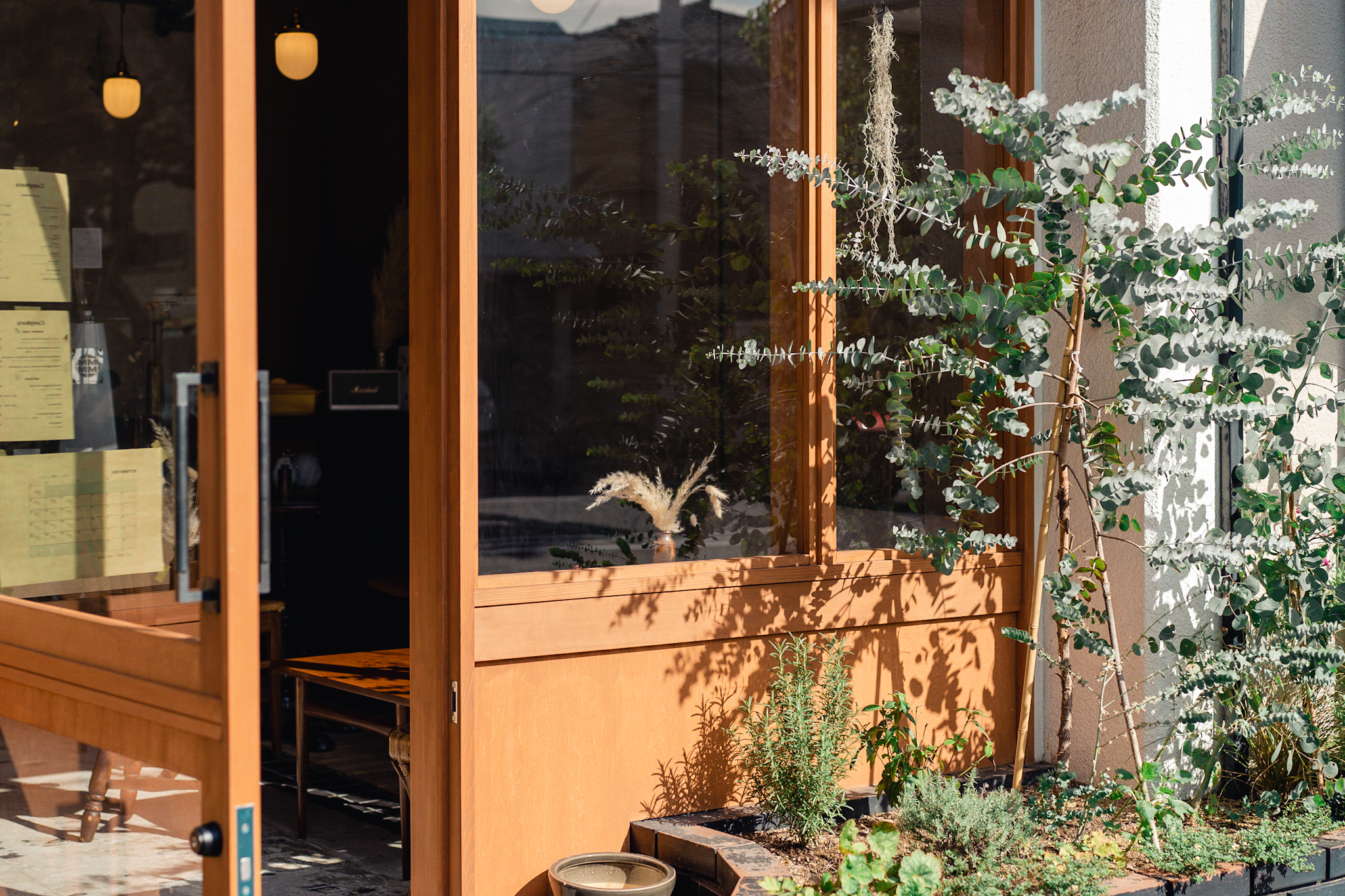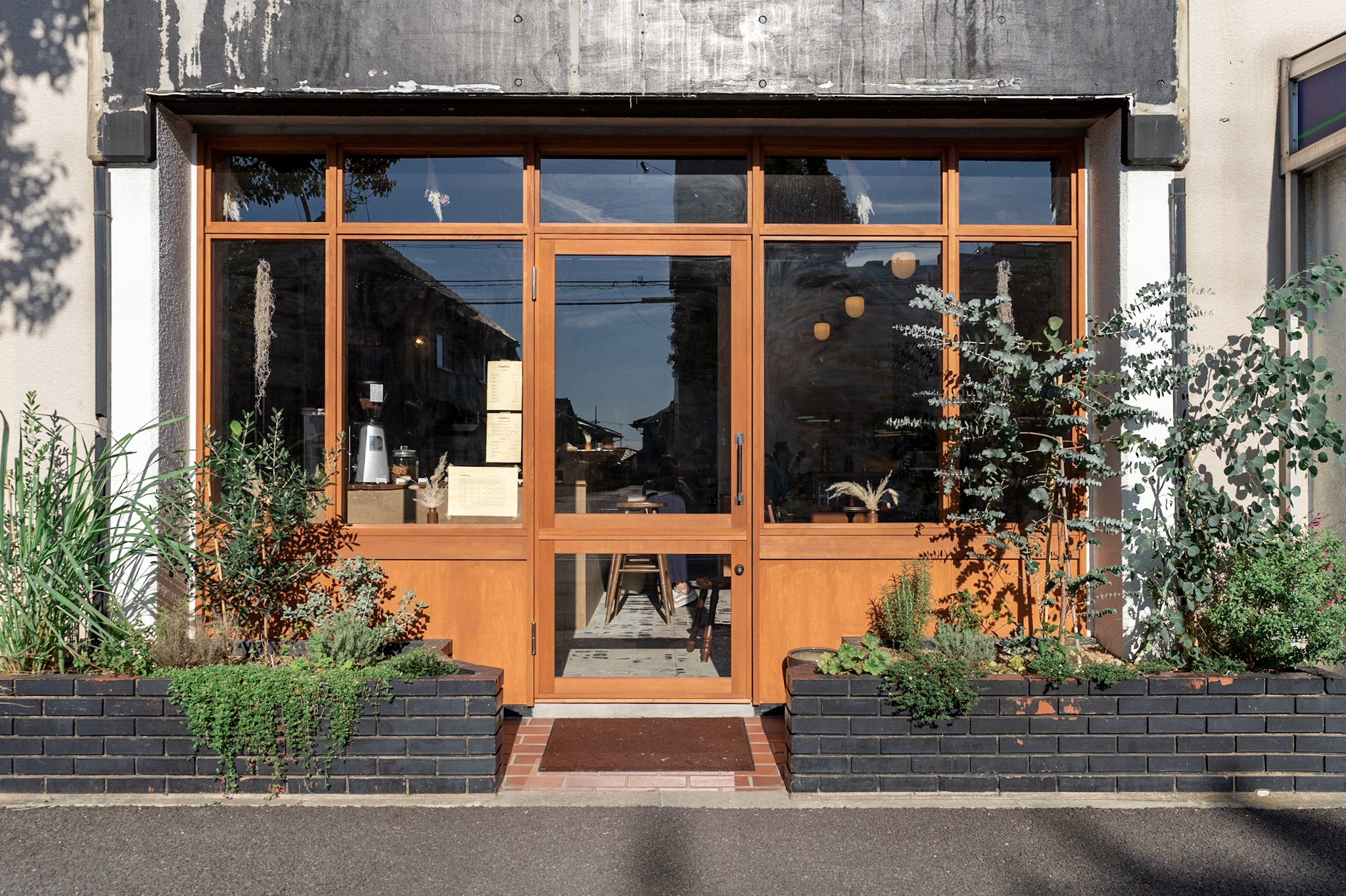 車通りに面した場所だった為、まちづくりの一助になるようなファサードになるように計画しました。花壇等、元からあったものにも馴染むようにガラス張りの木製建具としました。木枠は出来るだけシャープに見えるよう枠に段差を付け製作しています。