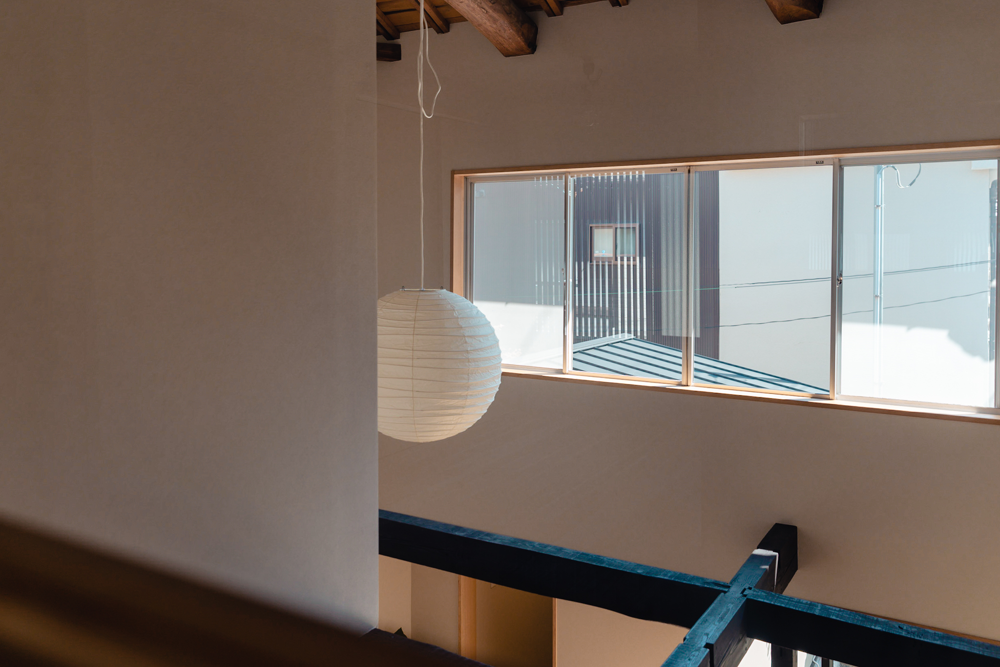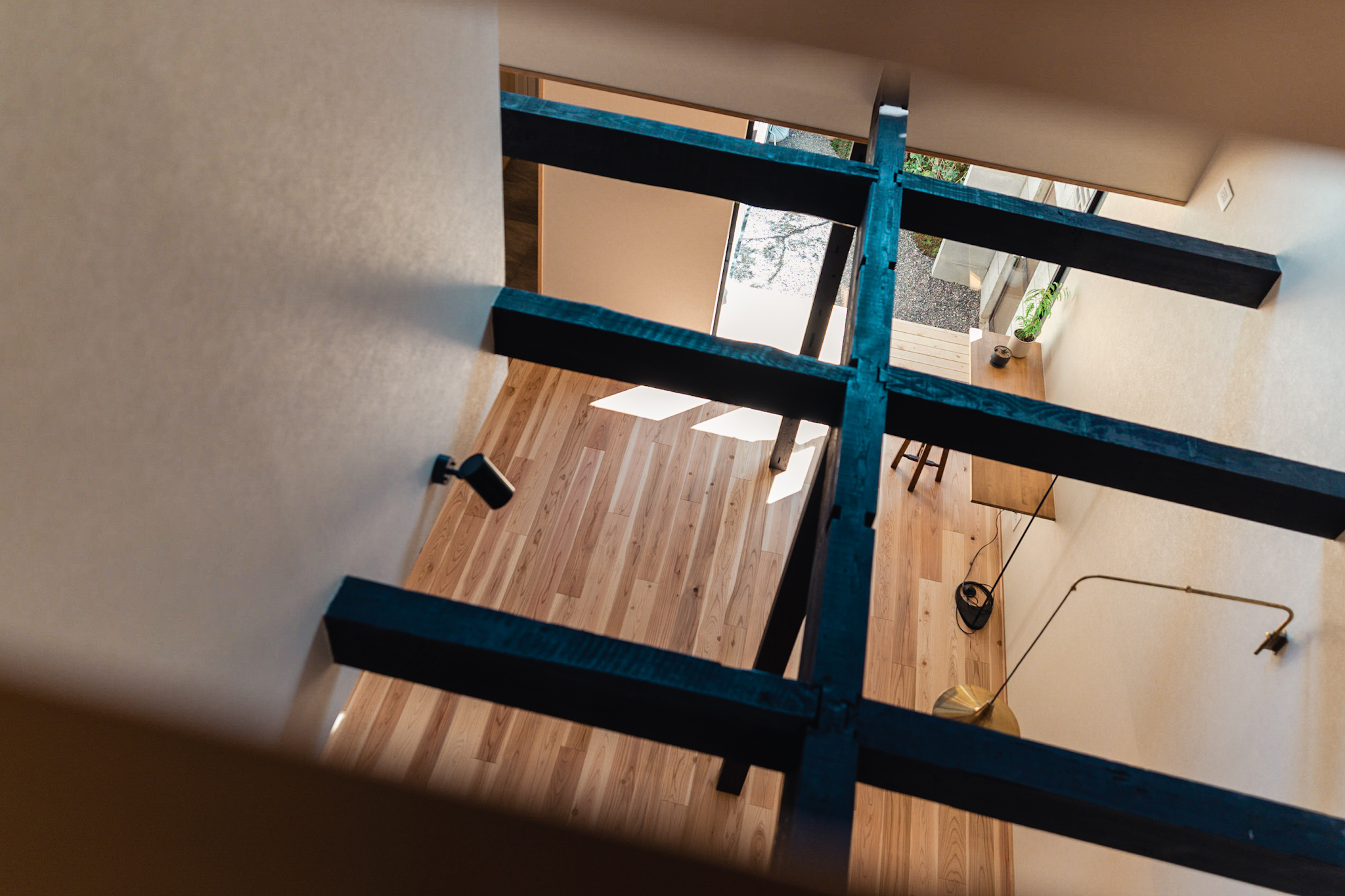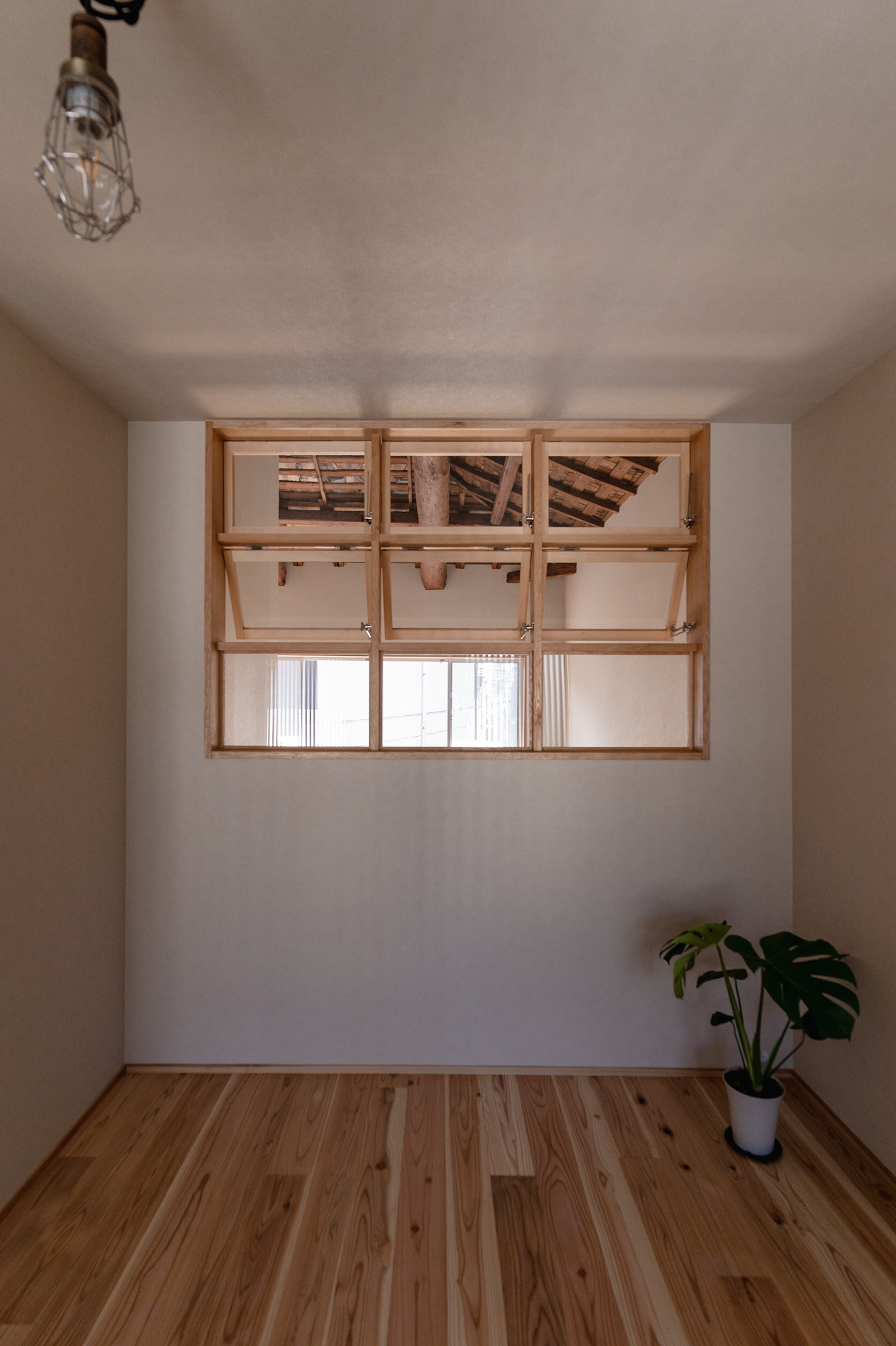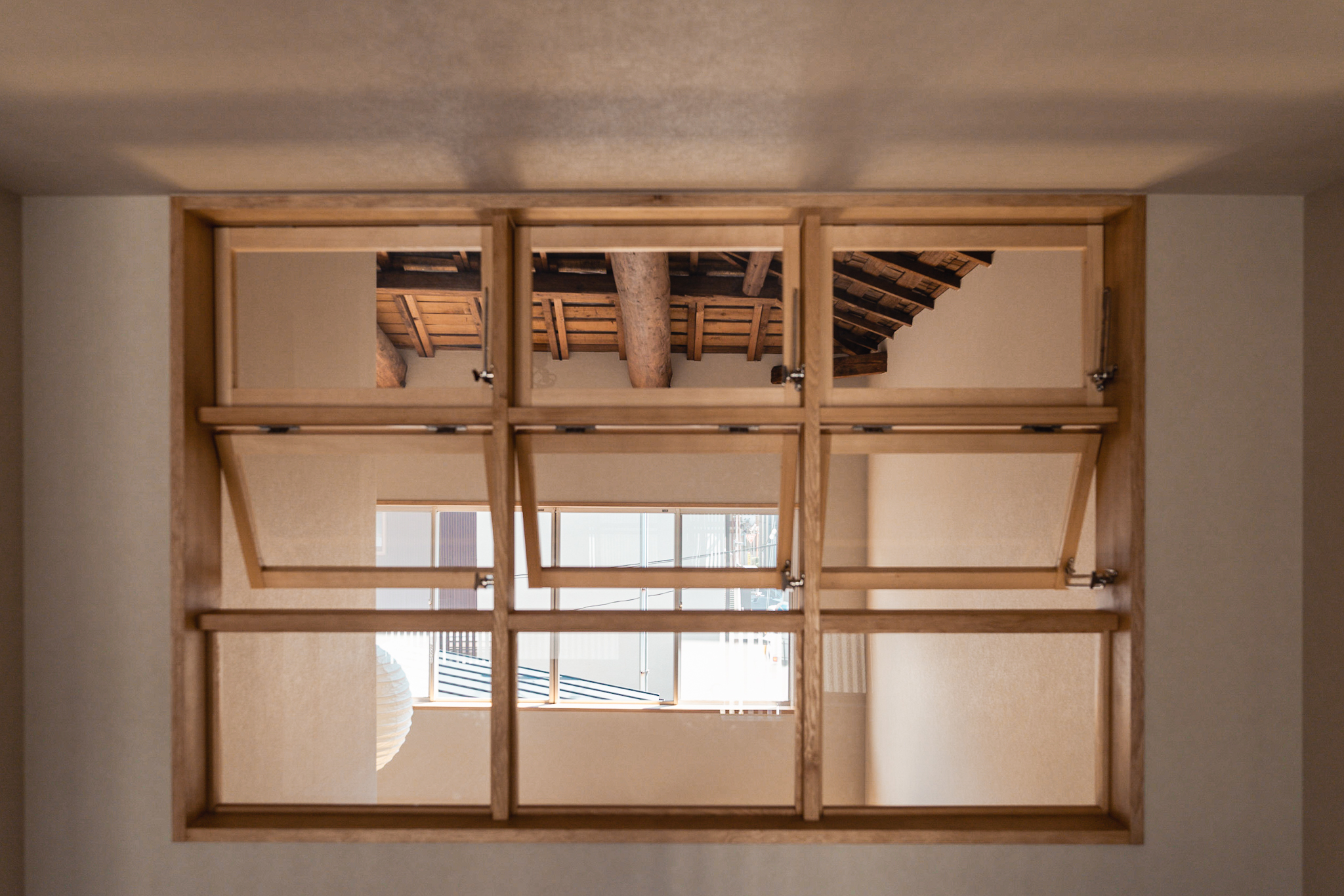 以前は1階に壁が多く、狭さと暗さがありましたが、1階にあった壁を取り払い、広々としたLDKに間取りを変更。また吹き抜けを設けることで、南側からの光と風を取り入れました。吹き抜けには、大きな木製の室内窓を設置し、採光と換気の効率を高めています。