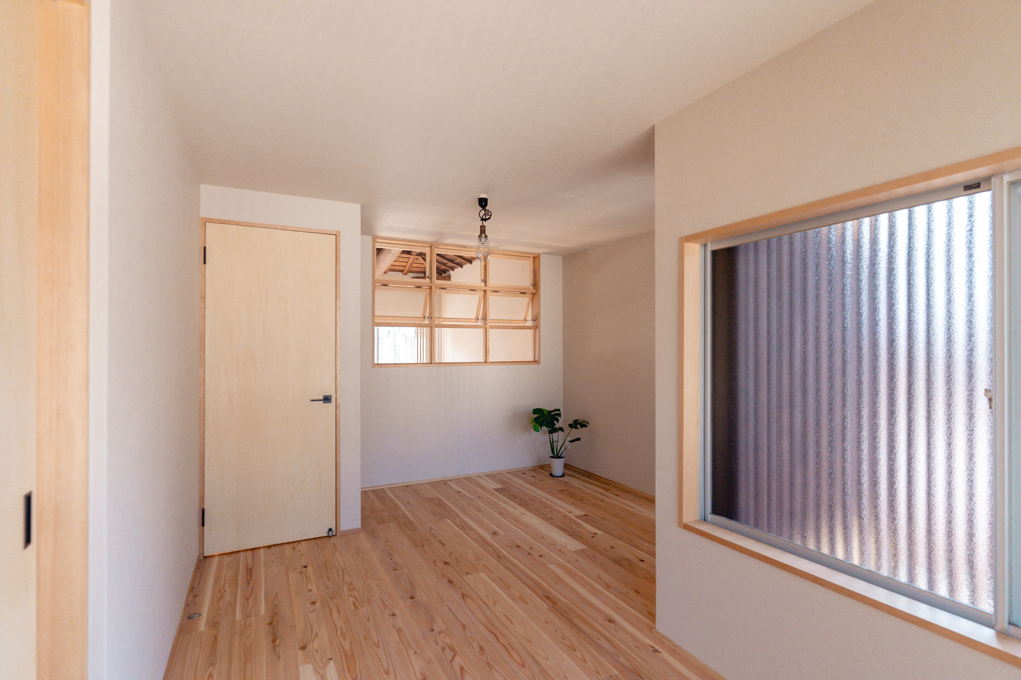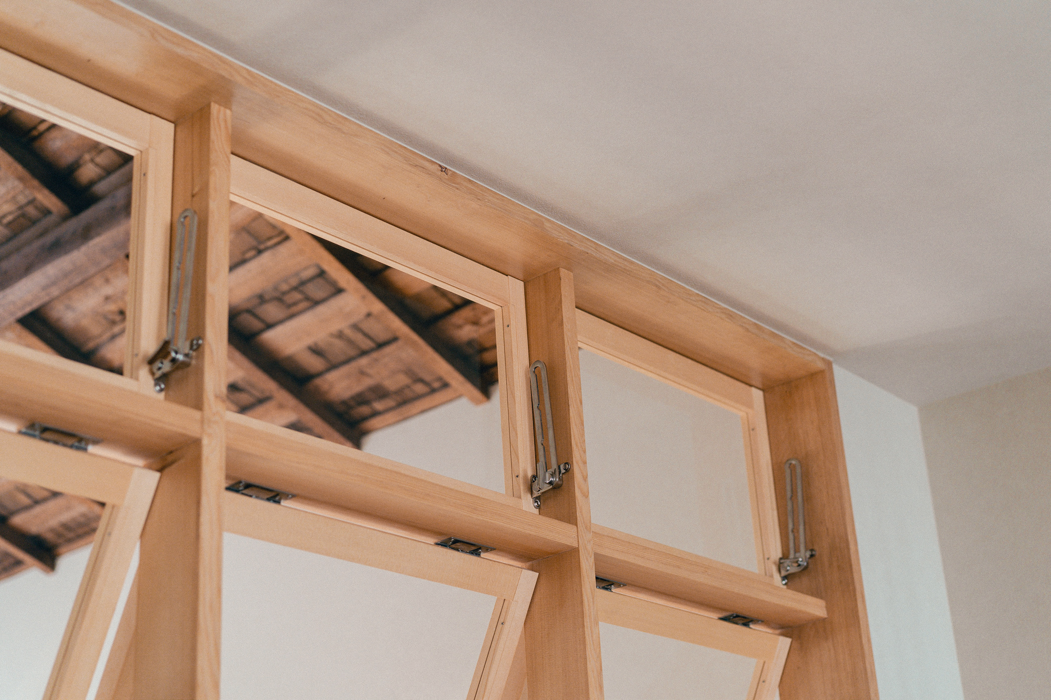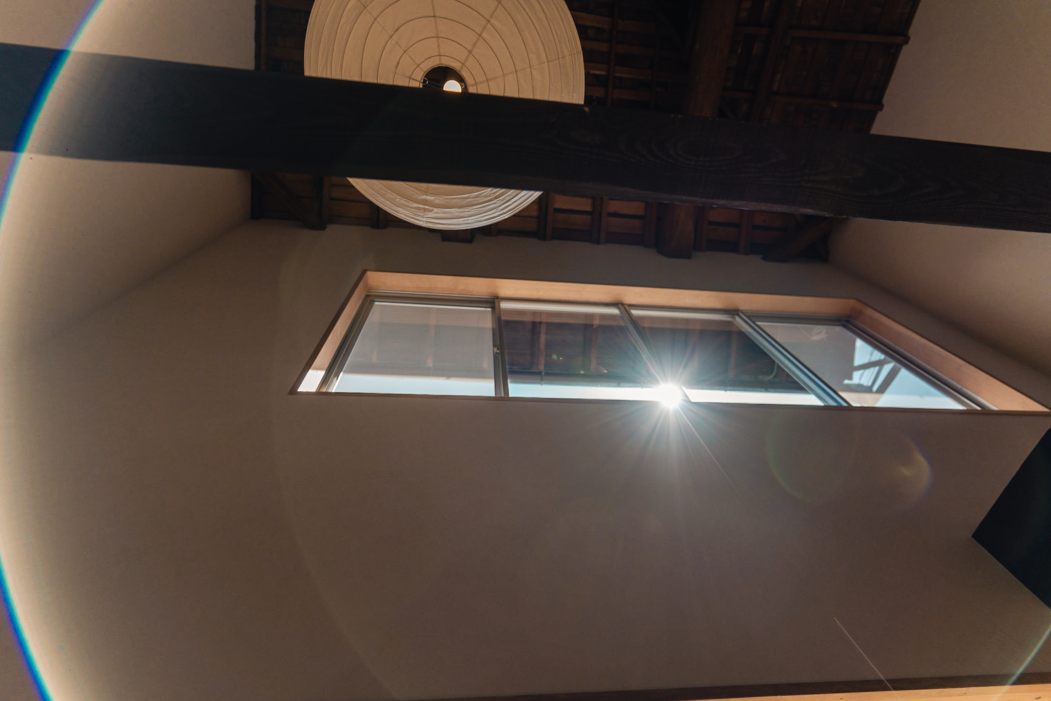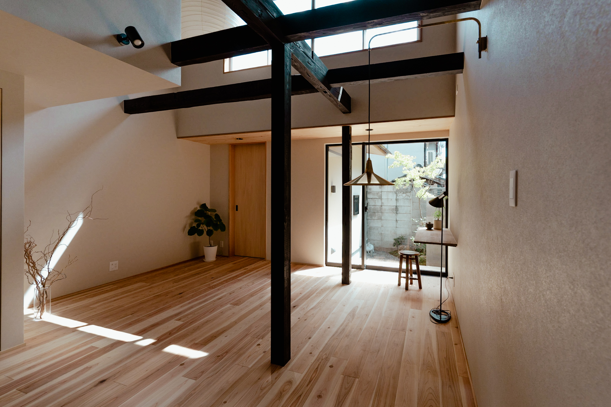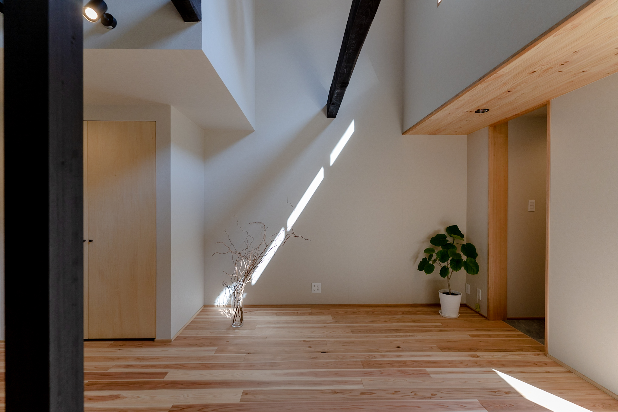 以前は1階に壁が多く、狭さと暗さがありましたが、1階にあった壁を取り払い、広々としたLDKに間取りを変更。また吹き抜けを設けることで、南側からの光と風を取り入れました。吹き抜けには、大きな木製の室内窓を設置し、採光と換気の効率を高めています。