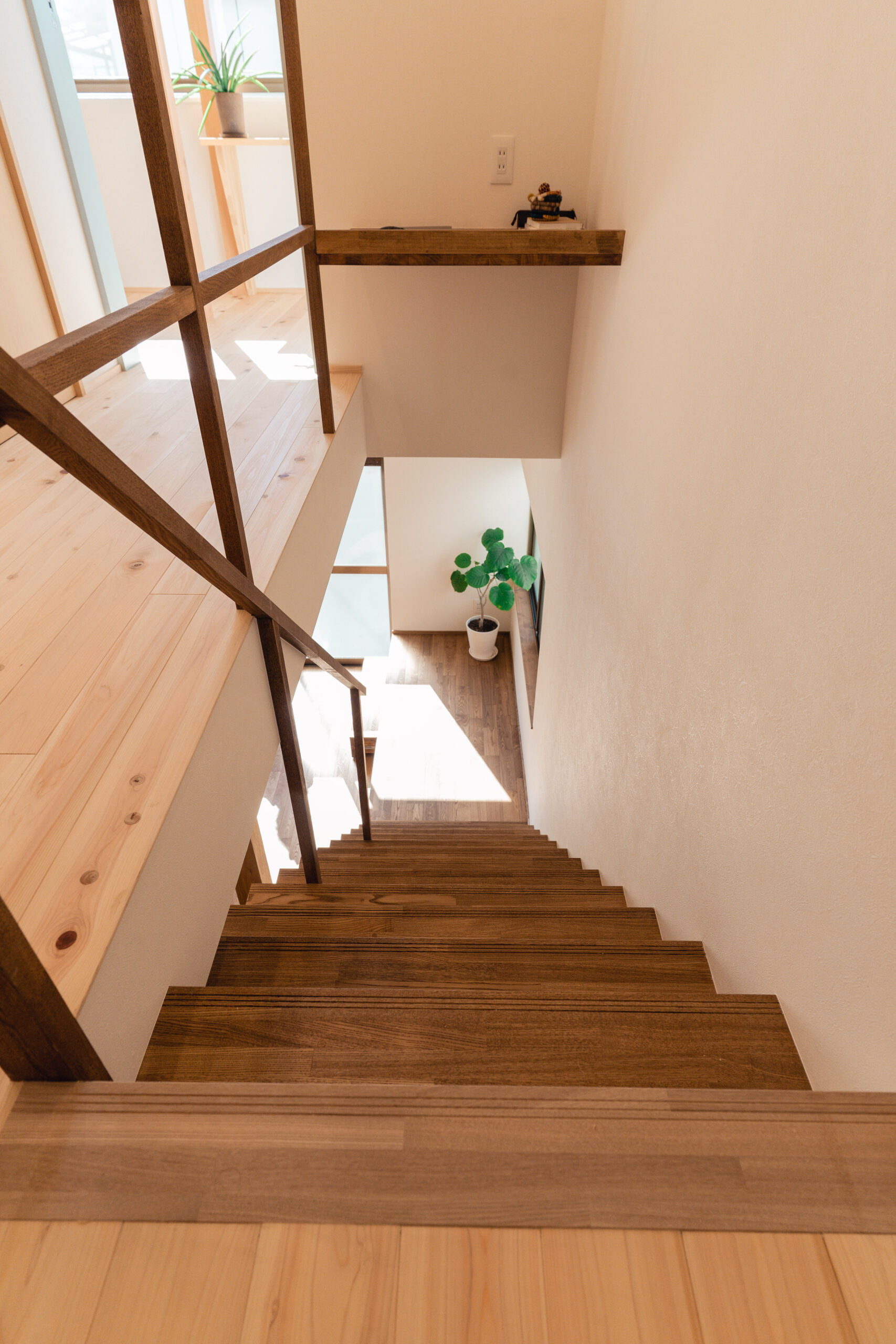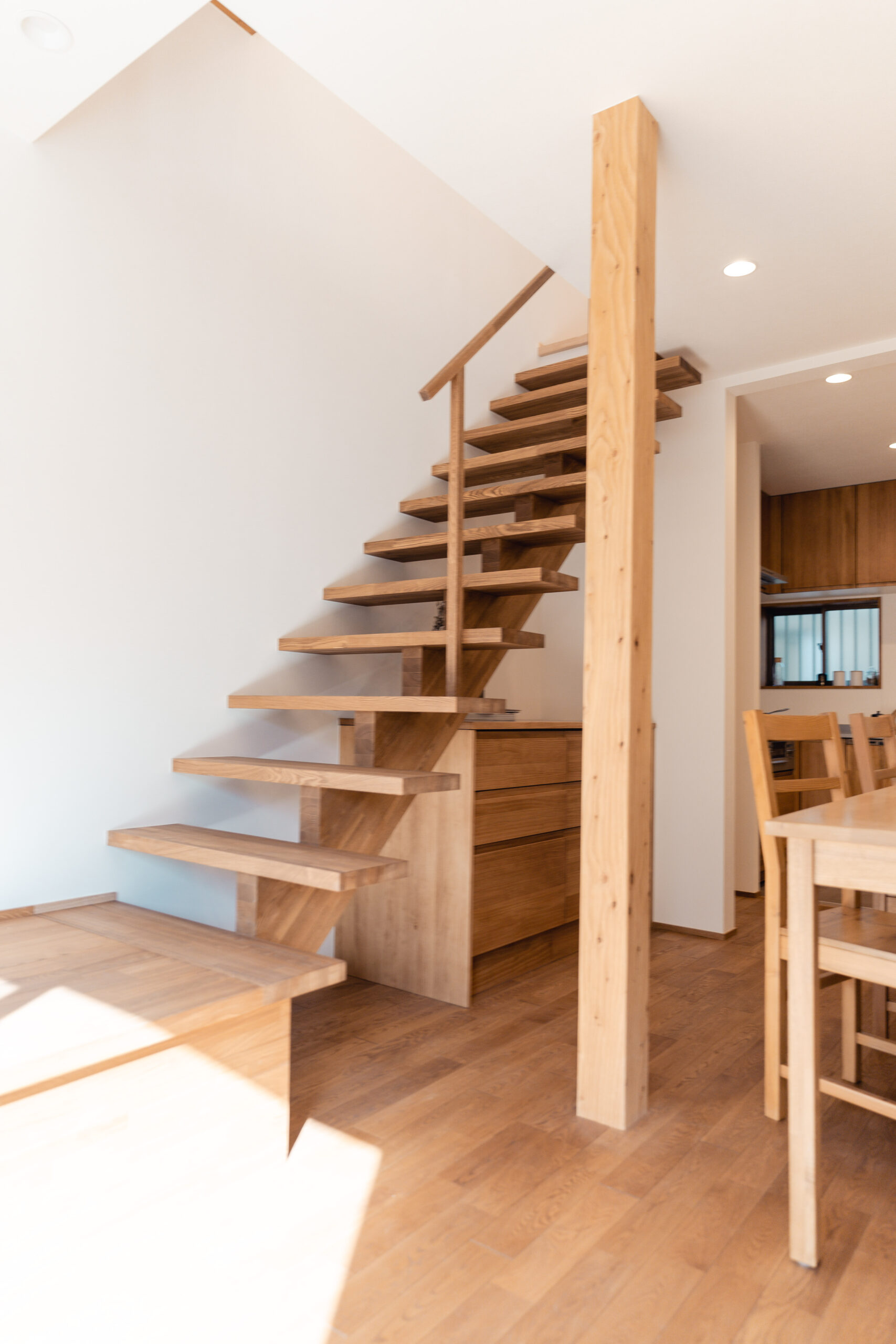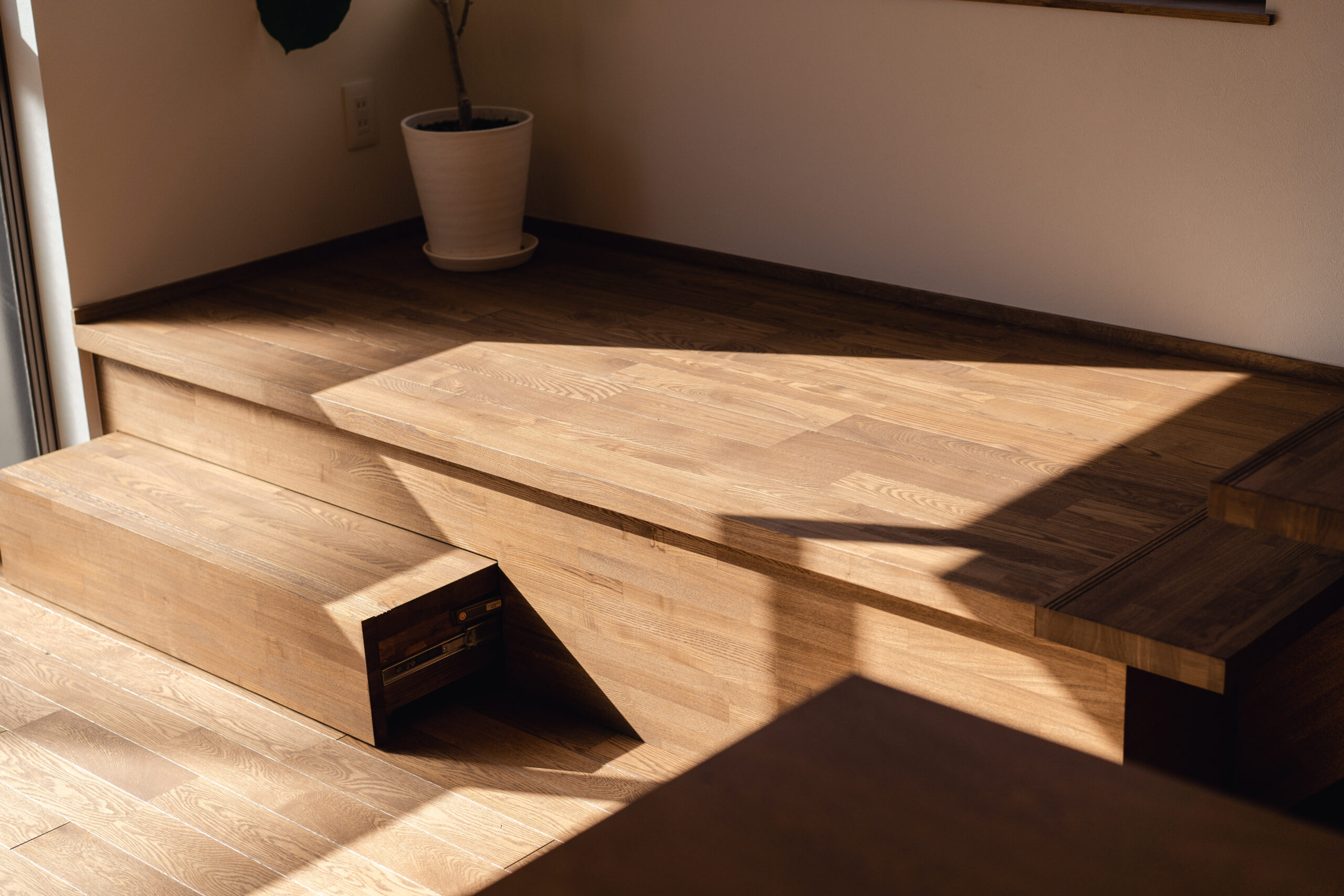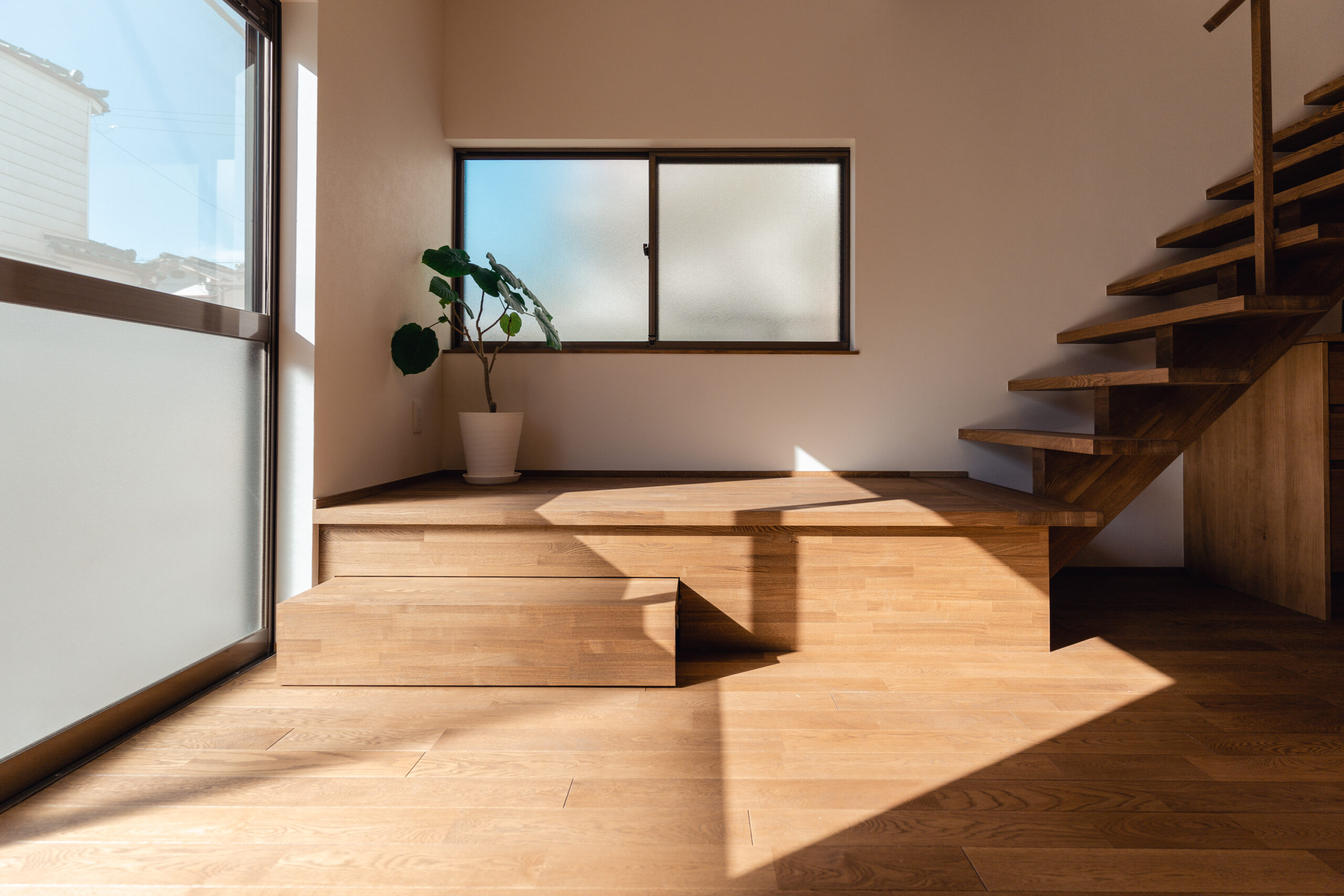 LDKは階段とつながるステップベンチをつくり、陽当たりのいいリビングで寛げる空間に。