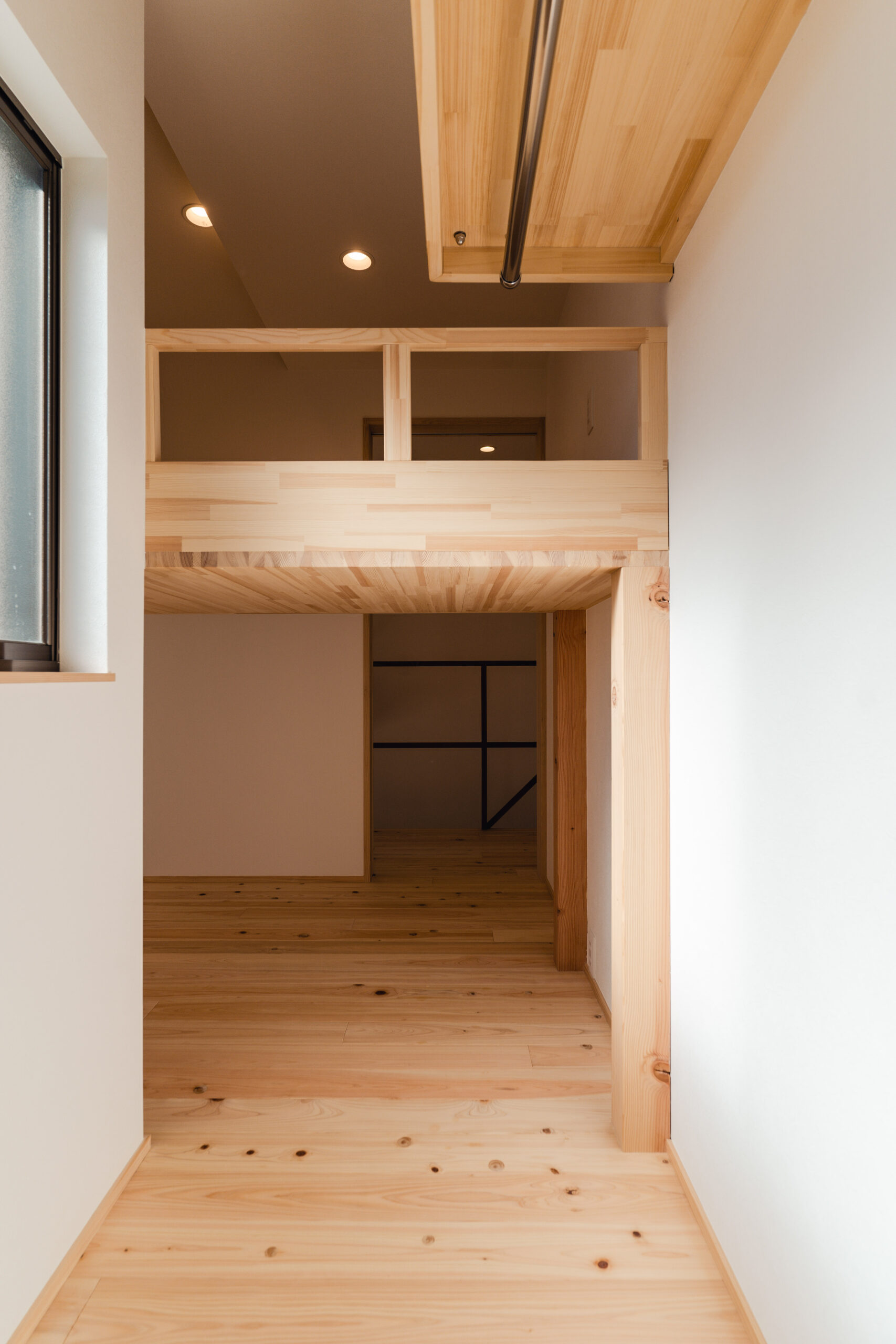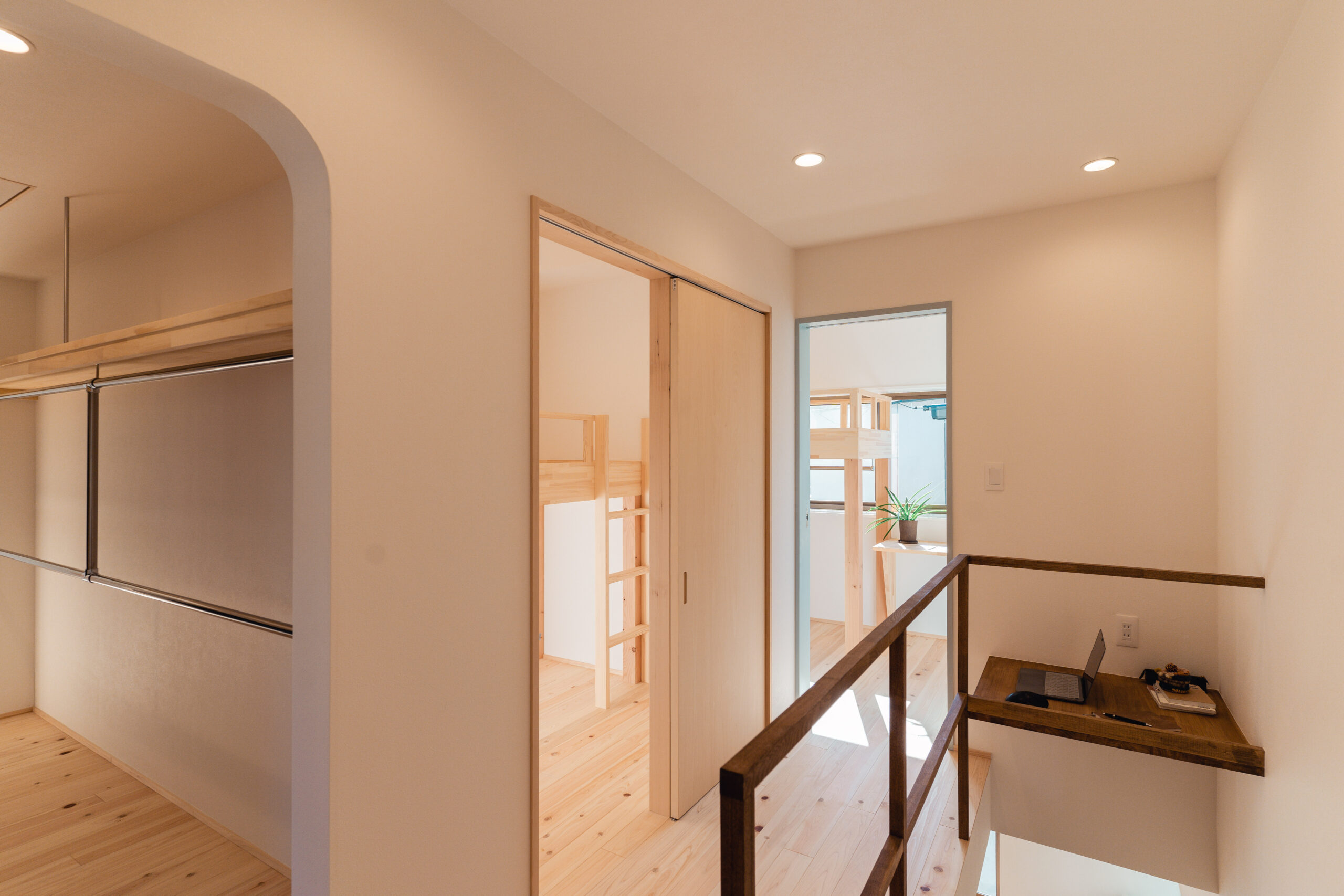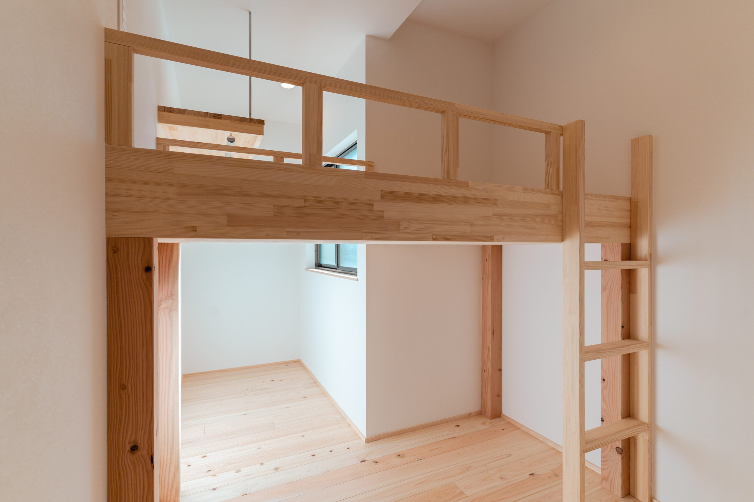 2Fは個々に造作でベッドをつくりました。階段上部の吹き抜けにはテレワーク用のワークスペースをつくりました。