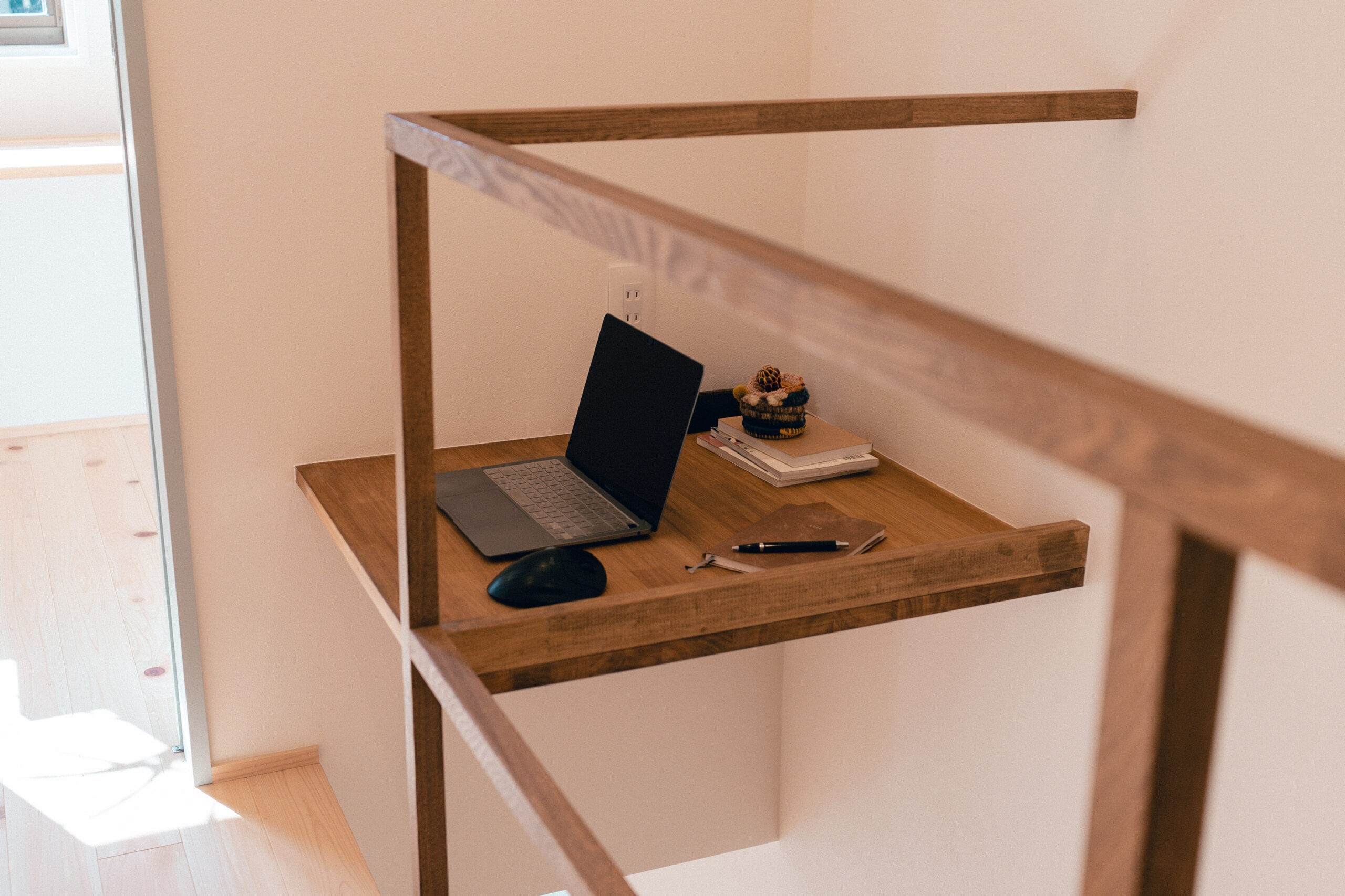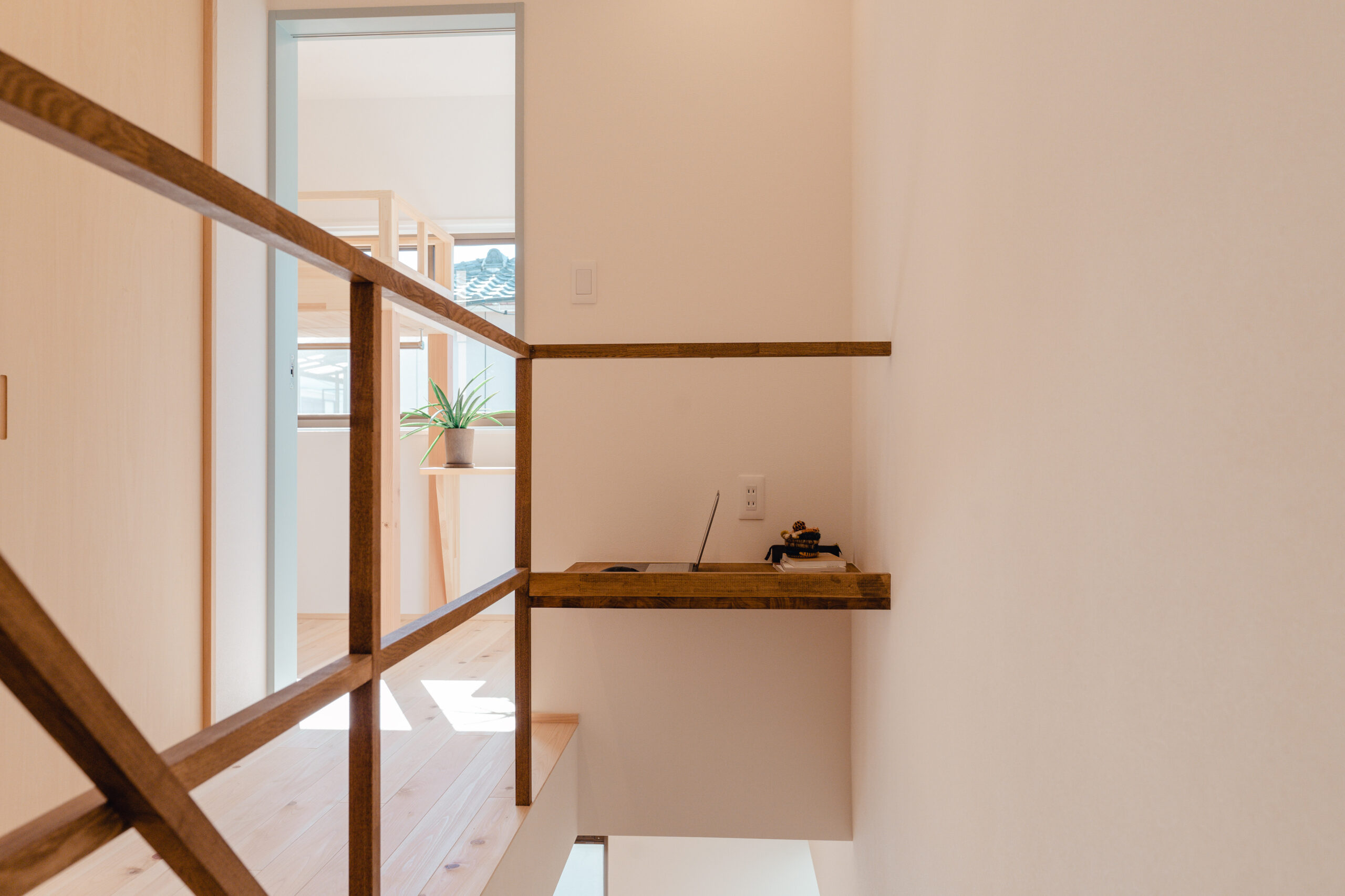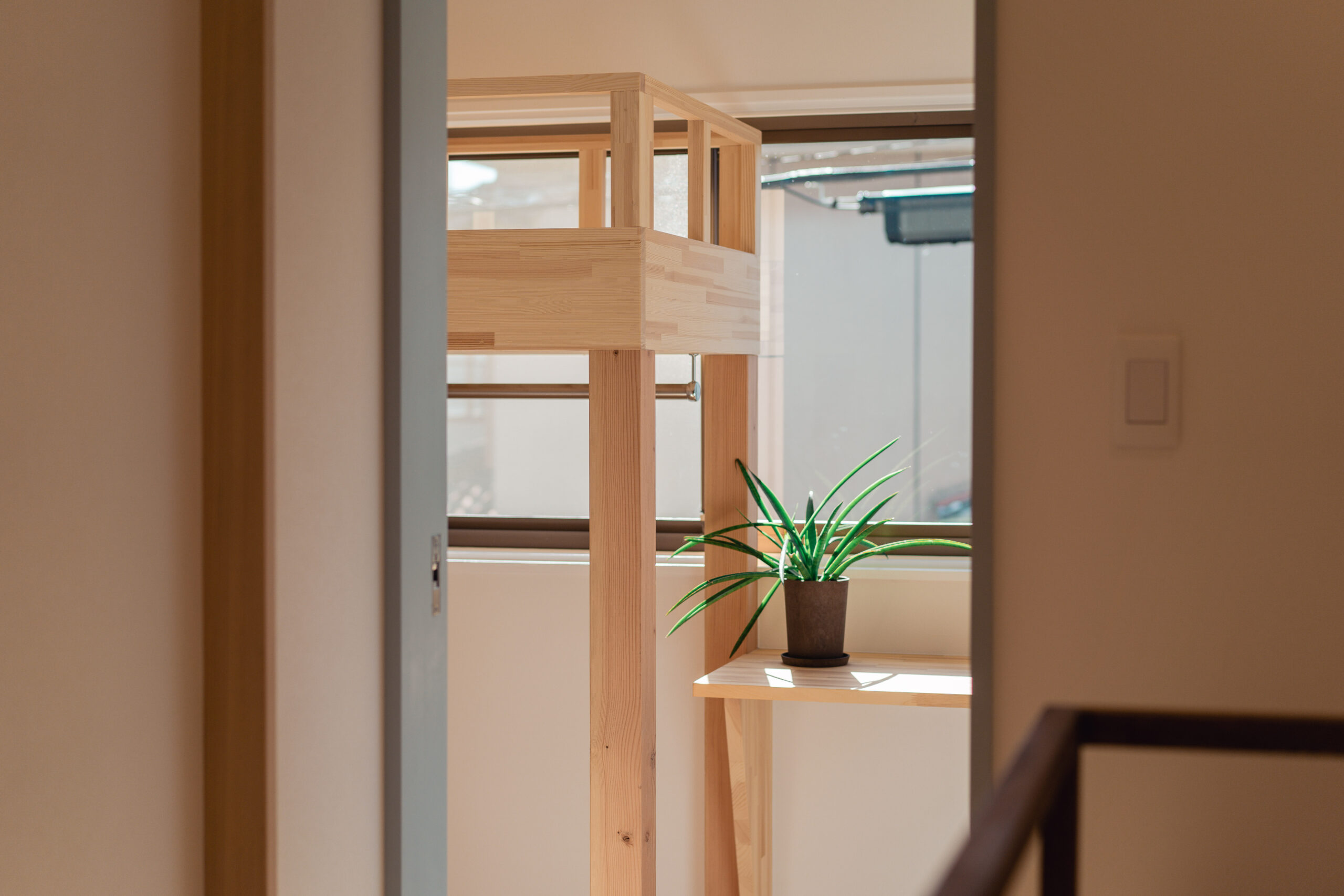 2Fは個々に造作でベッドをつくりました。階段上部の吹き抜けにはテレワーク用のワークスペースをつくりました。
