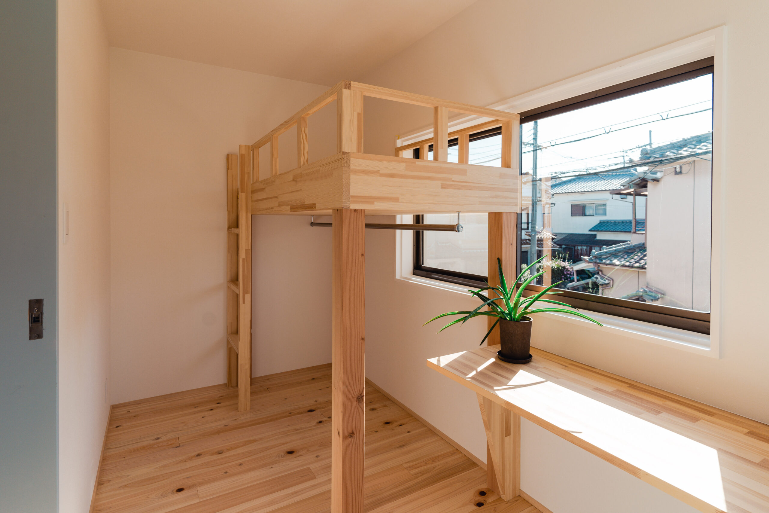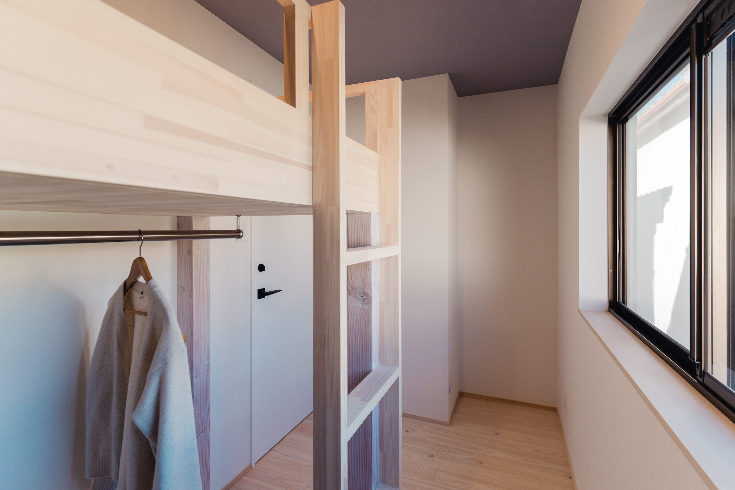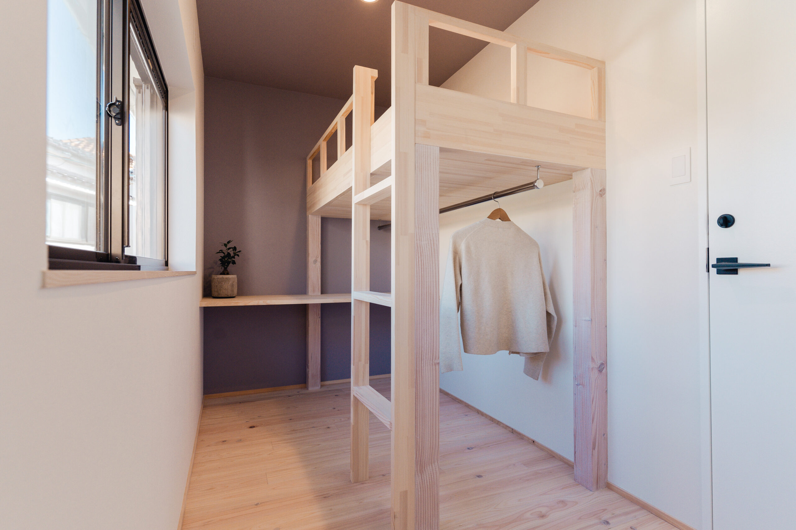 各個室の造作ベッドは空間の活用を最大限に考え、上部はベッド、下部は収納スペースに活用、壁面は部屋に合わせたカウンター机をつくりました。