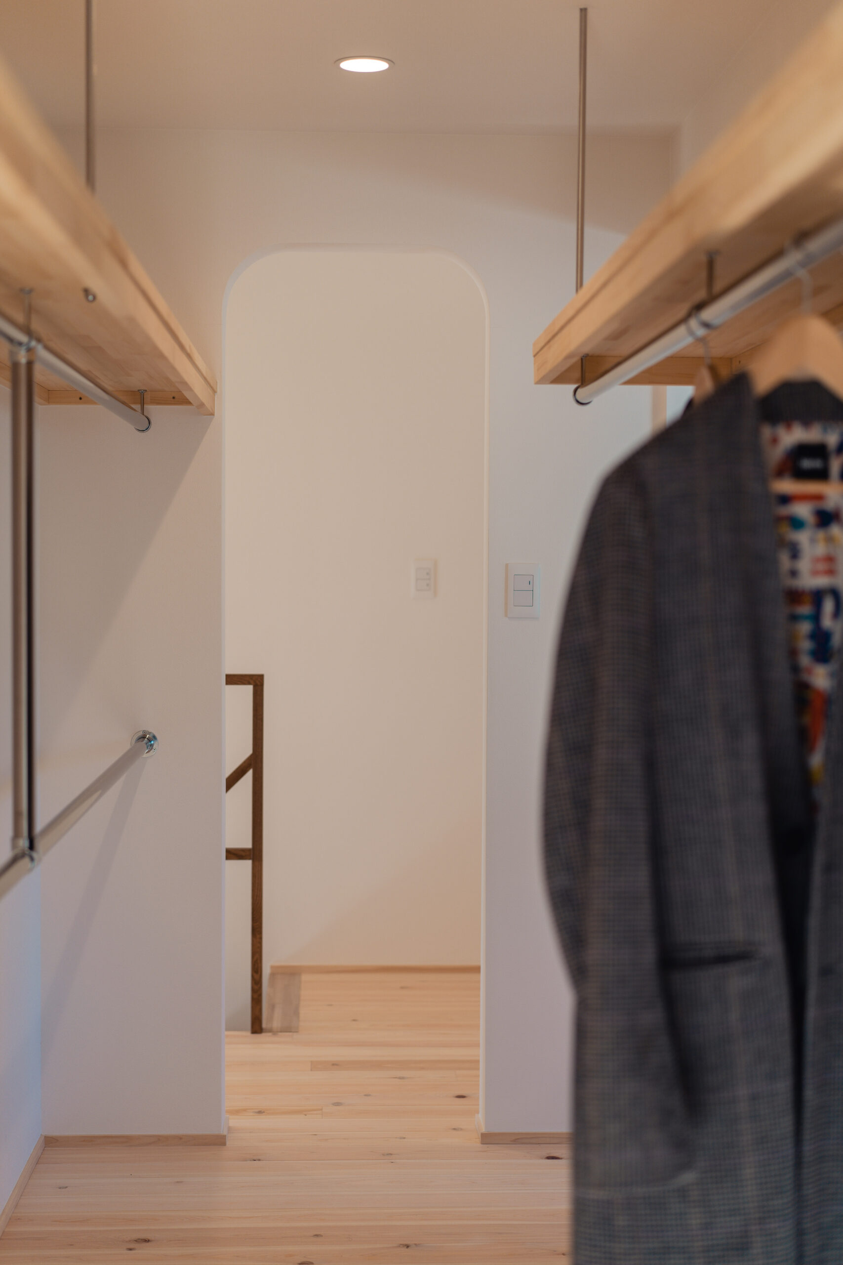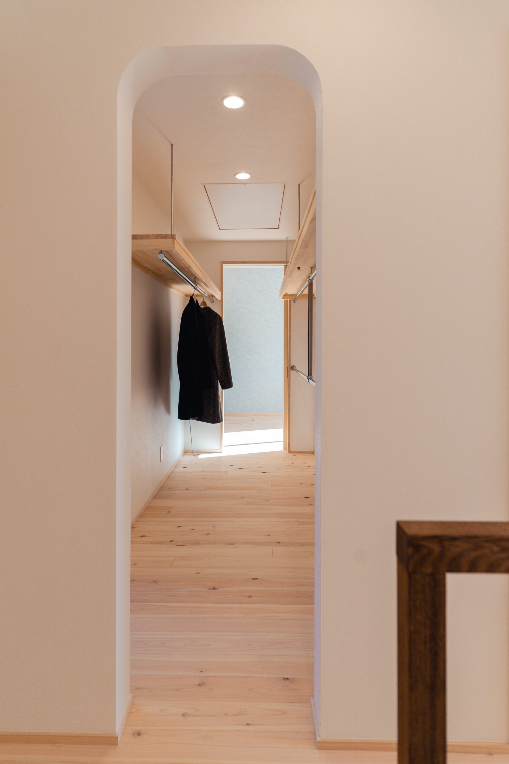 アーチ開口のウォークインクローゼットは女子専用とし、兼用します。ウォークインクローゼットの中に2つのドアがありそれぞれの個室につながっています。