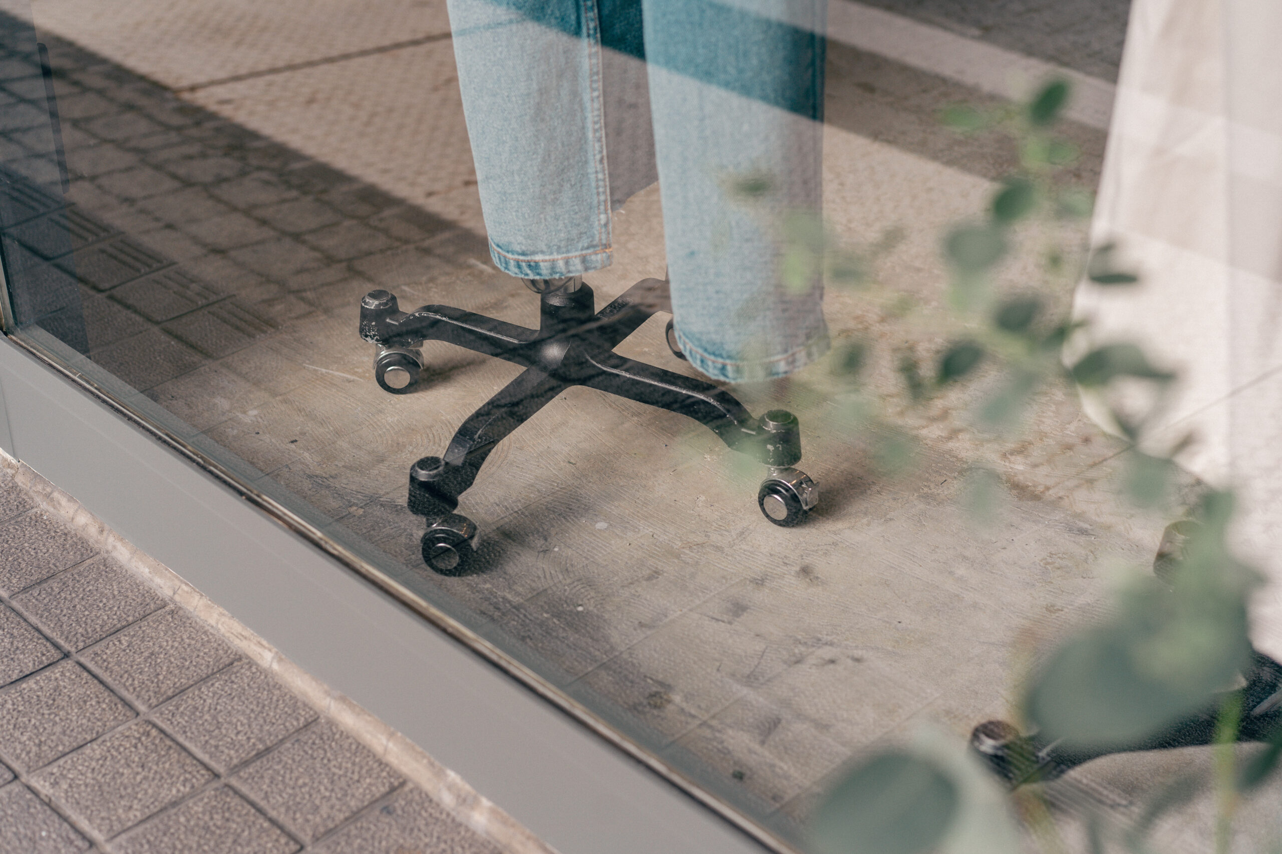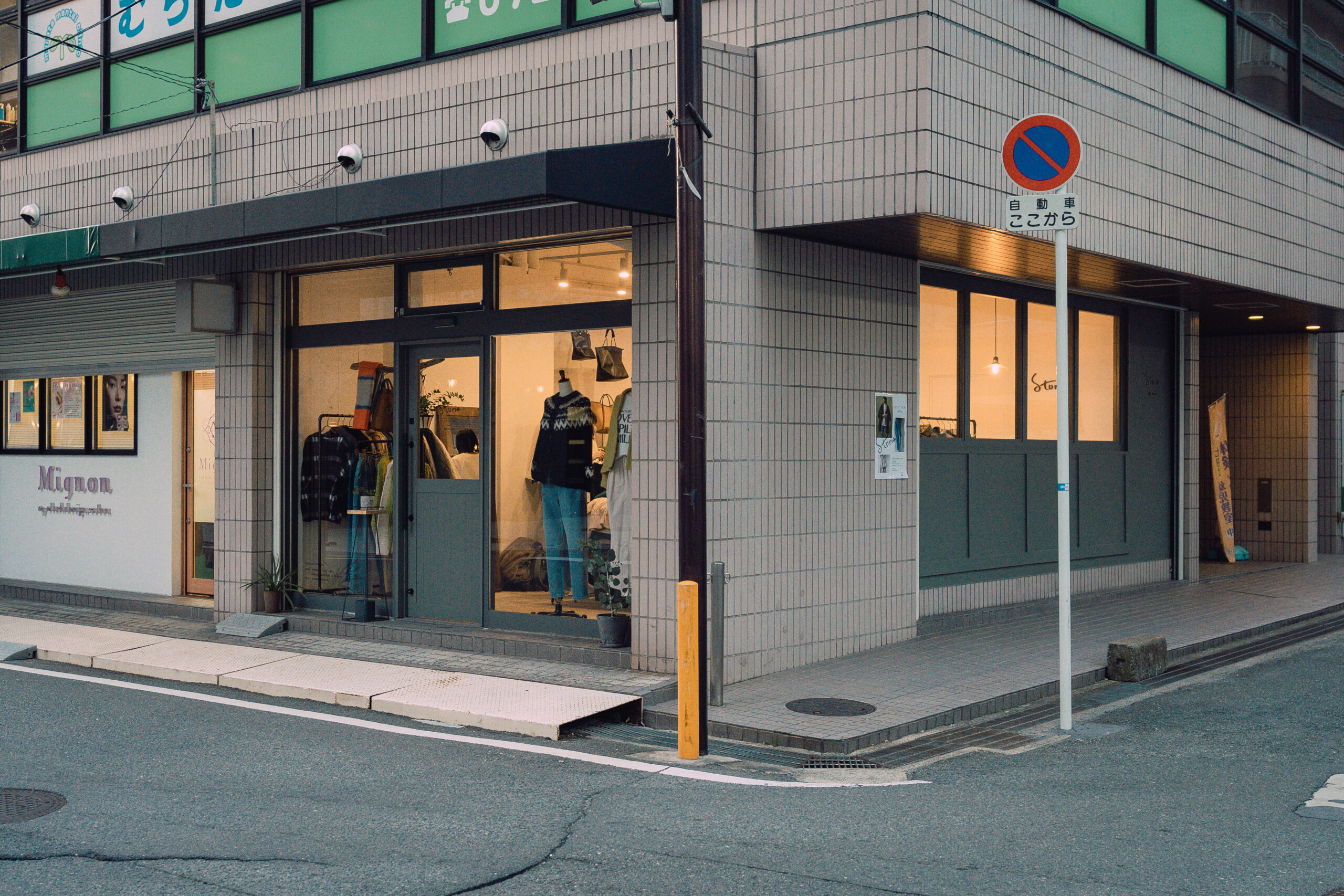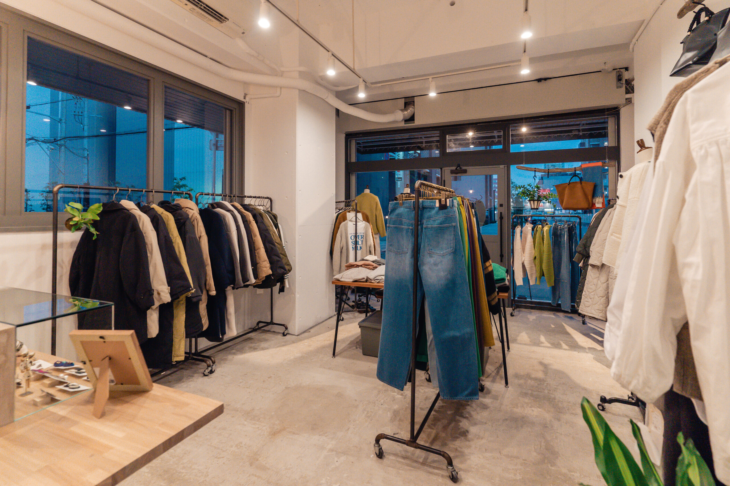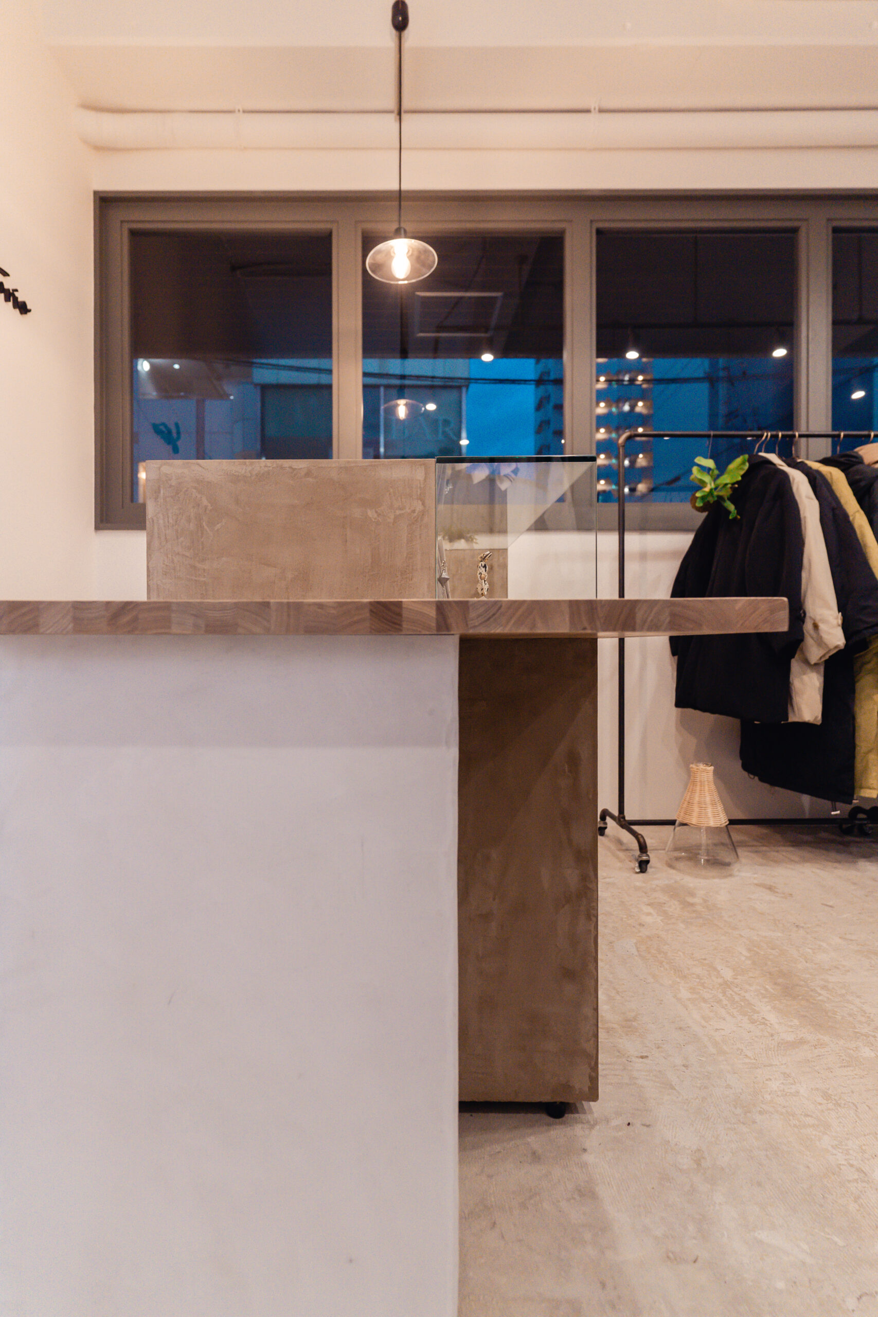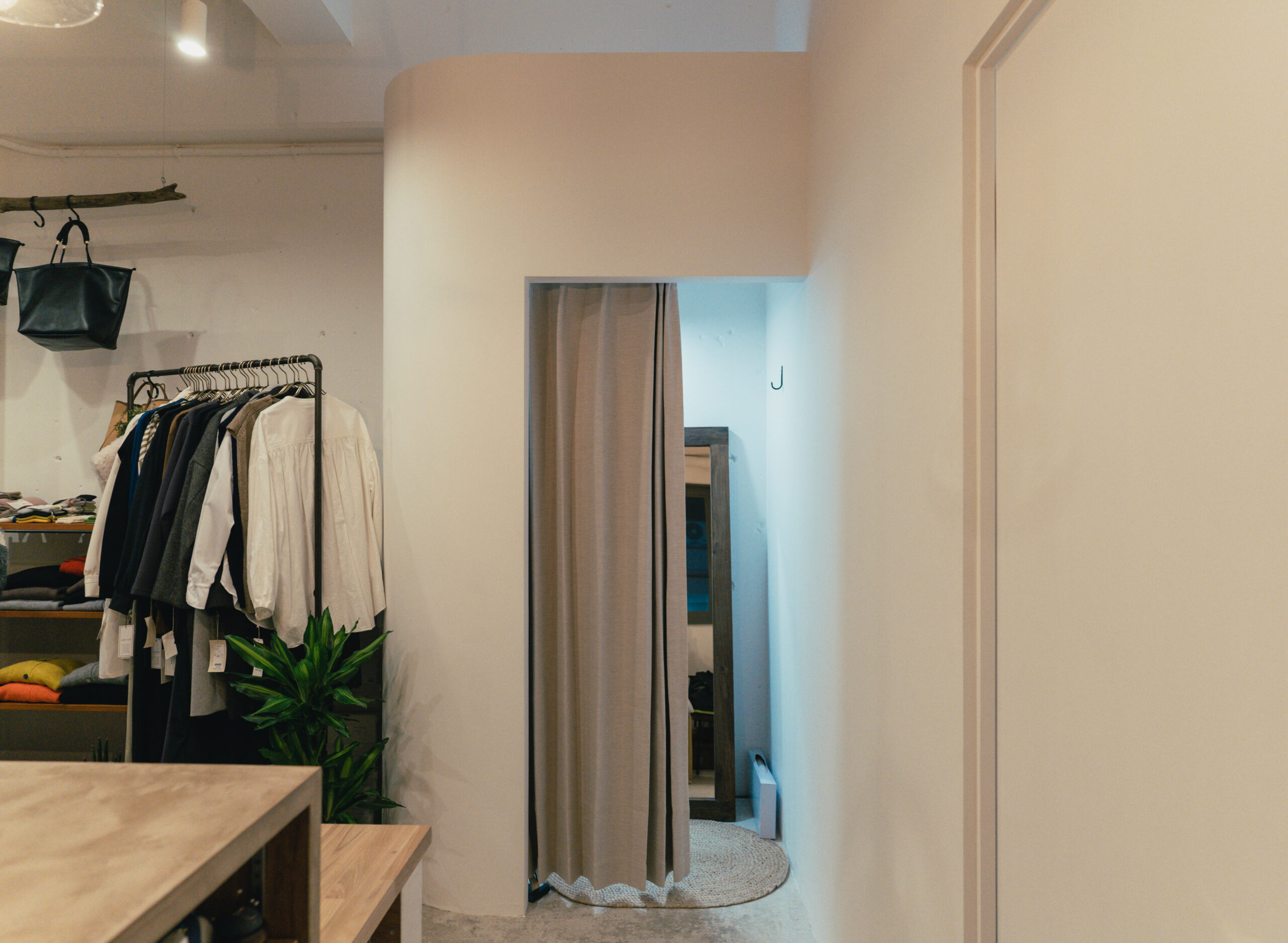 角地という好立地を最大限に活かせるよう、外観は正面だけでなく側面も大開口の窓をつけたデザインとしました。全体をダークグリーンの大人のカラーで統一し、店内はコンクリート剥き出しの真っ白な壁でシンプルに仕上げ、カラフルなお洋服や小物が映えるようにしました。