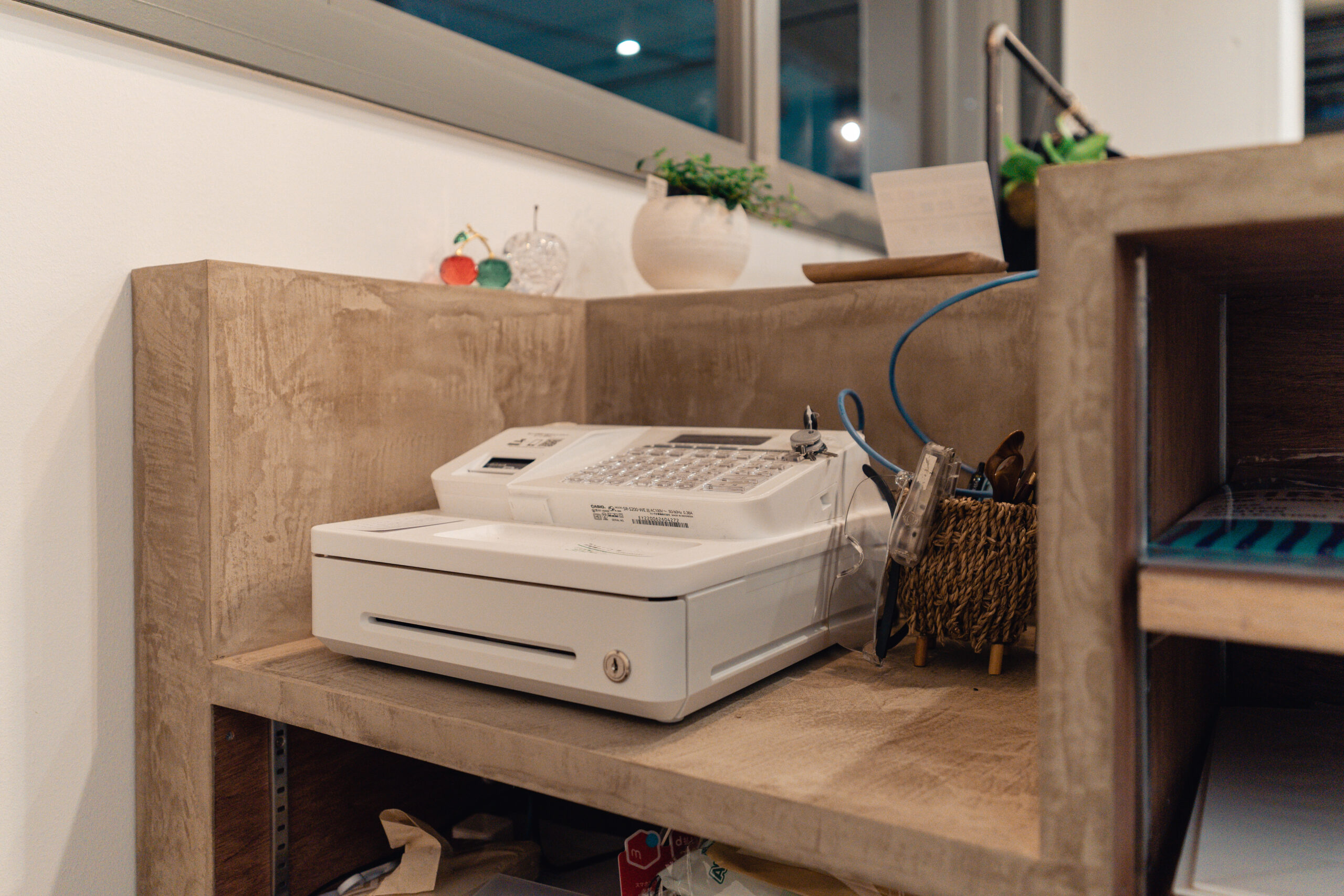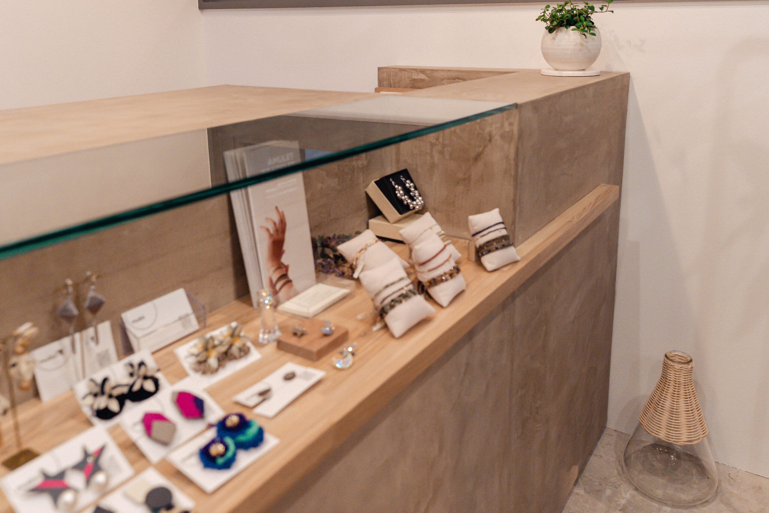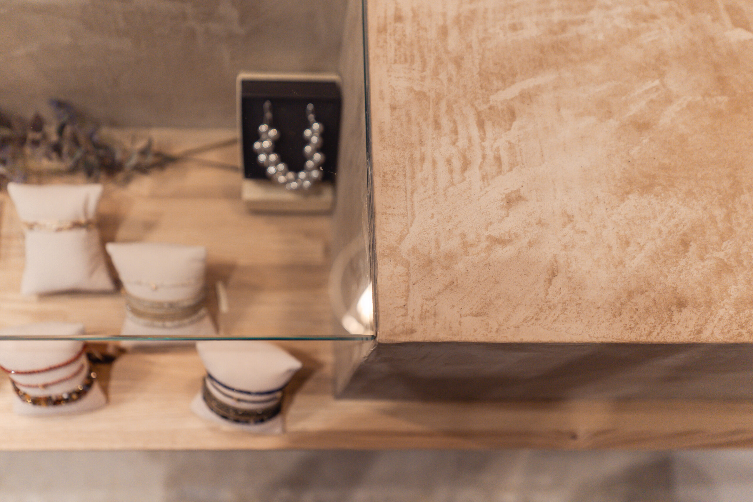 造作レジ台は正面にアクセサリーを置けるガラスのショーケース、正面からはスッキリとしたデザインになるようレジを置く部分だけ凹ませています。木とガラスとモールテックスの3つの素材を使った唯一無二のデザインに仕上げています。また、商品のバッグは吊るせるよう流木を利用したディスプレイとしました。
