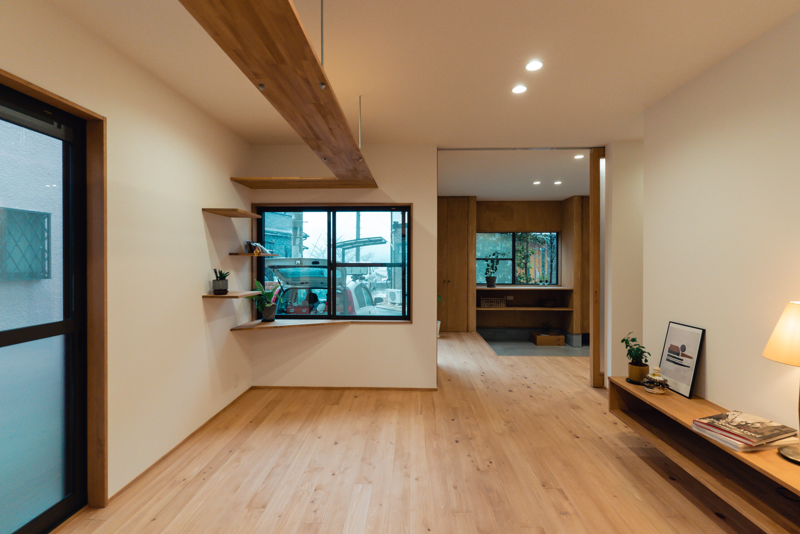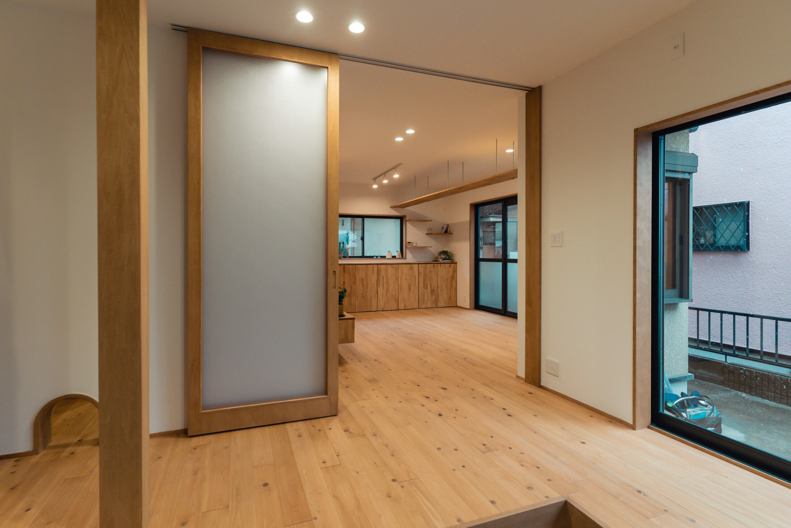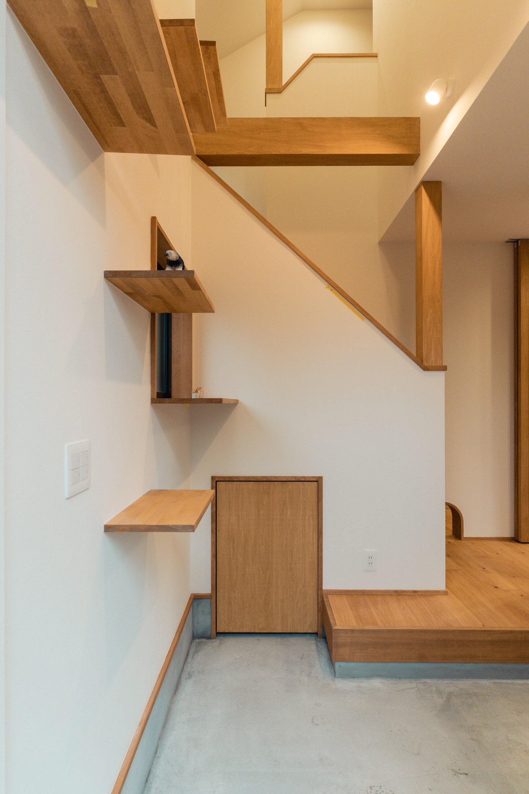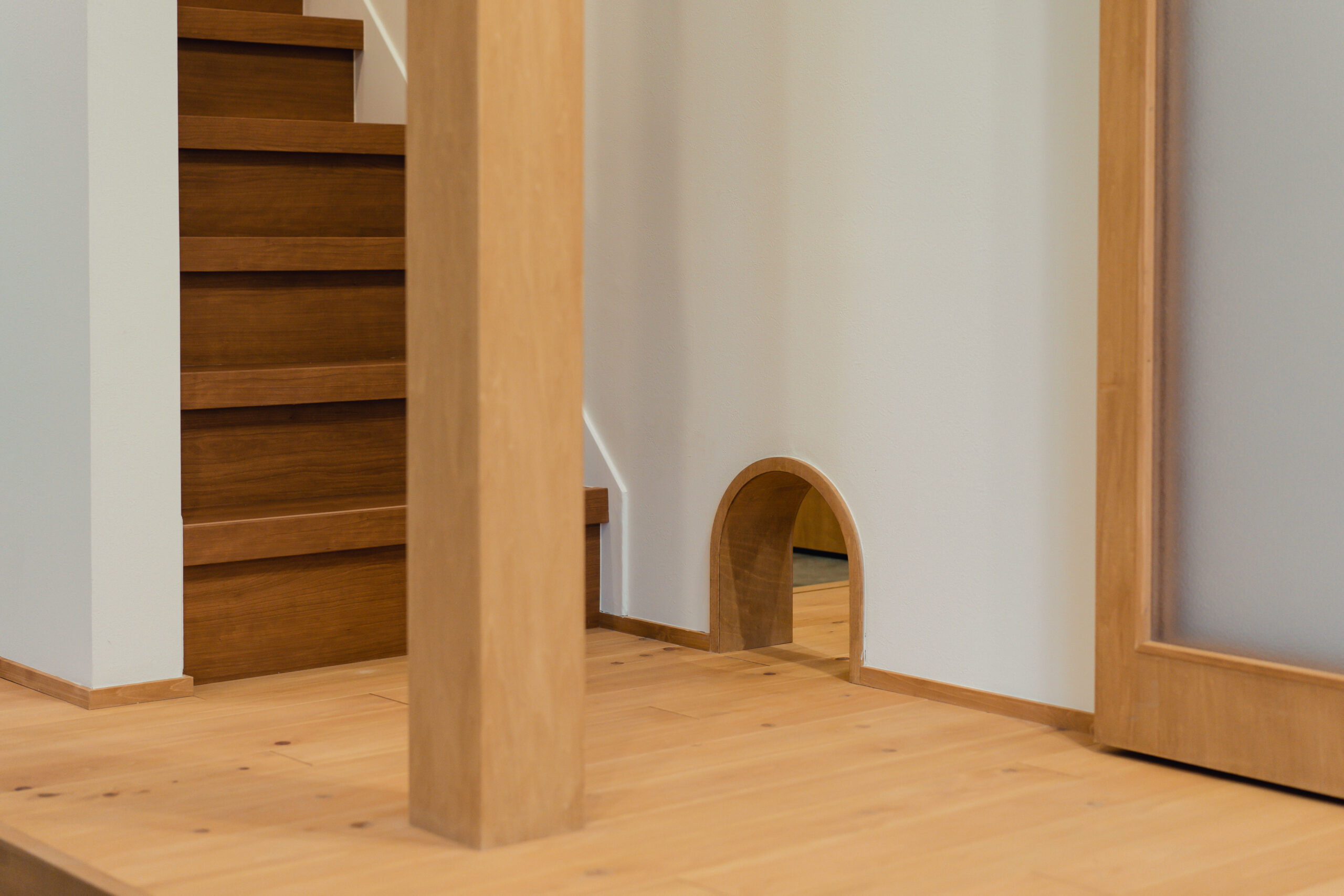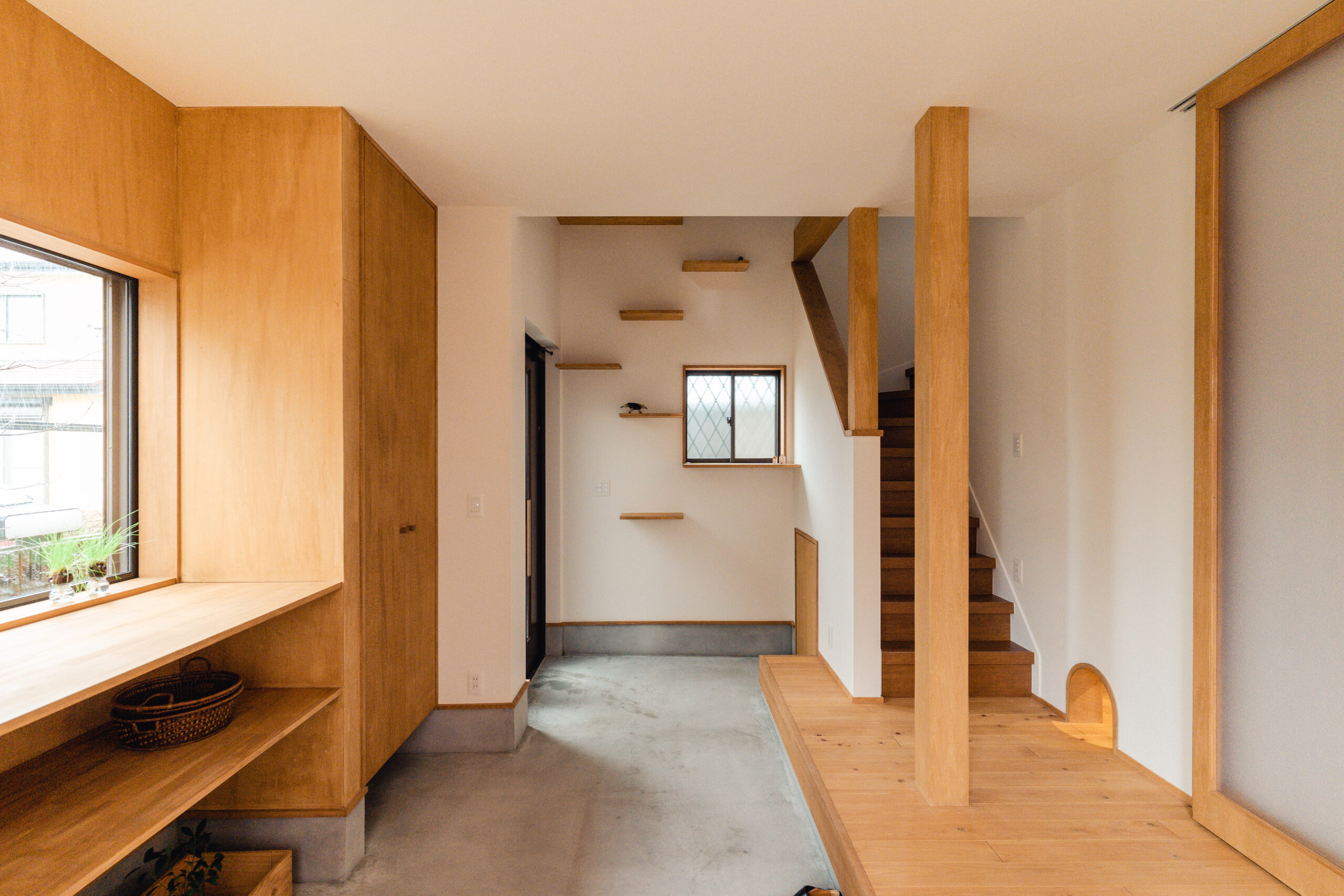 1階は元々和室だった部分を広々とした土間兼セカンドリビングに。土間空間でありながらリビングから続きの板間も広く確保し縁側のようなつくりにすることで、ここでもゆっくり寛いだりと多様な使い方が出来るようにしました。LDKの引戸をあけると土間と一体となり、より一層開放的に感じられます。キャンプも好きな施主様、キャンプ用品も収納できるよう収納スペースもたっぷりととりました。また、玄関からの猫用ステップは二階のベッドルームまで繋がる動線に。あらゆる場所にステップや猫穴があるため、愛猫も自由に好きな場所を見つけて寛げます。床は、猫の足にも優しい無垢フローリングのヒノキを使用しています。