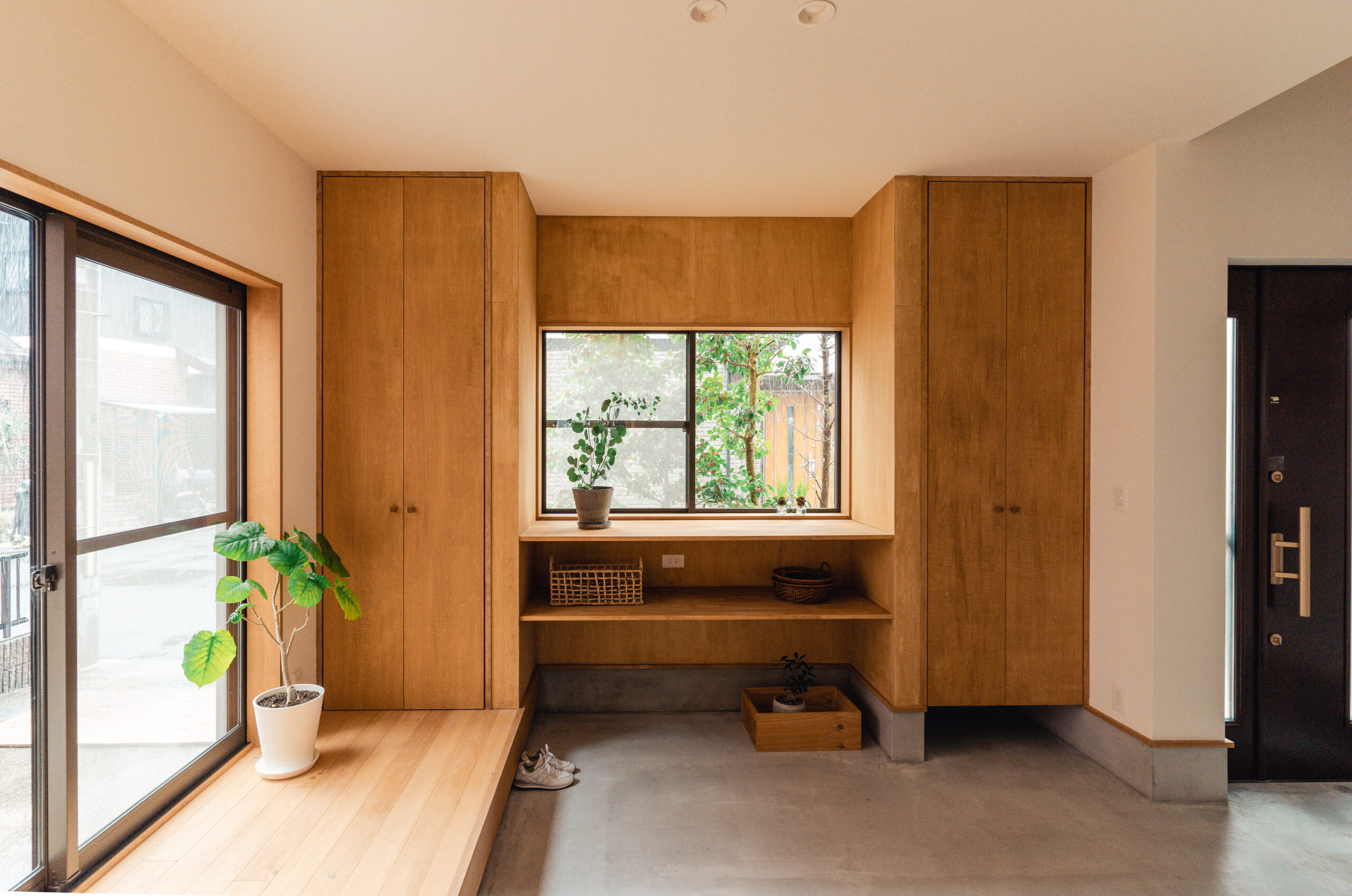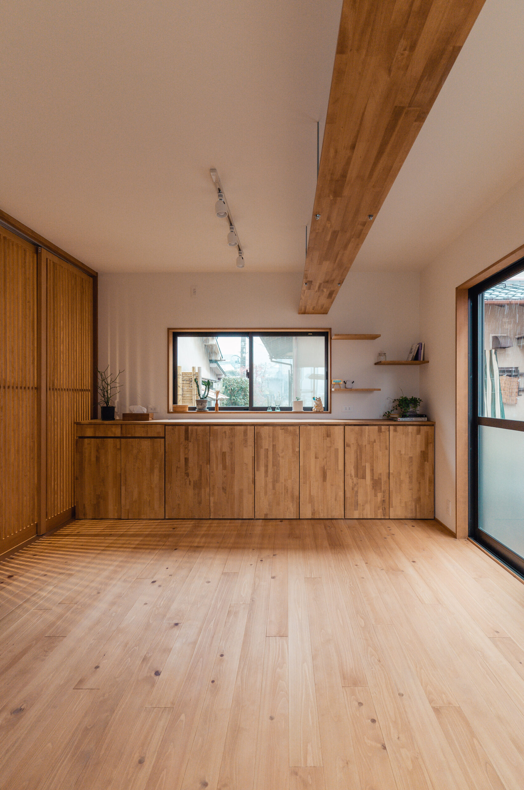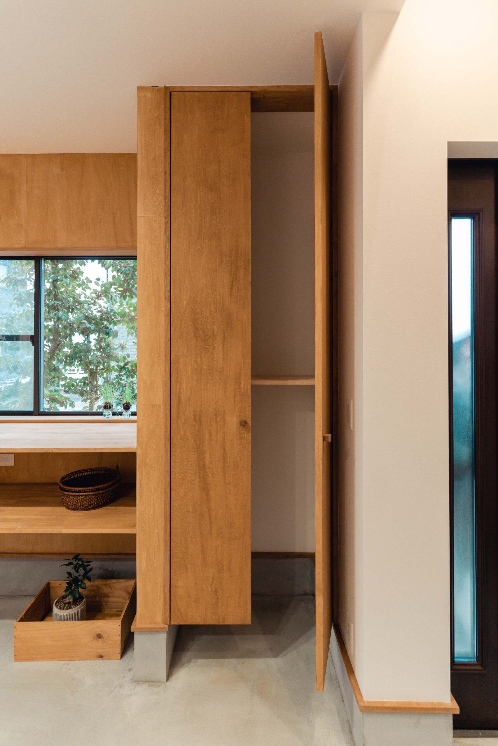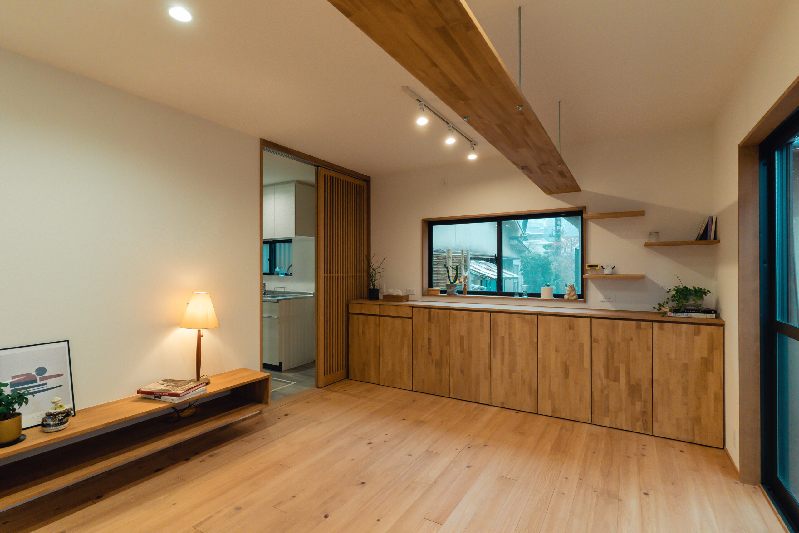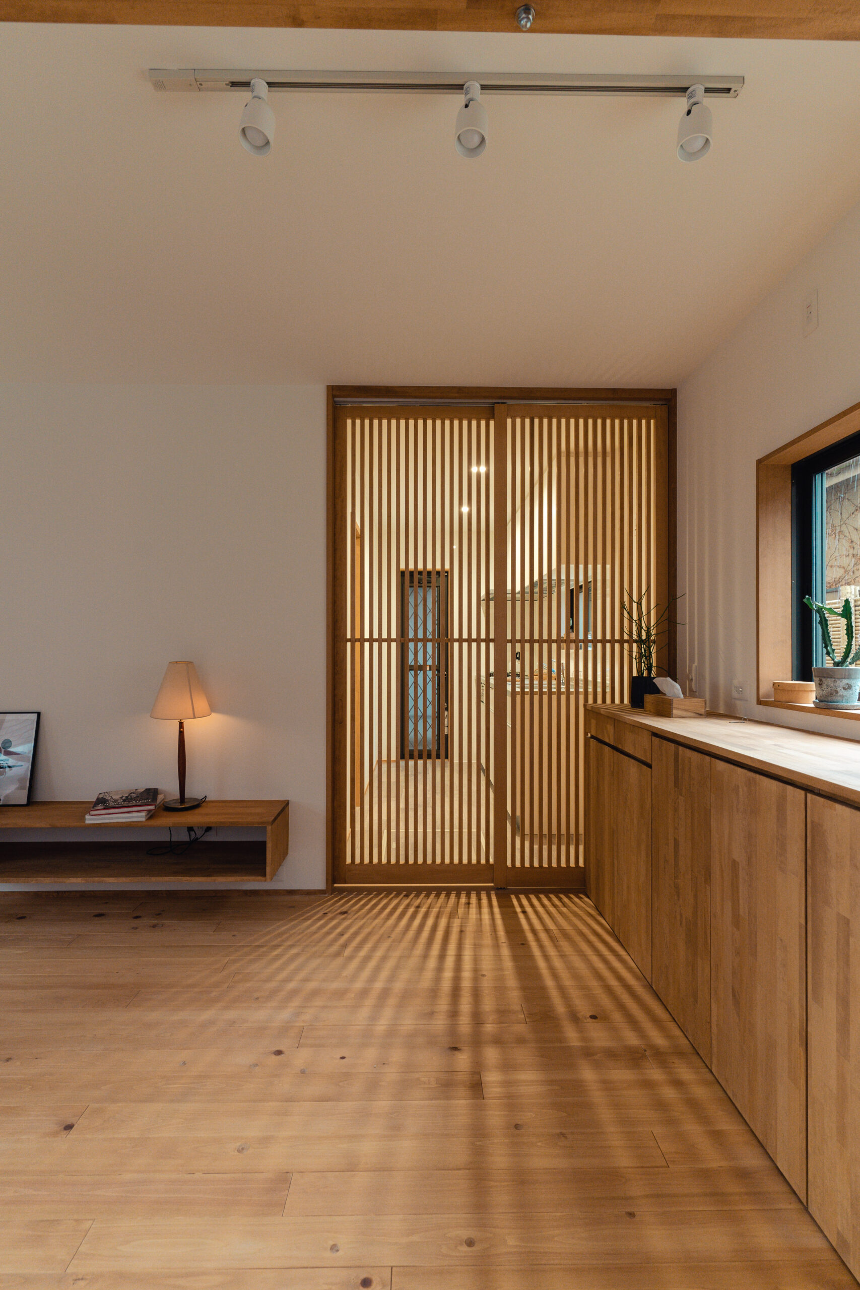 1階は元々和室だった部分を広々とした土間兼セカンドリビングに。土間空間でありながらリビングから続きの板間も広く確保し縁側のようなつくりにすることで、ここでもゆっくり寛いだりと多様な使い方が出来るようにしました。LDKの引戸をあけると土間と一体となり、より一層開放的に感じられます。キャンプも好きな施主様、キャンプ用品も収納できるよう収納スペースもたっぷりととりました。また、玄関からの猫用ステップは二階のベッドルームまで繋がる動線に。あらゆる場所にステップや猫穴があるため、愛猫も自由に好きな場所を見つけて寛げます。床は、猫の足にも優しい無垢フローリングのヒノキを使用しています。