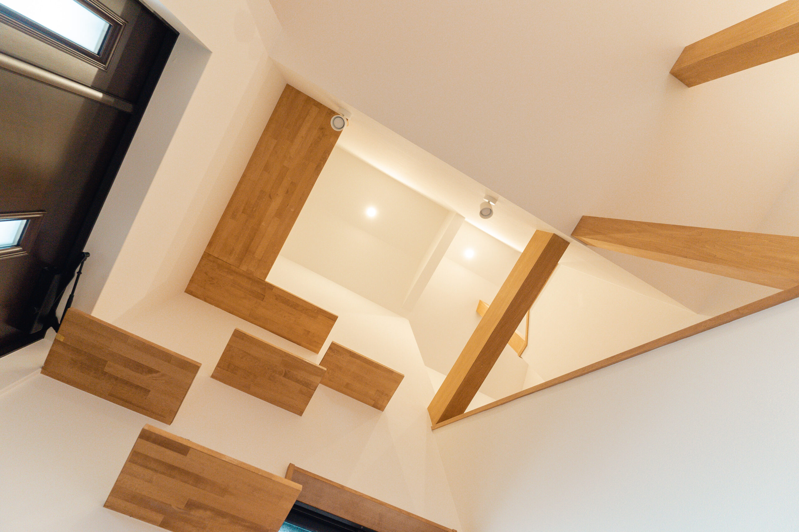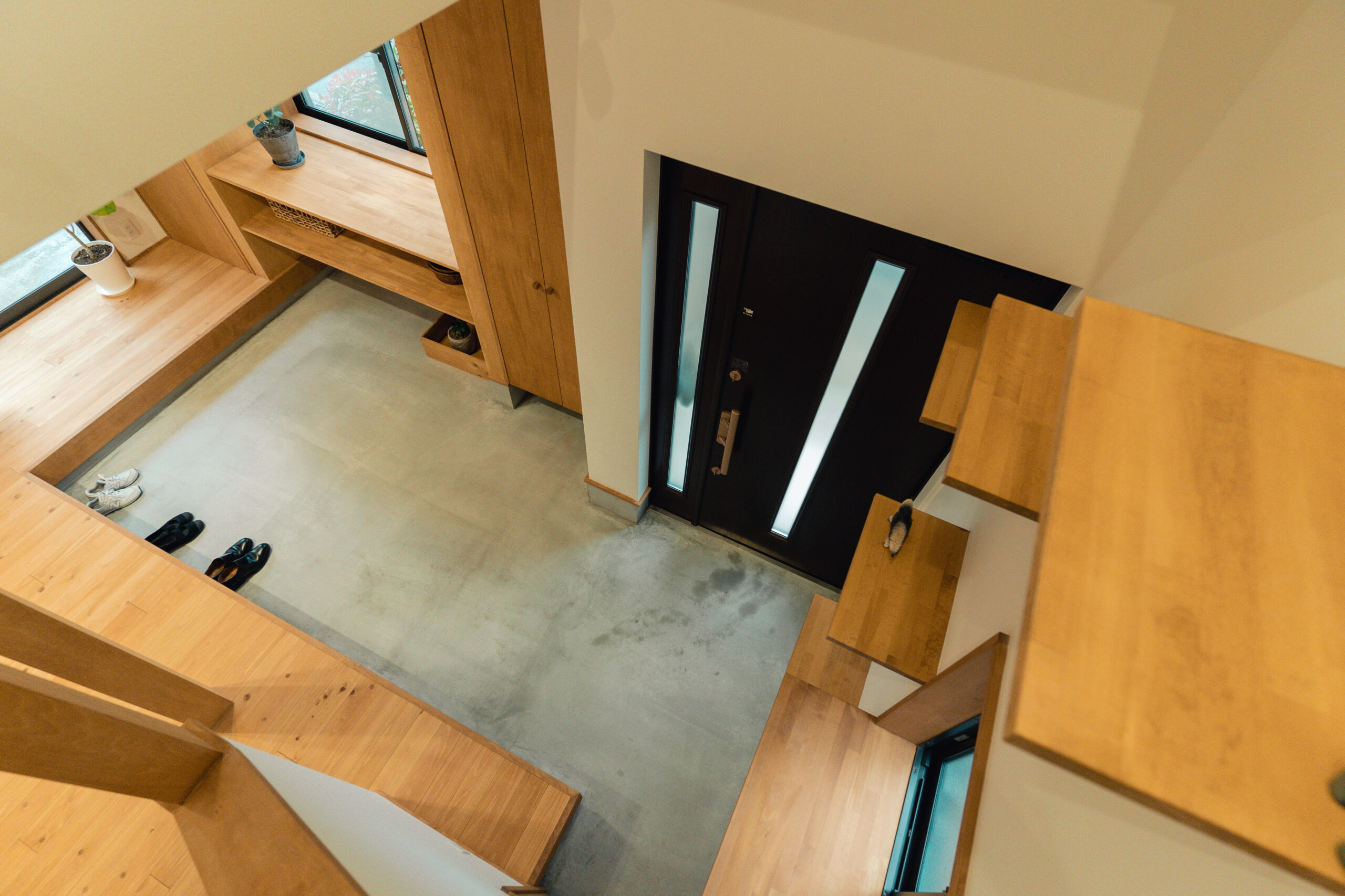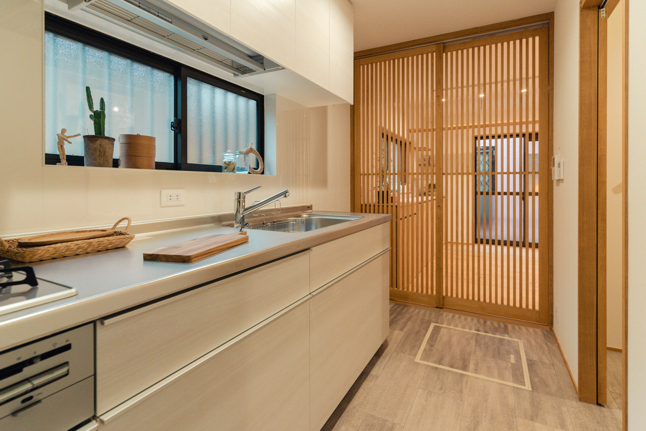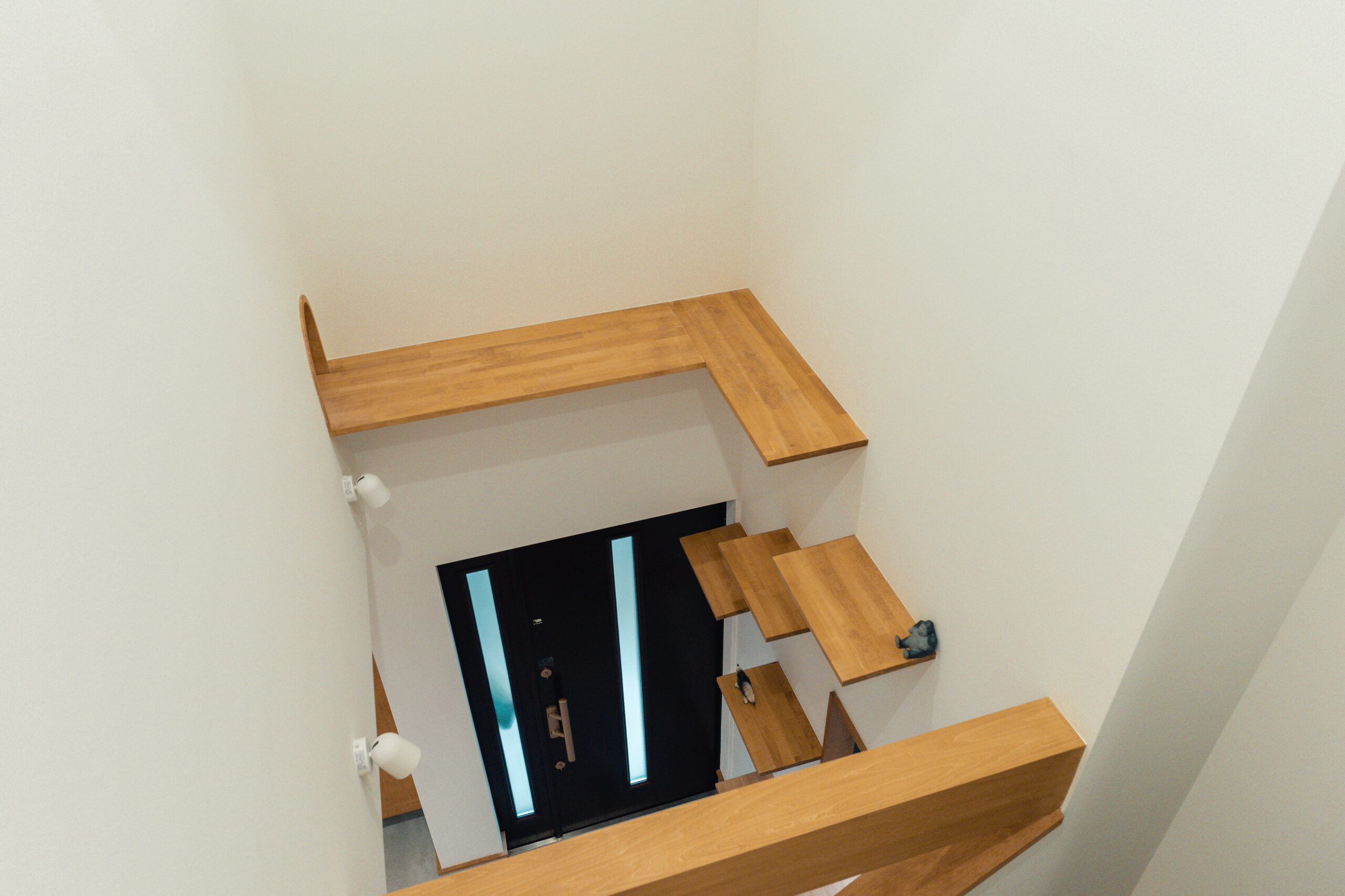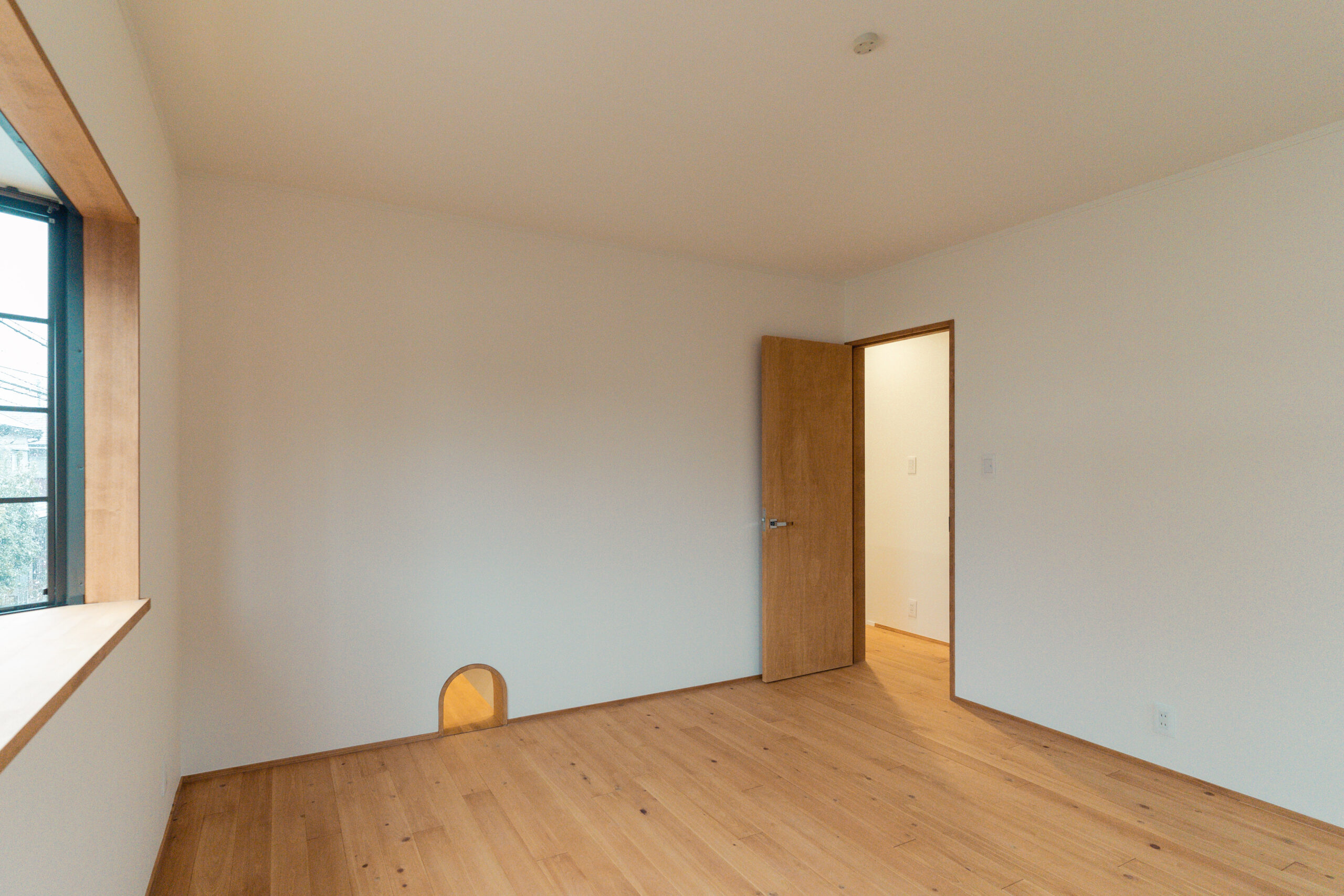 1階は元々和室だった部分を広々とした土間兼セカンドリビングに。土間空間でありながらリビングから続きの板間も広く確保し縁側のようなつくりにすることで、ここでもゆっくり寛いだりと多様な使い方が出来るようにしました。LDKの引戸をあけると土間と一体となり、より一層開放的に感じられます。キャンプも好きな施主様、キャンプ用品も収納できるよう収納スペースもたっぷりととりました。また、玄関からの猫用ステップは二階のベッドルームまで繋がる動線に。あらゆる場所にステップや猫穴があるため、愛猫も自由に好きな場所を見つけて寛げます。床は、猫の足にも優しい無垢フローリングのヒノキを使用しています。
