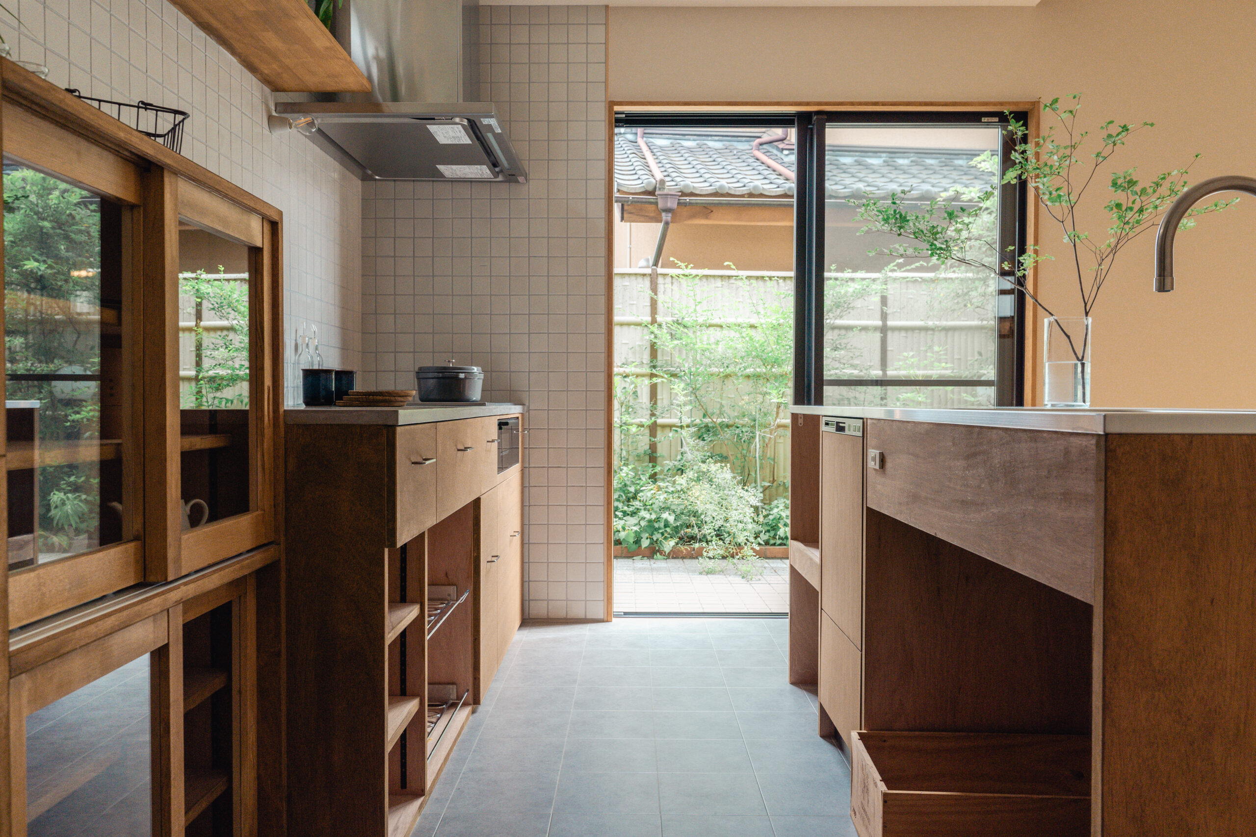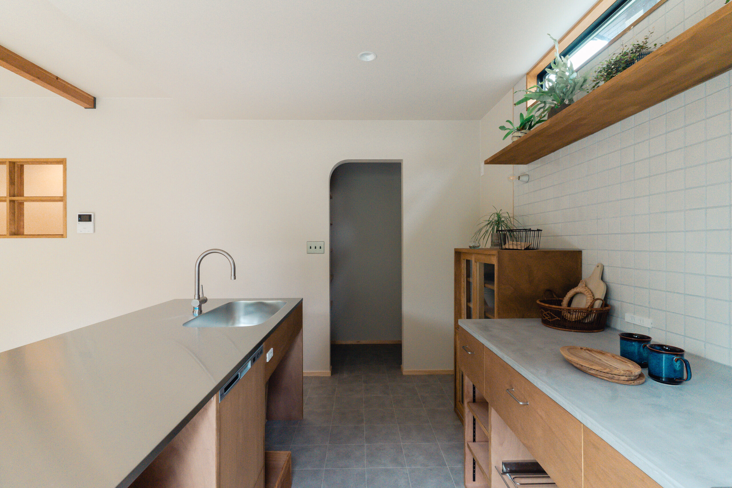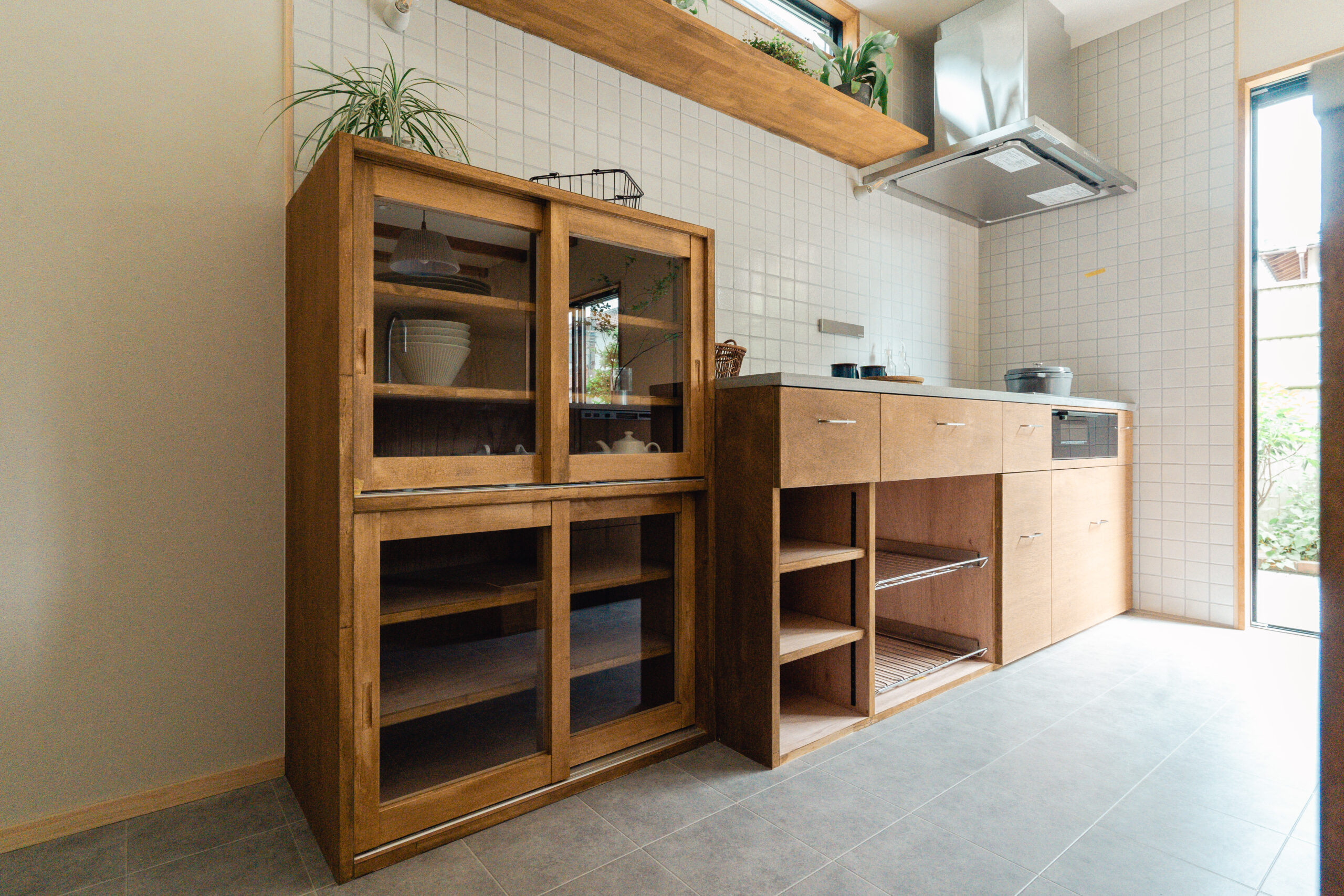 キッチン(食洗機付き)と食器棚は共に造作、Ⅱ型キッチンとし天板の片方はモールテックス、もう一方はステンレス。温かみのあるスタイリッシュなキッチンとなりました。キッチンからはLDKと庭が両方見渡せ、お子様の様子を見ながら家事をすることができます。