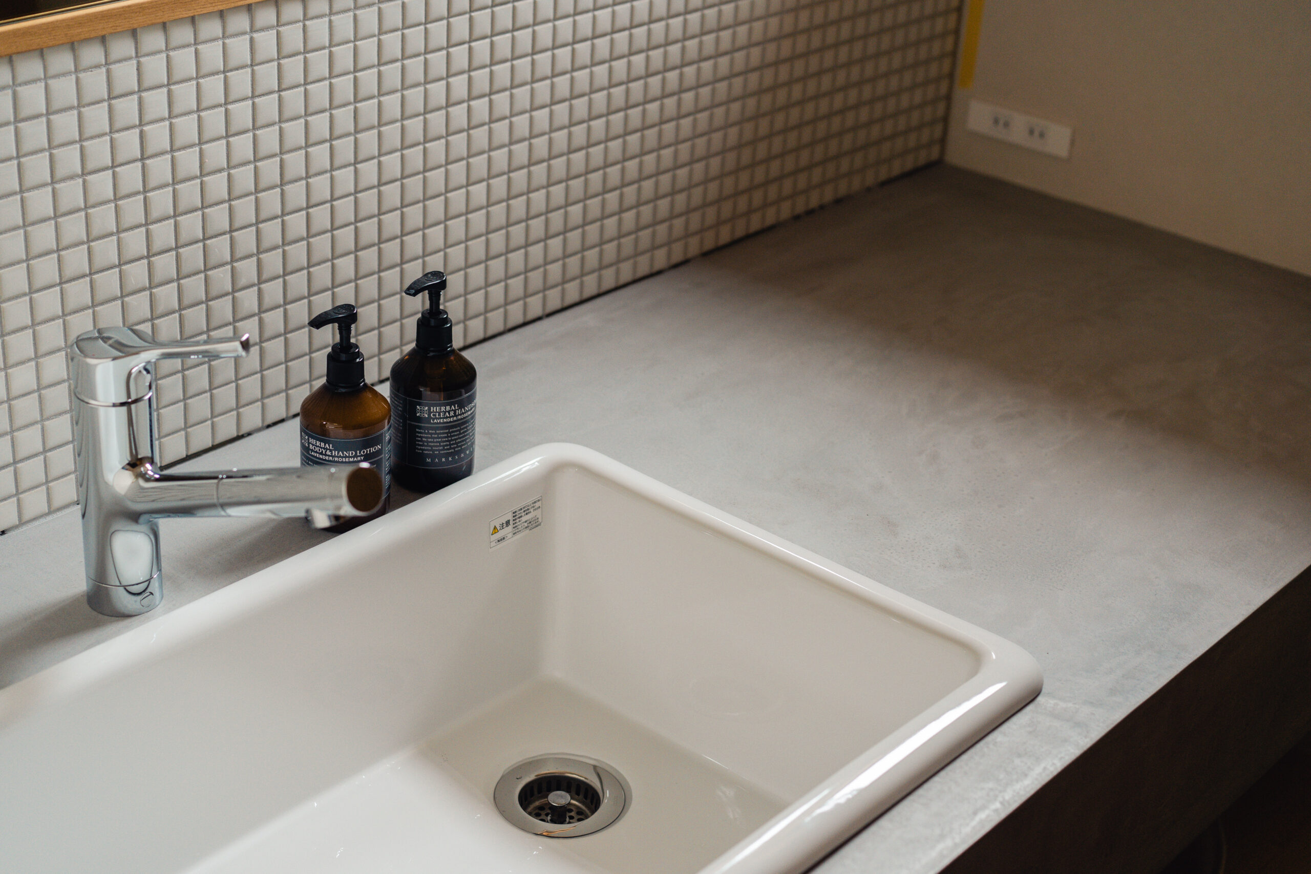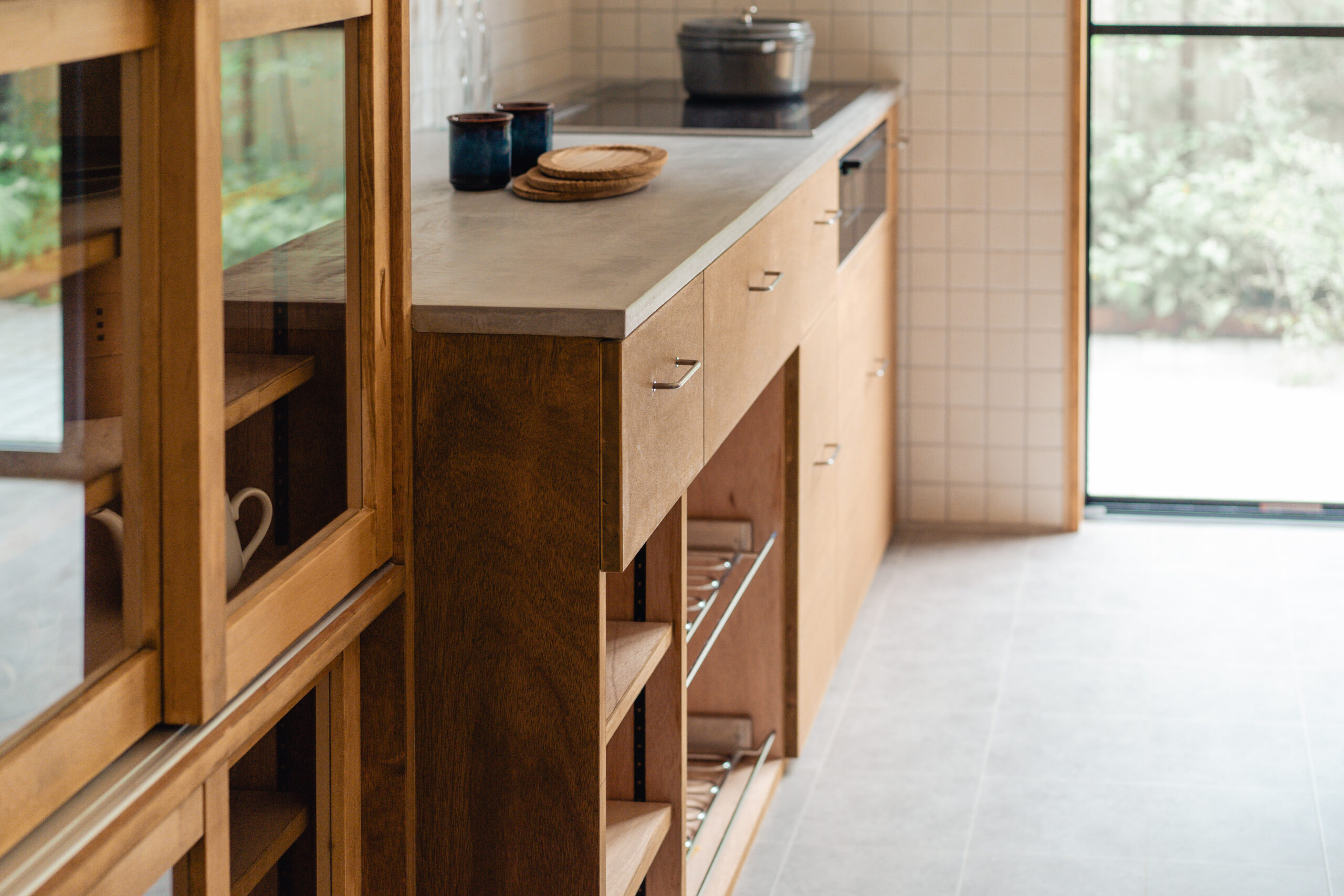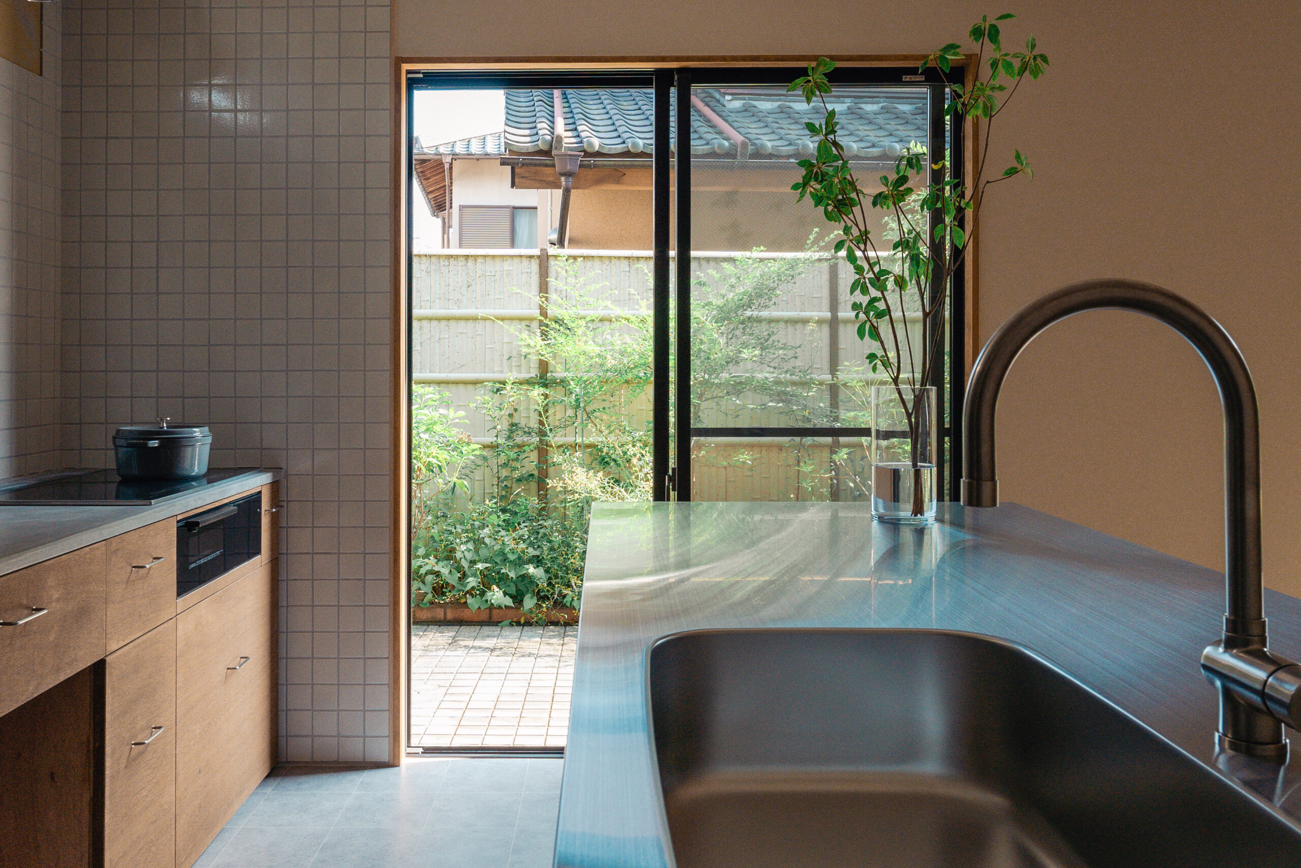 キッチン(食洗機付き)と食器棚は共に造作、Ⅱ型キッチンとし天板の片方はモールテックス、もう一方はステンレス。温かみのあるスタイリッシュなキッチンとなりました。キッチンからはLDKと庭が両方見渡せ、お子様の様子を見ながら家事をすることができます。