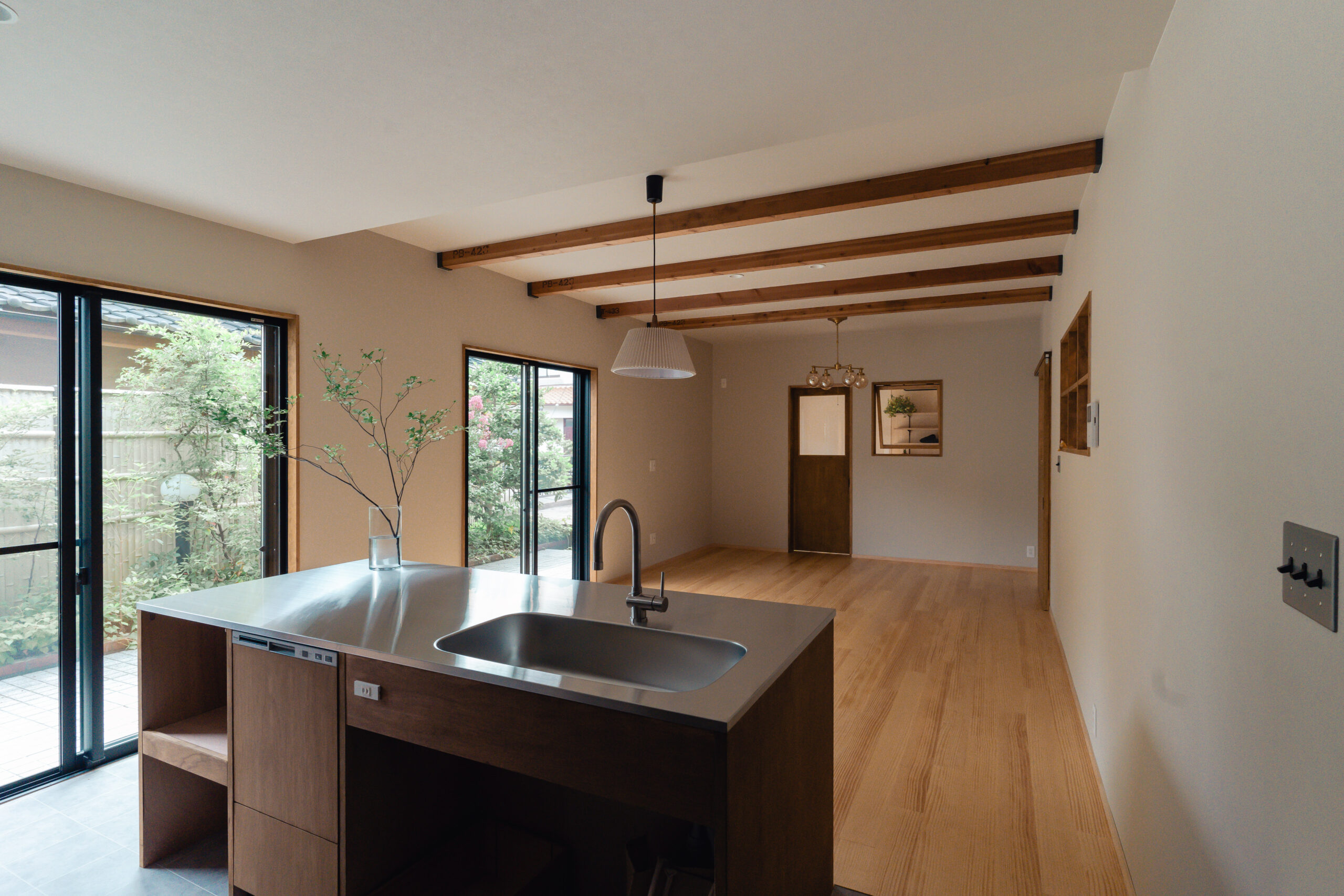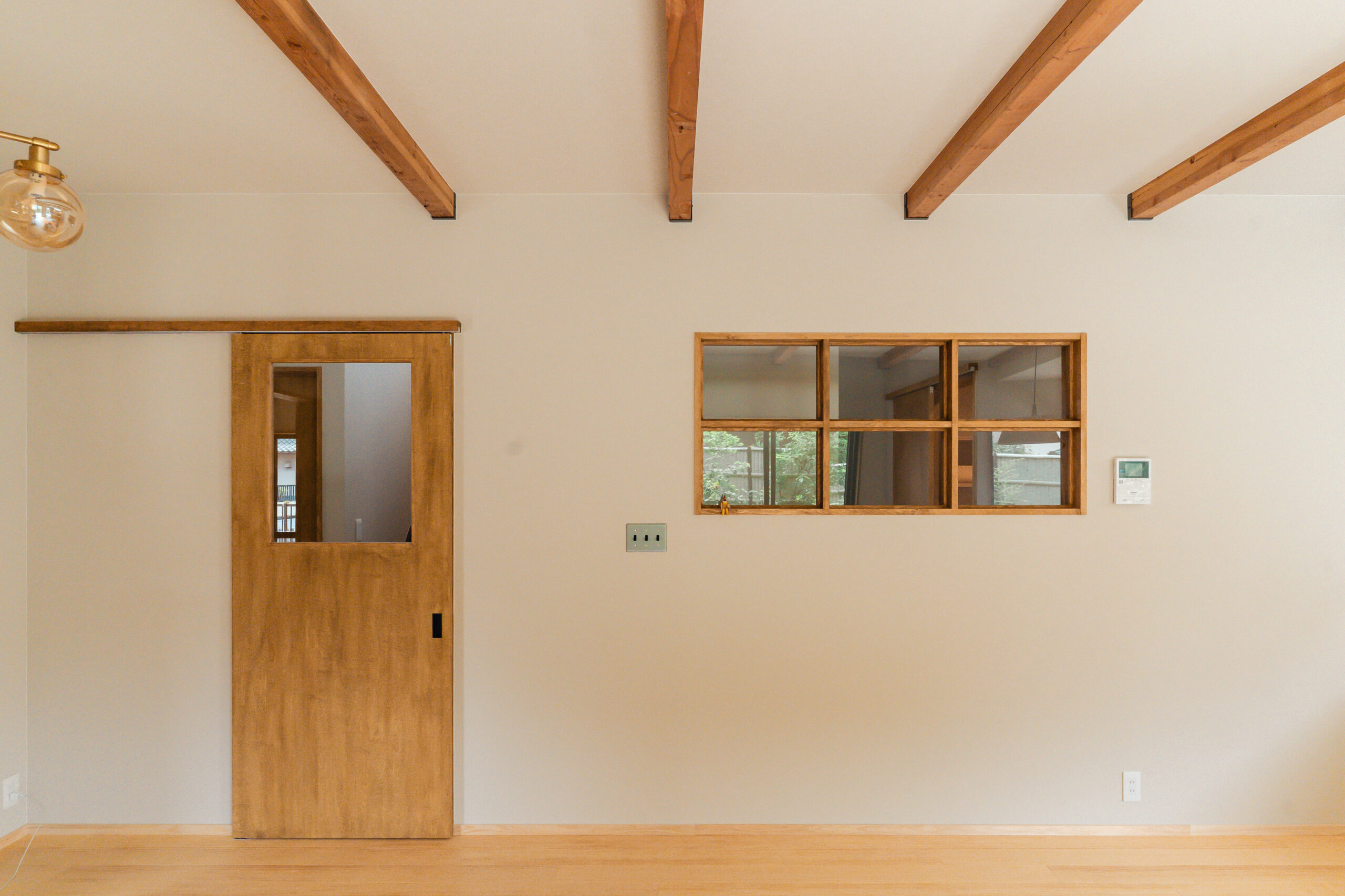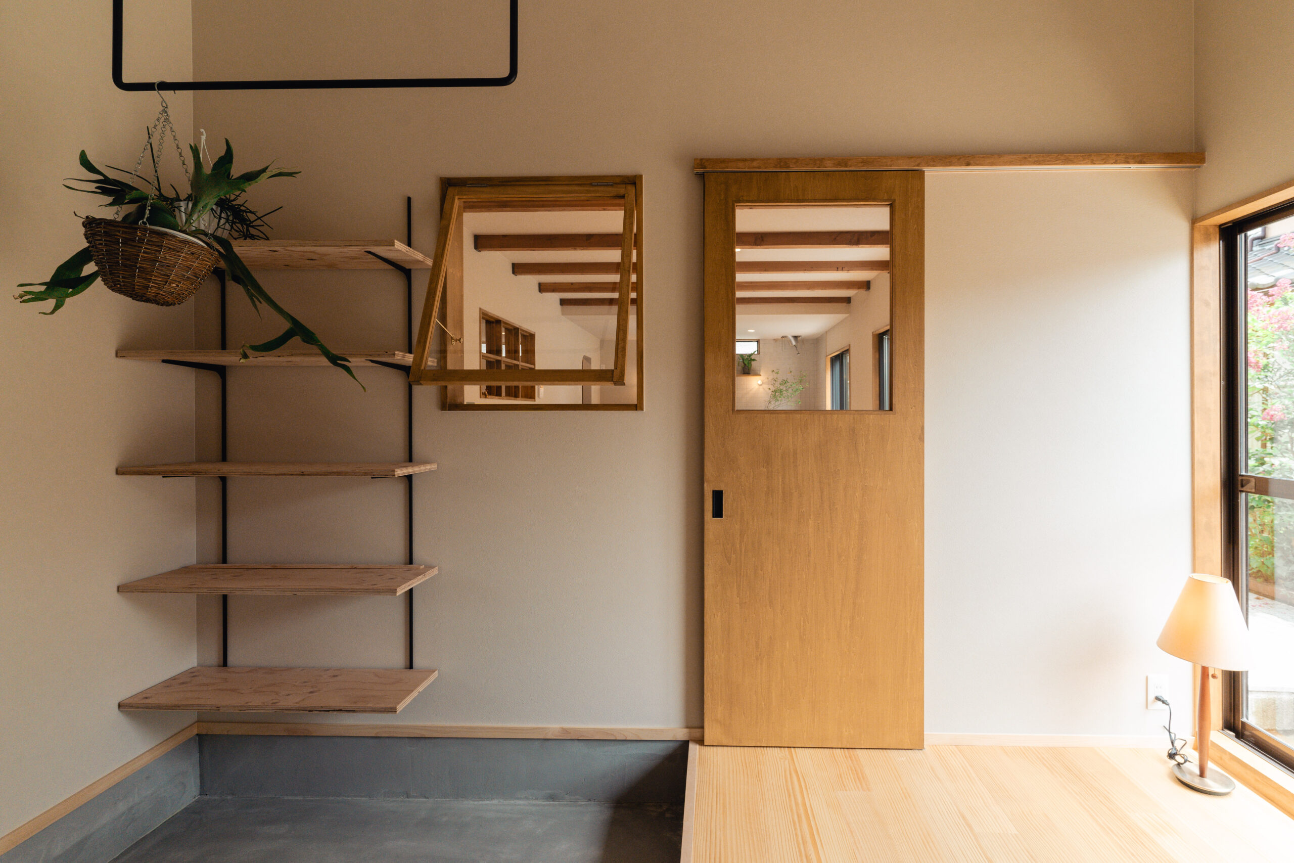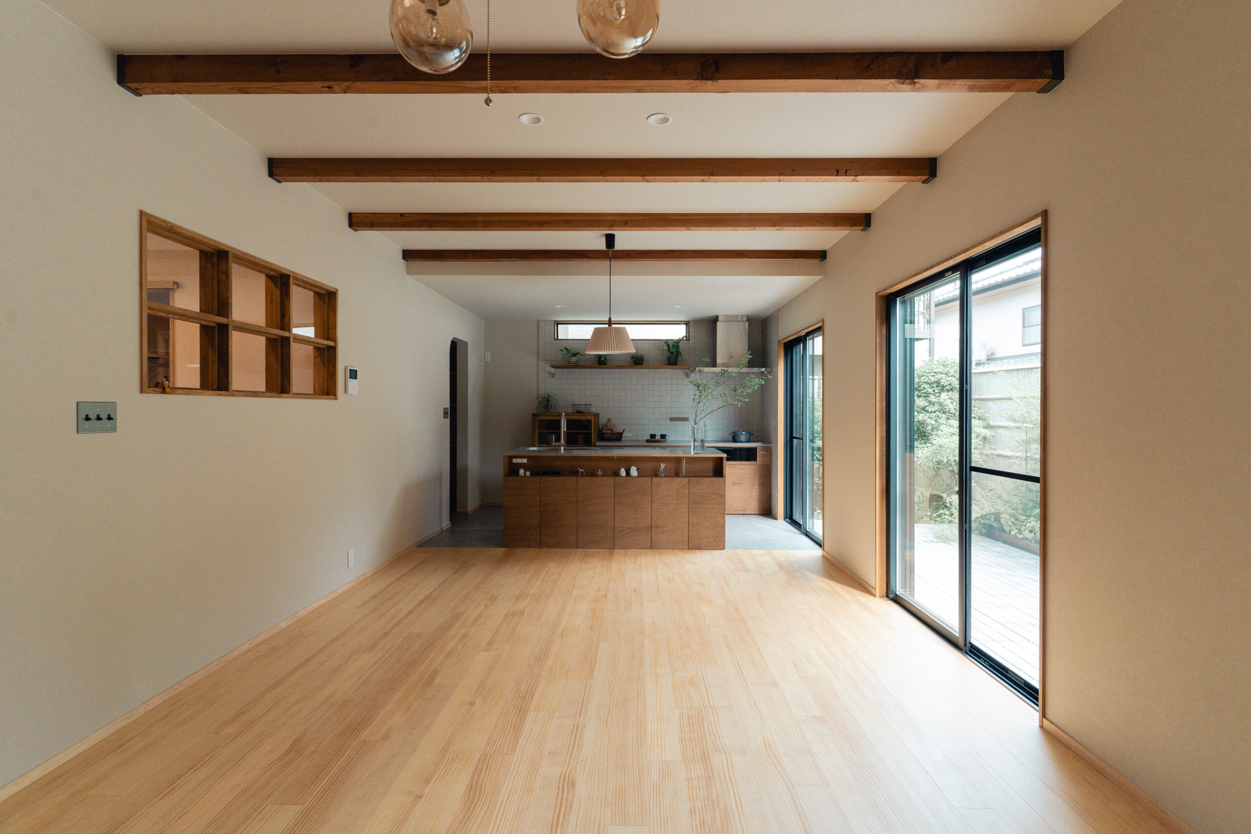LDKにも大きな掃き出し窓が2箇所あり、庭と繋がっています。大きな窓を開けるととても気持ちのいい風が入り、庭の緑から季節の移ろいを感じます。テレビやスマホから少し離れて眺めるにはとても心地いいLDKとなりました。また室内窓も2つ設けることで、それぞれの空間をゆるく繋げています。