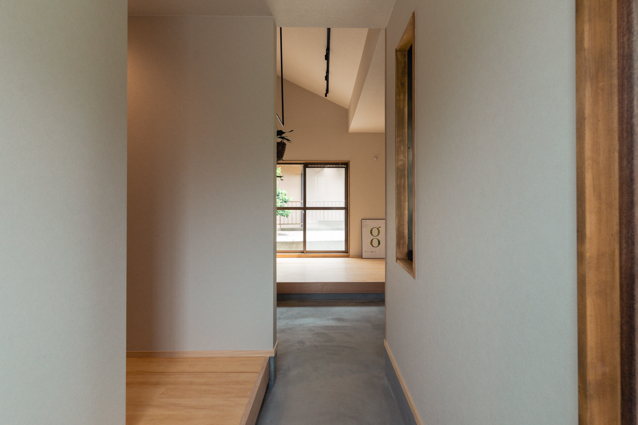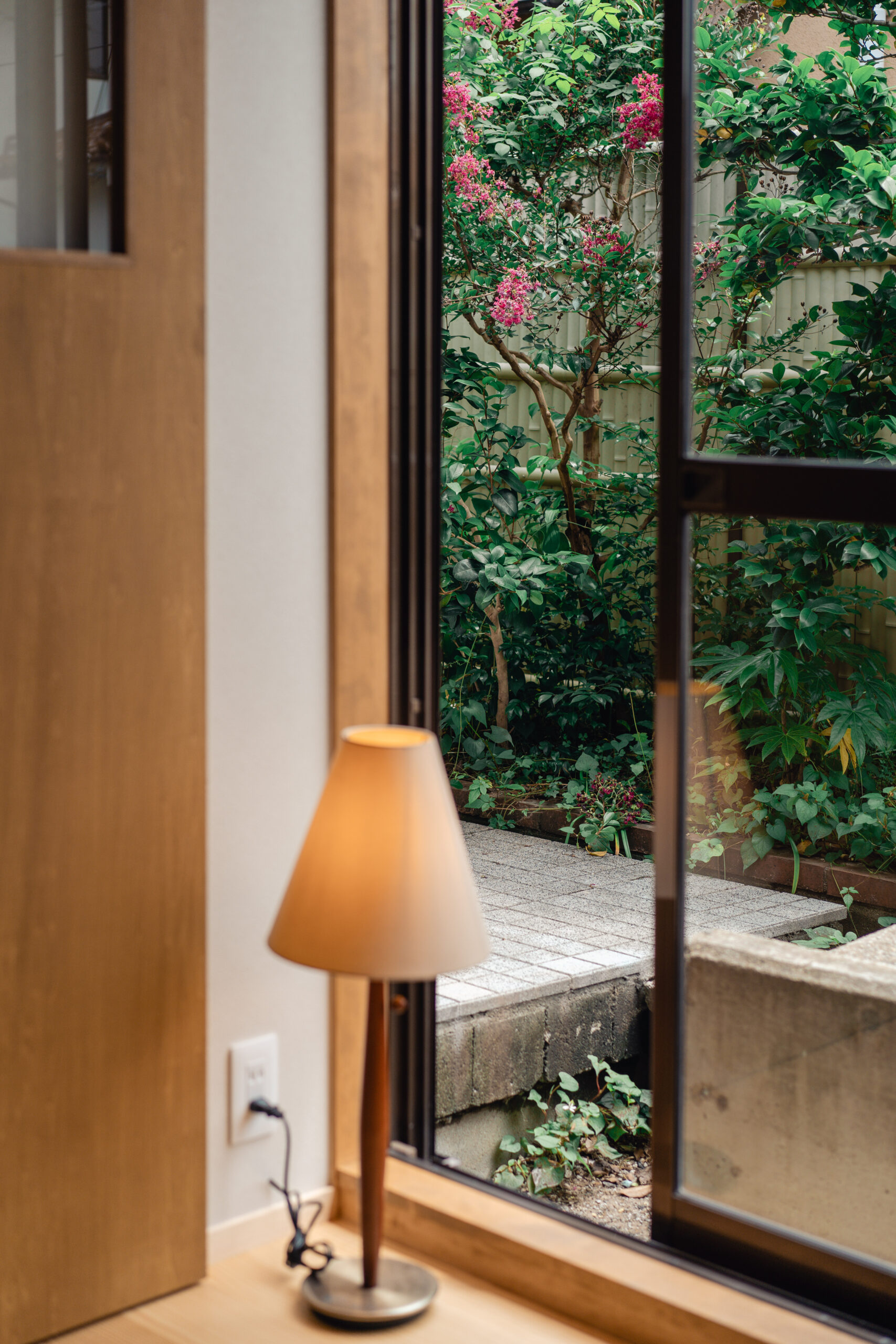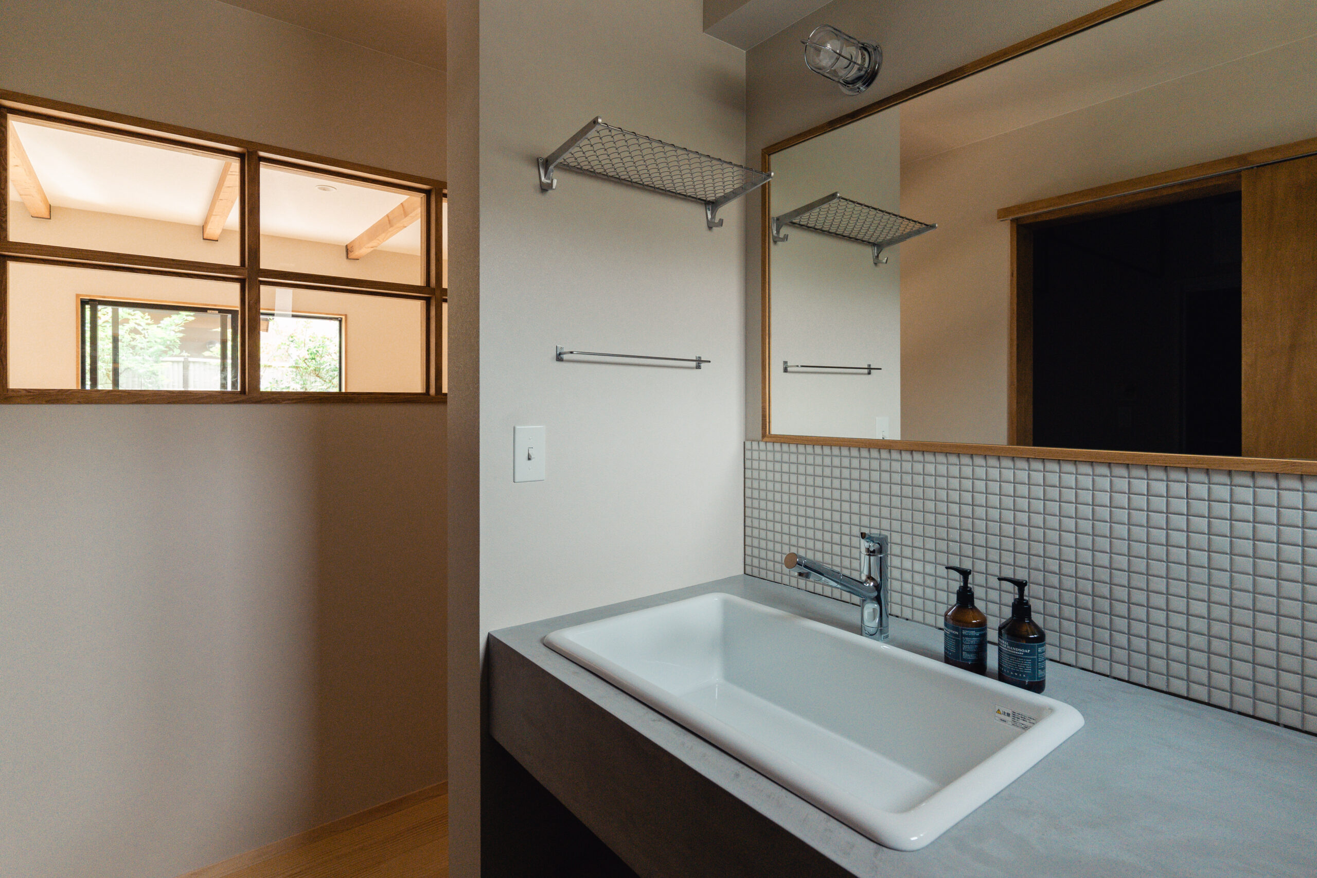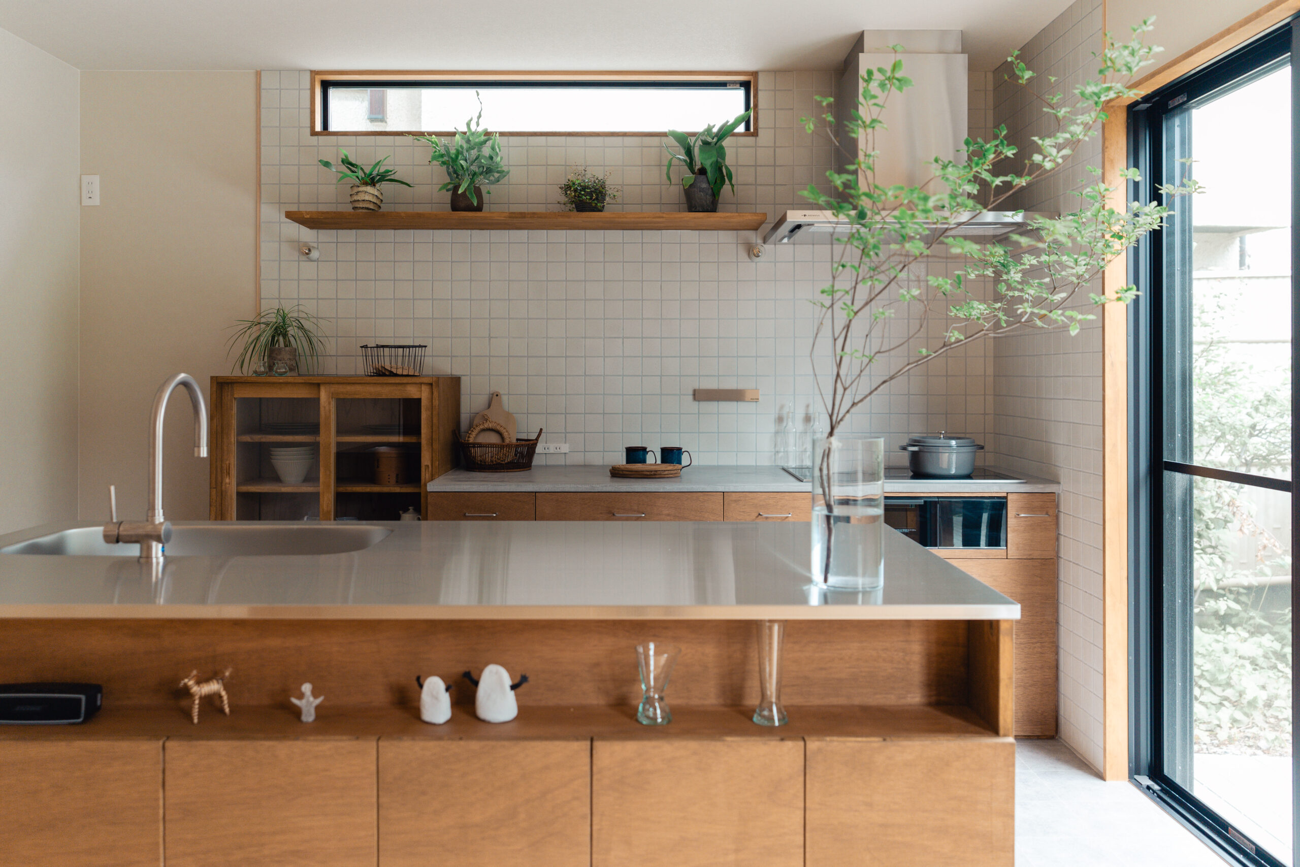 LDKにも大きな掃き出し窓が2箇所あり、庭と繋がっています。大きな窓を開けるととても気持ちのいい風が入り、庭の緑から季節の移ろいを感じます。テレビやスマホから少し離れて眺めるにはとても心地いいLDKとなりました。また室内窓も2つ設けることで、それぞれの空間をゆるく繋げています。