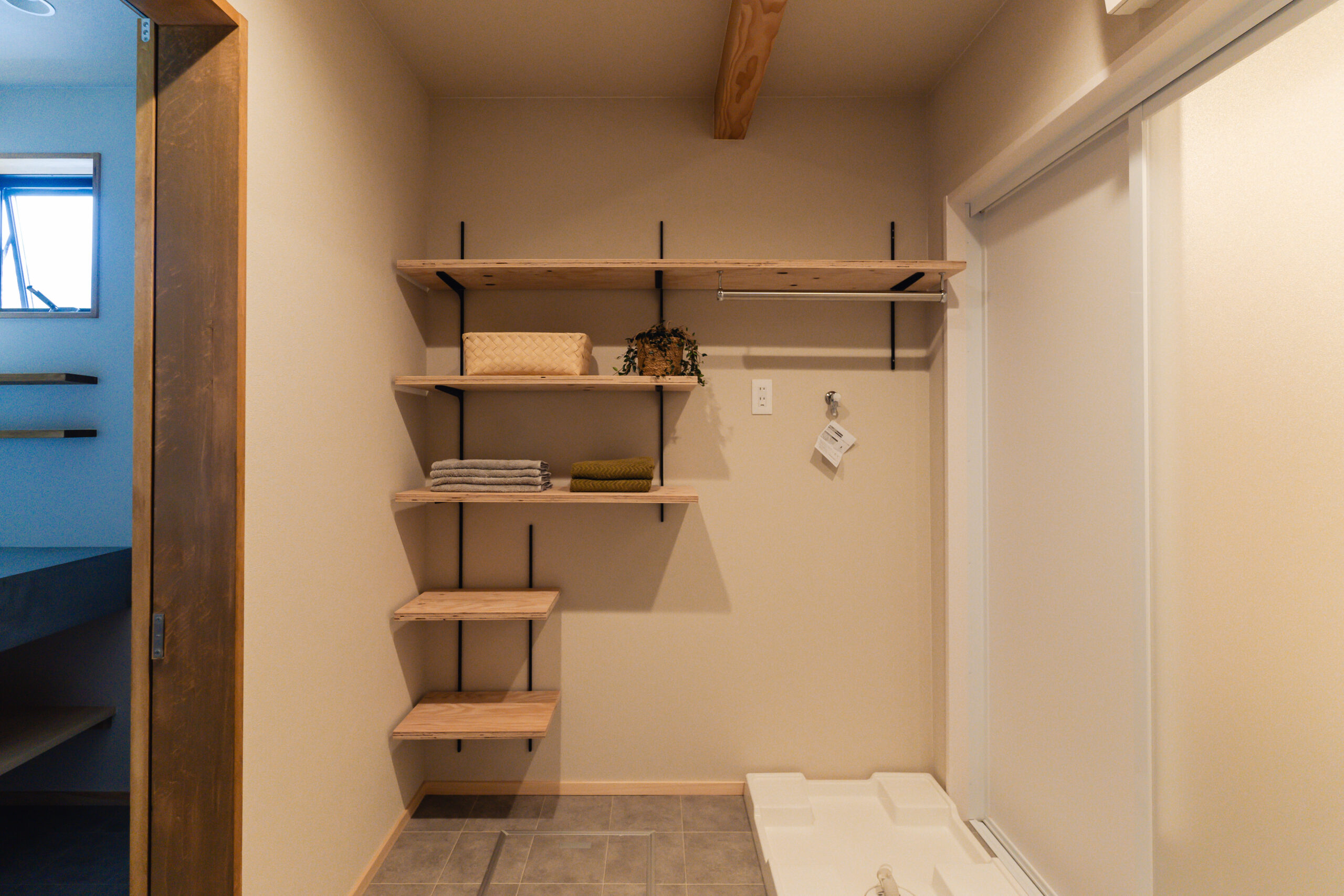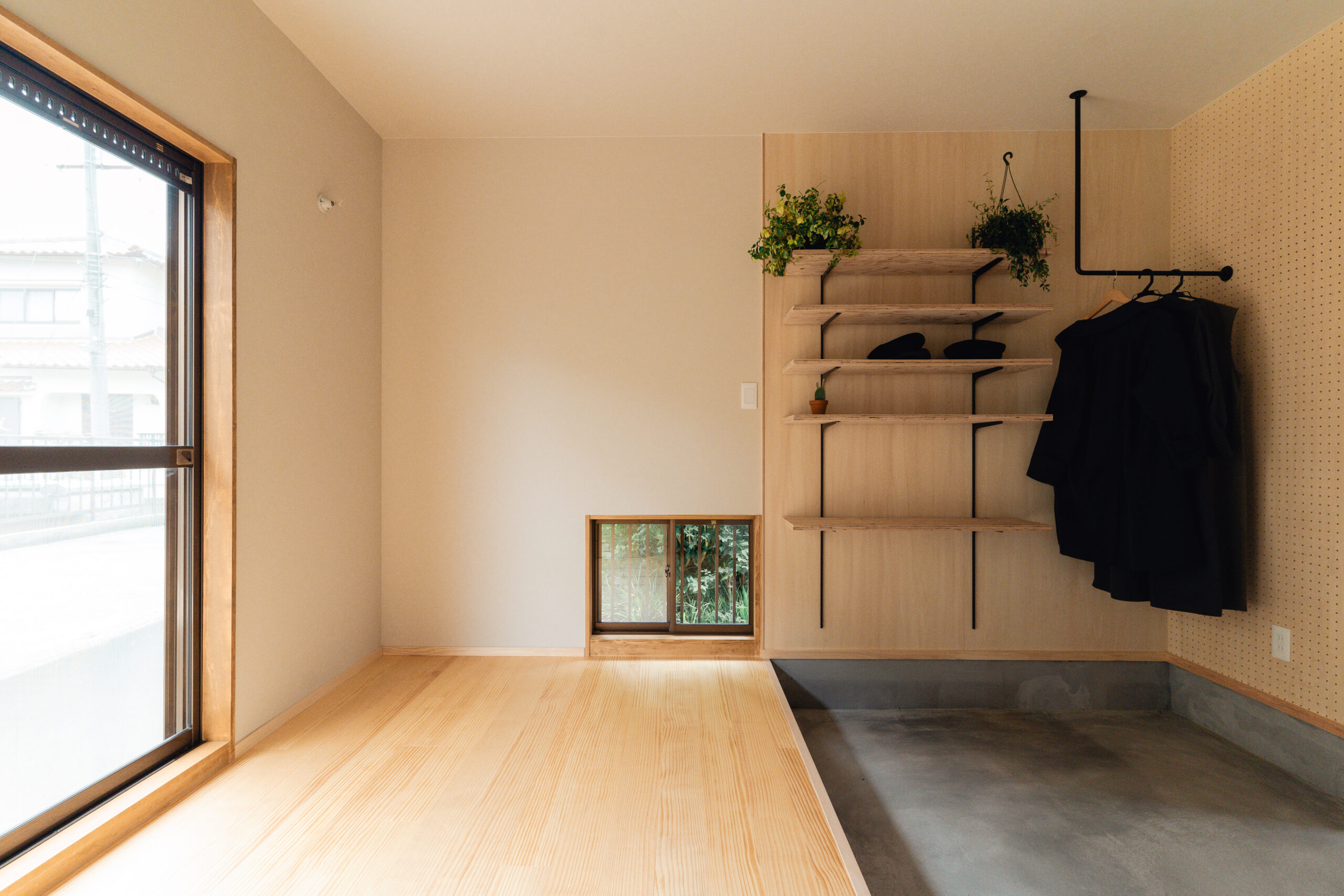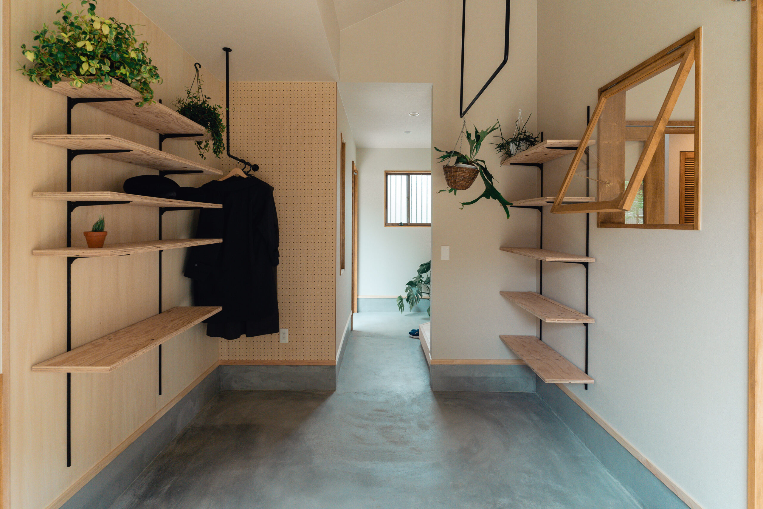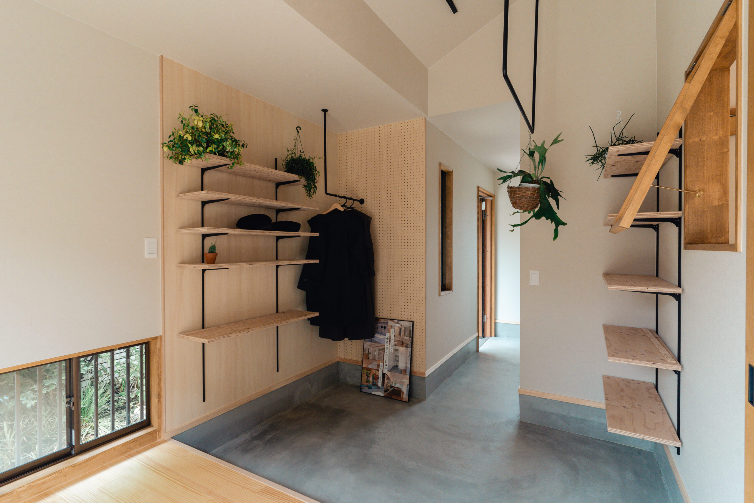 玄関は回遊できる間取りとし、出入り口は2つ。出かける際の洋服や小物、趣味のキャンプ道具、お子様のグッズなどは玄関に収納できるようにしたいというご要望のため、アイアンバーや有孔ボード、棚等の設置でたくさん収納ができるスペースを確保しました。また窓際の光と風がよく入るスペースは、カメラマンの奥様が撮影の場として、旦那様がDIYの場として使用するなど多目的に活用できる場をつくりました。