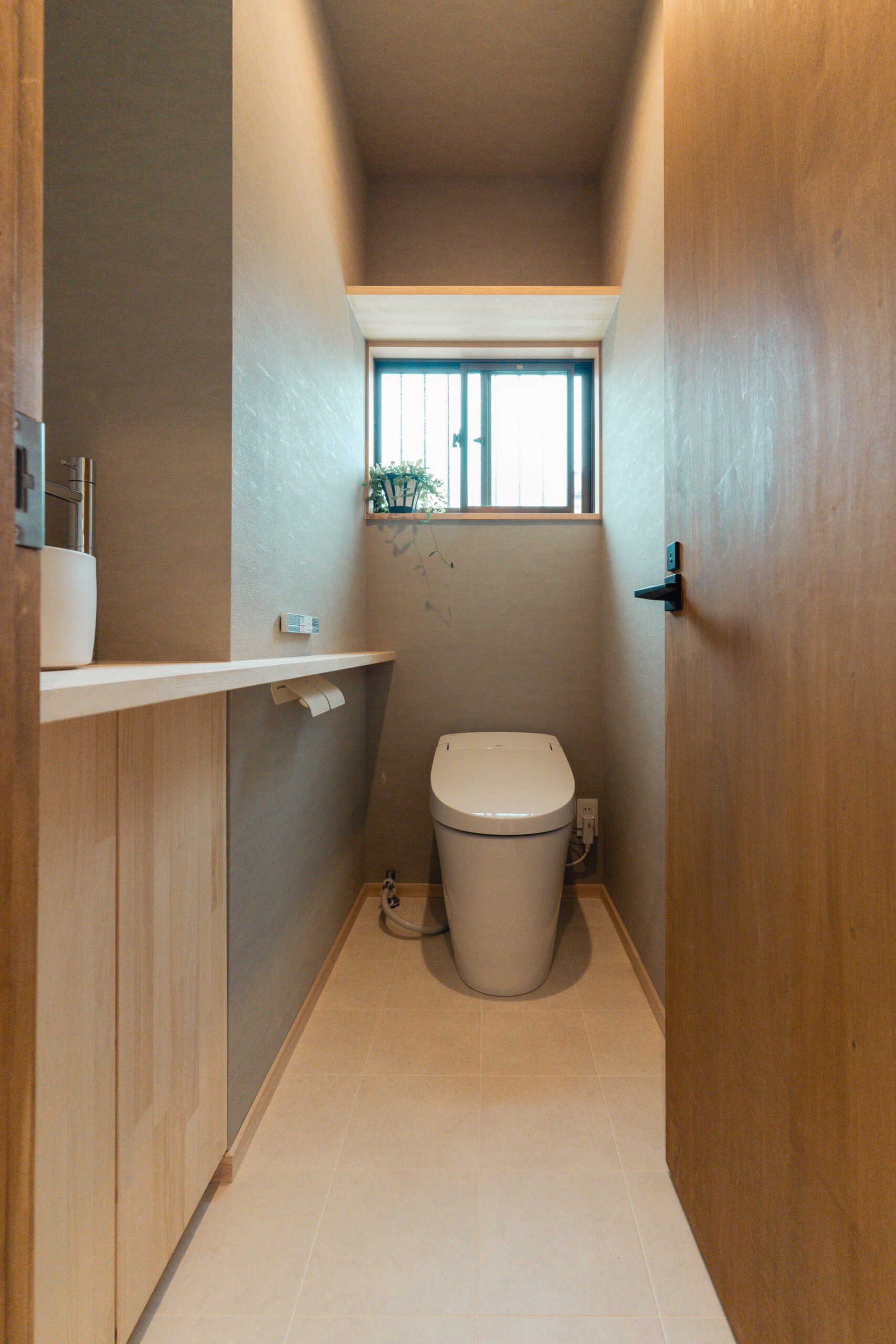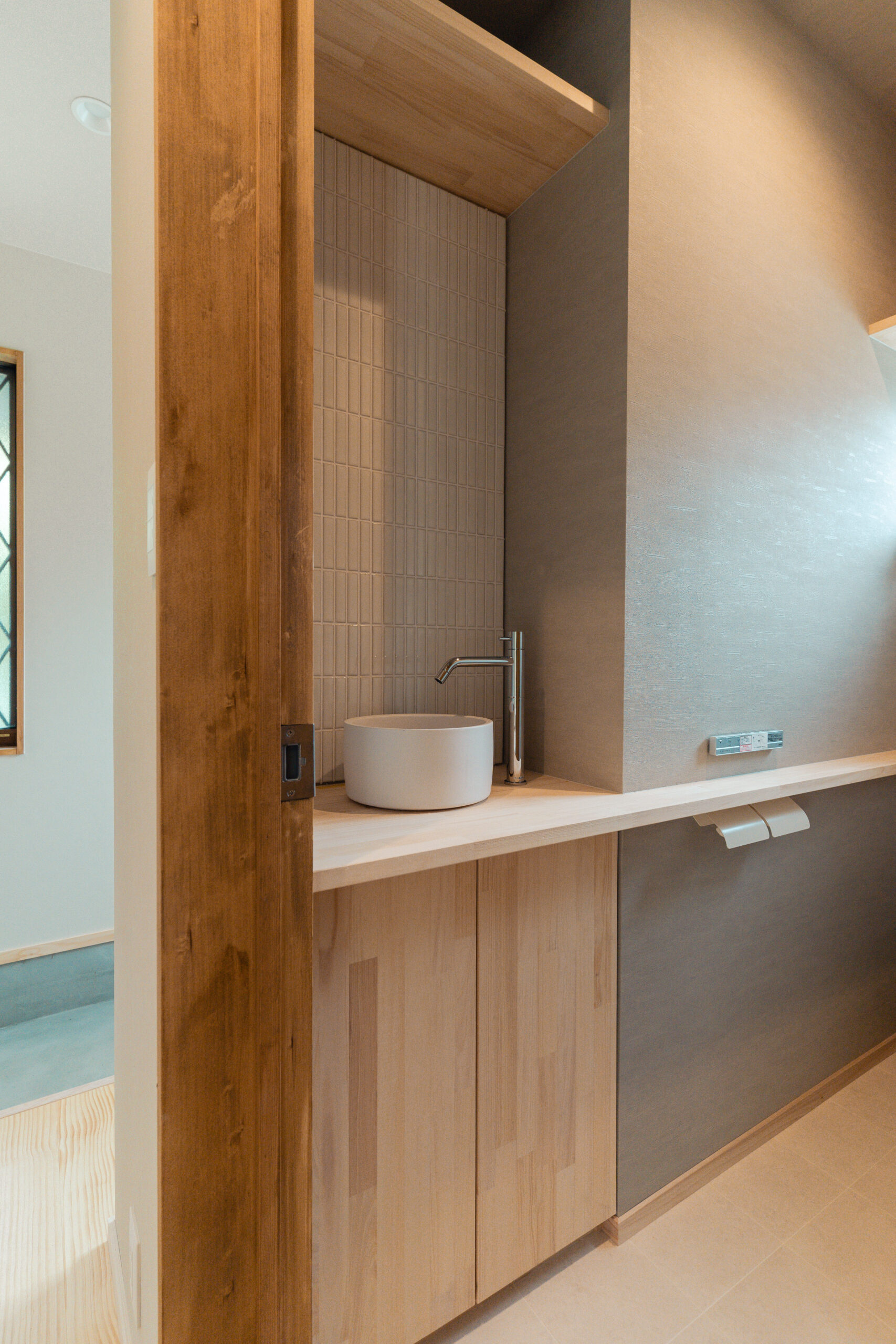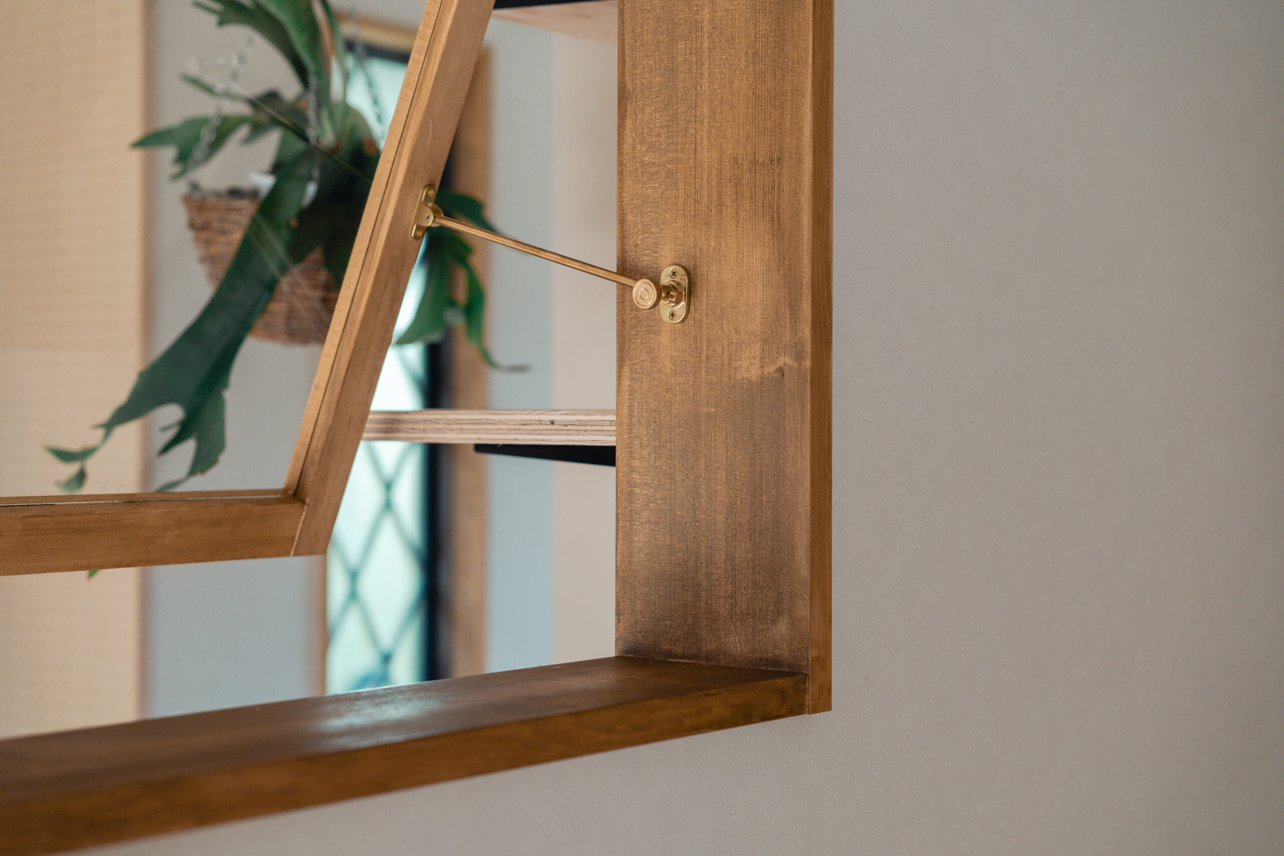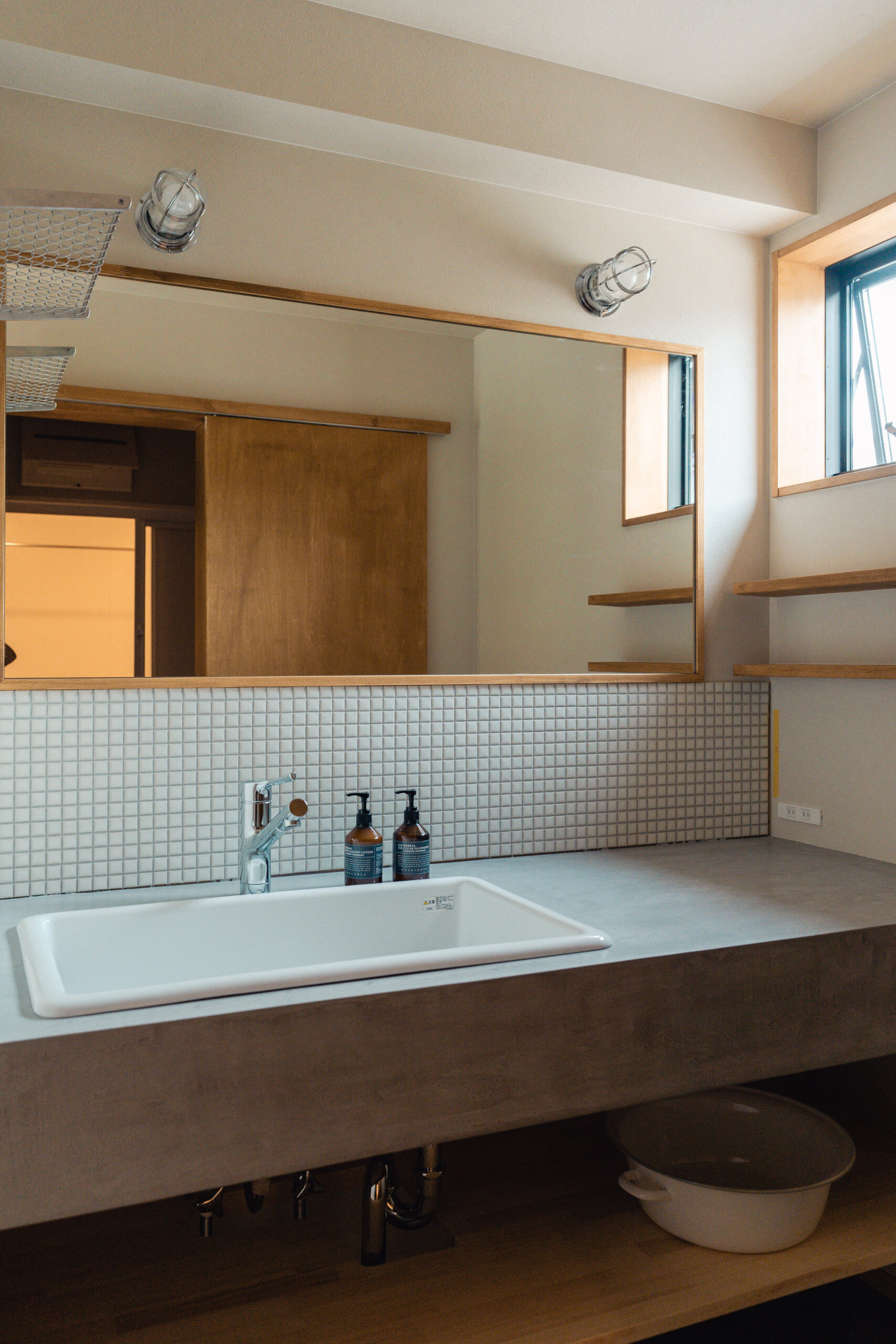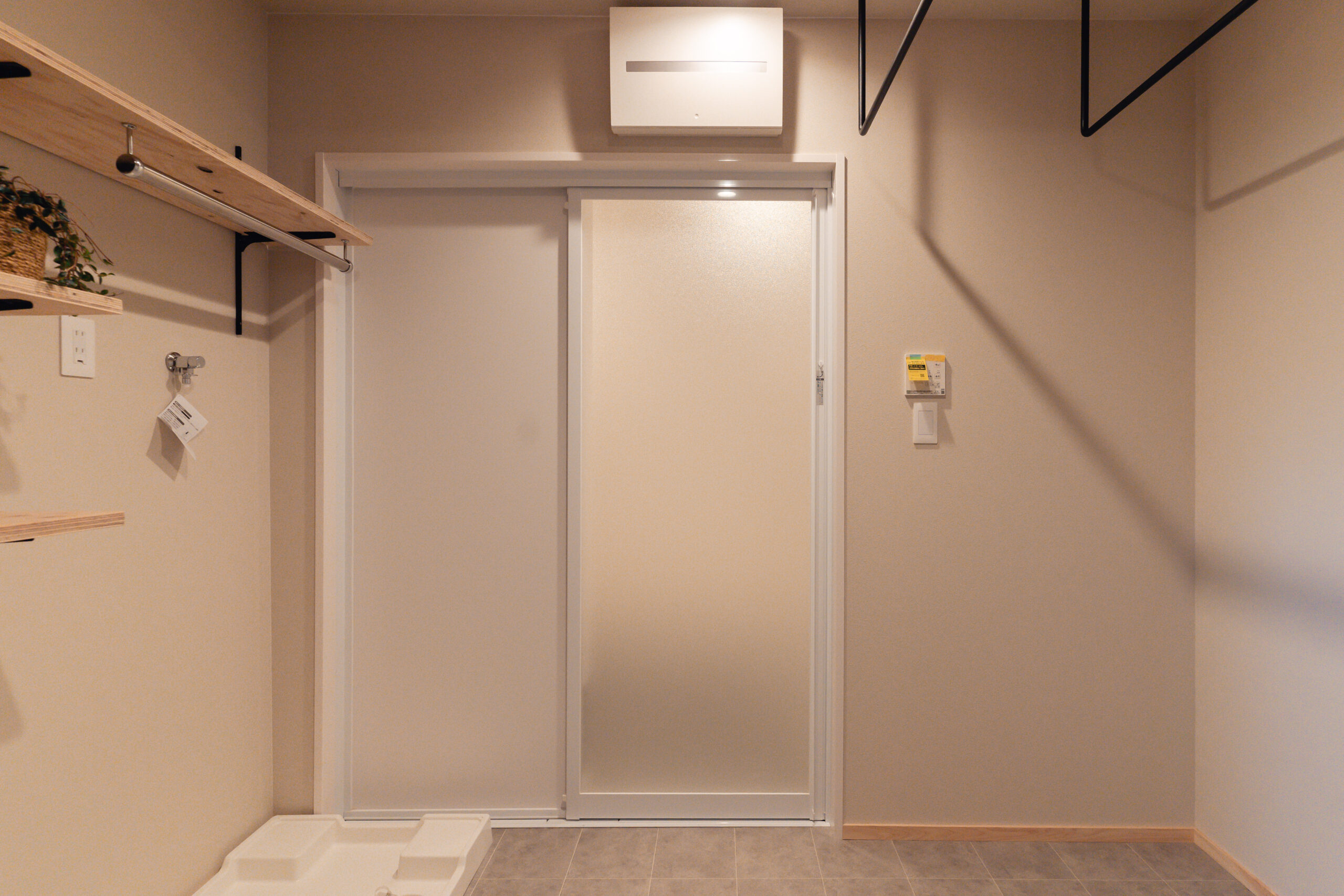 玄関は回遊できる間取りとし、出入り口は2つ。出かける際の洋服や小物、趣味のキャンプ道具、お子様のグッズなどは玄関に収納できるようにしたいというご要望のため、アイアンバーや有孔ボード、棚等の設置でたくさん収納ができるスペースを確保しました。また窓際の光と風がよく入るスペースは、カメラマンの奥様が撮影の場として、旦那様がDIYの場として使用するなど多目的に活用できる場をつくりました。