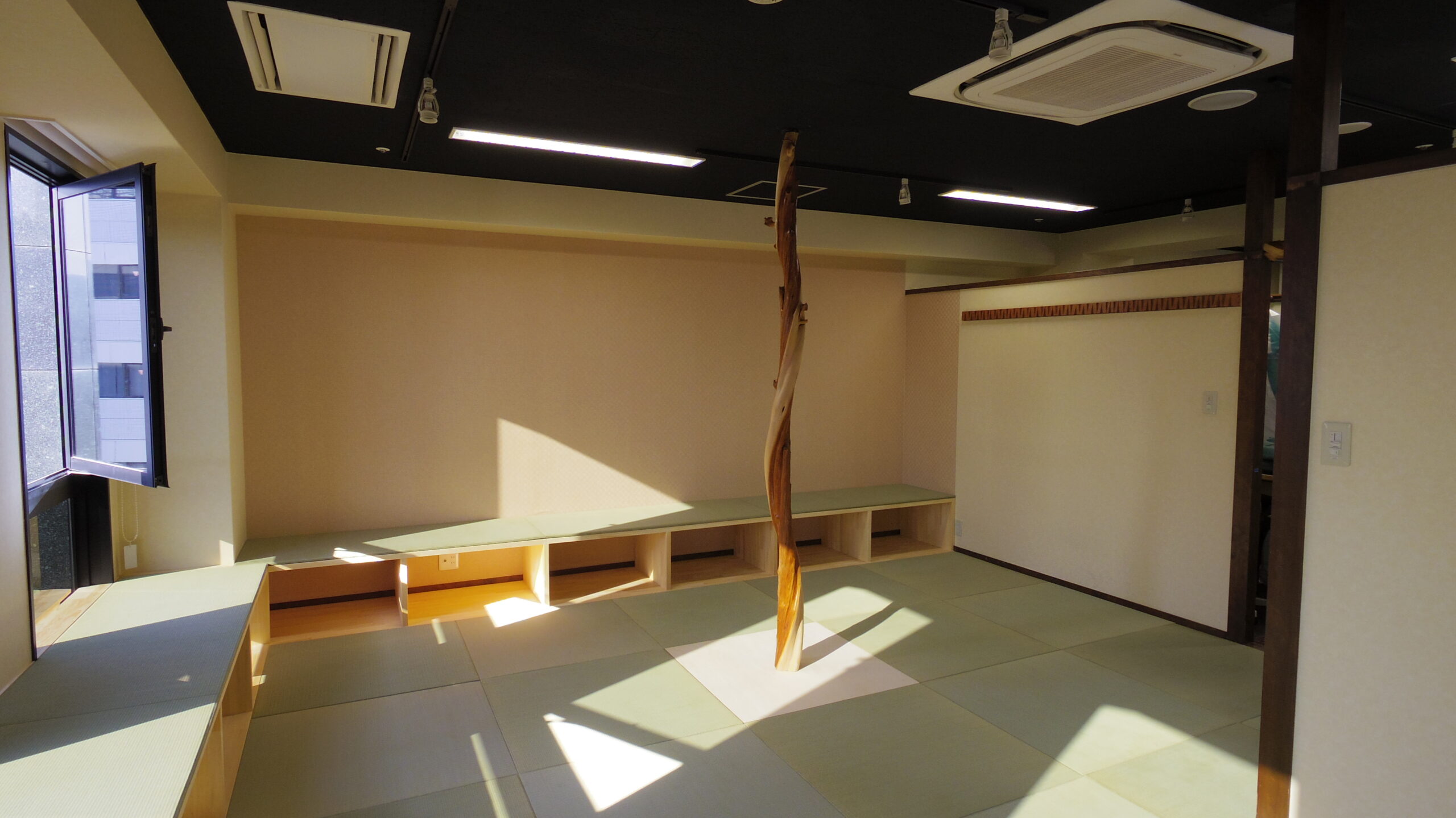 マッサージメンテナンス専門店『グーエンスの森』。お客様がリラックスして心地いい空間になるよう温かみのある畳を敷き詰め、中央周辺にはムロの木のシンボルツリーを設置しました。たくさんの方が集まって寛いで頂けたらなと思います。